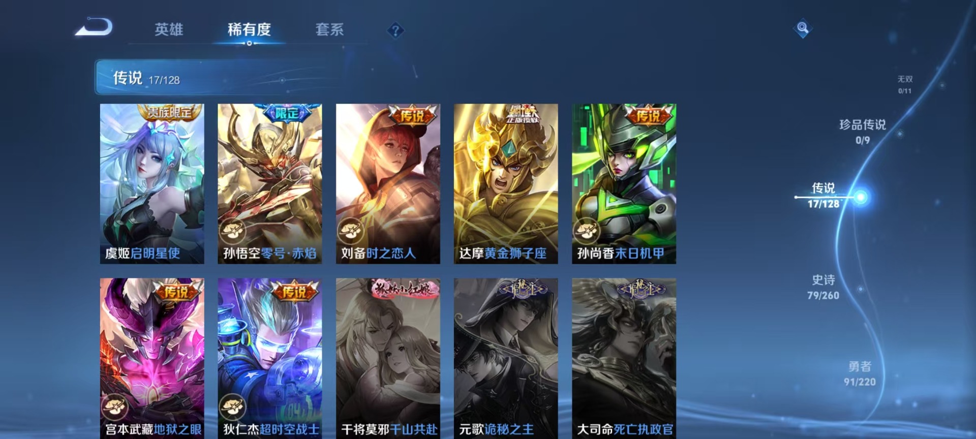 - [11818092]V7 7传说 104英雄 106皮肤 可修改实名 优质装备:久胜战神,末日机甲-孙尚香(绿蚂蚱),地狱火,仲夏夜之梦(大飞蛾),地狱之眼 限定皮:凤求凰(白切鸡),飞衡(韩信年限),梁祝,岱宗(典韦年限),李小龙,永曜之星,辉光之辰 史诗皮:石田雨龙,紫霞仙子,苍穹之光,电玩小子(小书包),白龙吟,黄金分割率,特工魅影,猫狗日记-孙策,节奏热浪,心灵骇客,暗隐猎兽者,缤纷独角兽,乘风破浪,逐浪之夏,水晶猎龙者,曙光守护者,圣诞恋歌,鹰眼统帅,魅力维加斯,未来纪元-赵云