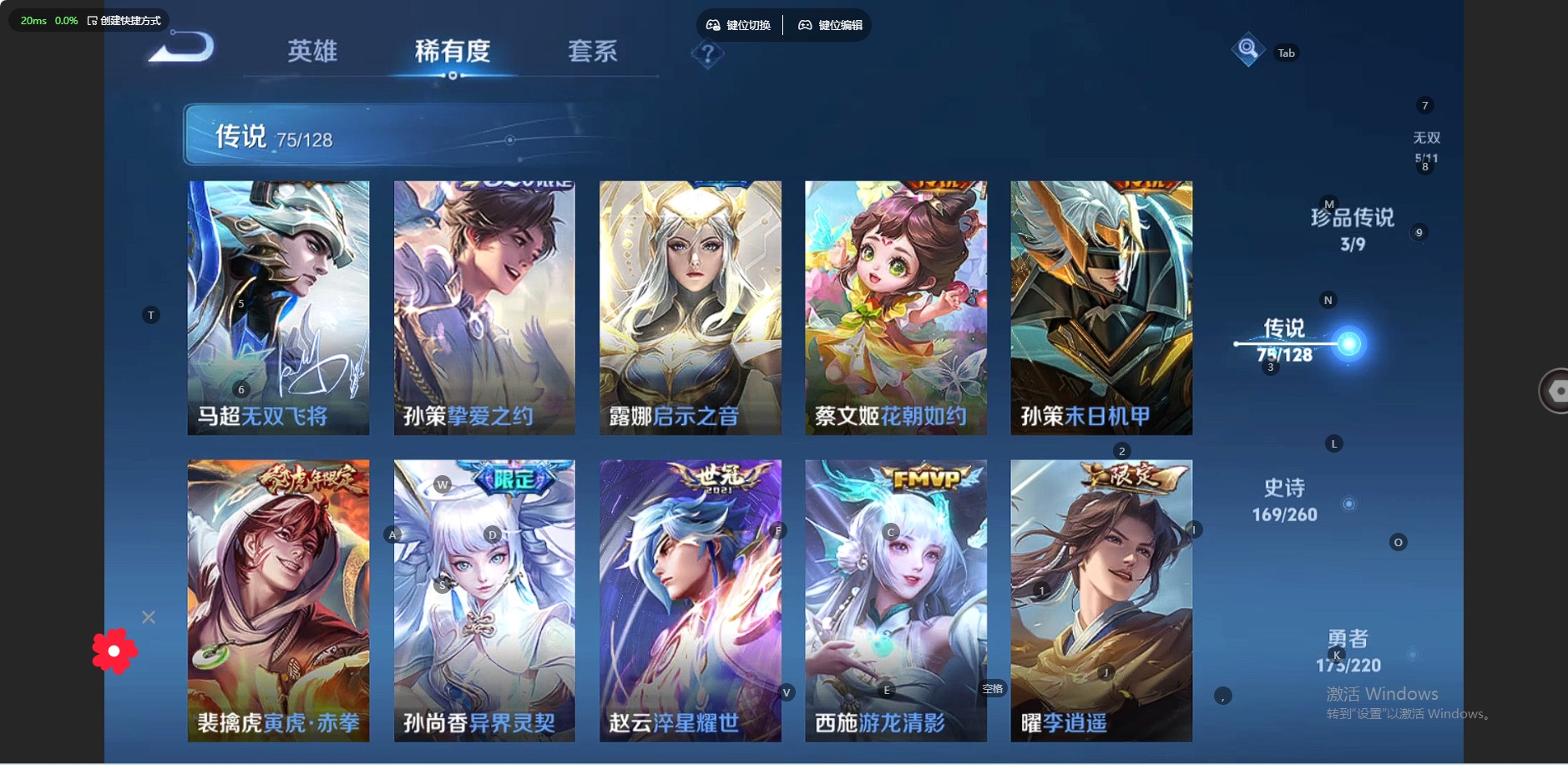 - PX_2096219-82 安卓QQ/永恒钻石/309皮肤/124英雄/5典藏/0珍品无双/1无双/3珍品传说/18传说/89史诗/9稀有英雄 【3 珍品传说】怪盗基德 马可波罗,器灵·落星盏 嫦娥,江户川柯南 鲁班七号, 【5 典藏皮肤】鸣剑·曳影 李白,全息碎影 孙悟空,杀手不太冷 孙尚香,弑枪猎影 韩信,无限飓风号 夏侯惇, 【1 无双皮肤】碎月剑心 李白, 【18 传说皮肤】武圣 关羽,启