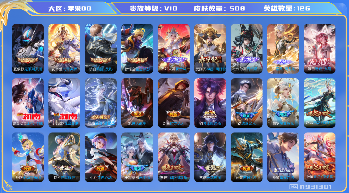 [11931301]V10 4典藏 5无双 3珍品传说 75传说 126英雄 508皮肤 典藏英雄武则天 可修改实名 优质装备:无限飓风号(高达),鸣剑·曳影,全息碎影(猴子典藏),九霄神辉(木兰典藏),神器·明辉仪,青丘·九尾(妲己无双),花合斗,离恨烟(公孙离无双),器灵·螭龙剑,江户川柯南,怪盗基德,器灵·落星盏,黄金狮子座,冠军飞将,云鹰飞将(小将军),绛天战甲(鸡嘴战神),炽阳神光,一念神魔,云霓雀翎,末日机甲-孙尚香(绿蚂蚱),地狱火,仲夏夜之梦(大飞蛾),音你心动-小乔,零号·赤焰,地狱之眼,李逍遥,时之恋人-刘备(电焊工),游龙清影(小青龙),淬星耀世,超时空战士-狄仁杰,末日机甲-孙策,花朝如约(花篮子),挚爱之约,无双飞将,神器·狴犴令,神器·明辉仪,山海·炽霜斩(李信年限),山海·苍雷引(电光曜子),炽翼辉光(娃娃菜牛角包),画中仙,浮生妄,青丘·九尾,鹤羽星尊,妄想实况,惊梅引,遇见神鼓,小动物乐团,霜月吟,澜逐花归海,艾琳觅芳踪,琥珀纪元铠,琥珀纪元马超,黄金天蝎座,云中君群星魔术团,朵莉亚心动手记,牧神诗旅,涂山容容 传说皮:乘龙·问璇玑(孙尚香年限),乘龙·铭钟鼎(赵云年限),乘龙·淬吴钩(孙策年限),铠冥王哈迪斯,幻光神枪 珍宝阁皮:万物之道,优雅恋人,玩趣恶龙 限定皮:愿照·九州拓(澜年限),愿照·福禄聚(蔡文姬年限),愿照·岁时盈(虞姬年限),愿照·山河定(司空震年限),愿照·众生和(妲己年限),愿照·千秋盛(女娲年限),逐霄战戟,陌上桑,鸣野蒿,夏侯惇霜北刀,至尊宝,白虎志(电光耗子),凤求凰(白切鸡),梅西,武陵仙君(小桃花),异界灵契(白毛香),傲雪梅枪,白鹤梁神女,魔法小厨娘,白晶晶,时雨天司(水龙头),神威(电光马子),飞衡(韩信年限),无限倾心-项羽,瑞麟志(木兰年限),遇见飞天,高山流水,诗剑行,无限倾心-虞姬,齐天大圣,怒海麟威,五谷丰年,青龙志(铠年限),冰锋战神,武圣,天狼运算者,梁祝,御风骁将(吕布年限),龙胆,逐梦之星,岱宗(典韦年限),天狼溯光者,虎魄,奔雷神使(牛魔年限),祈雪灵祝(雪兔子),李小龙,逐梦之影,玄武志(苏烈年限),朱雀志(守约年限),永曜之星,辉光之辰,霸王别姬-项羽,霸王别姬-虞姬,默契交锋-兰陵王,默契交锋-花木兰,孙行者,猪悟能,一生所爱,大圣娶亲,引擎之心,天魔缭乱,冰霜恋舞曲,寅虎·御盾(廉
