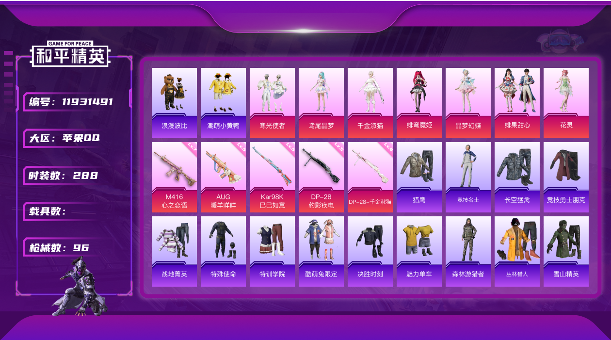 [11931491]7粉装 5特效枪 9印记 可二次 可修改实名 优质装备:M416心之恋语,七级M416-心之恋语,DP-28-千金淑猫,千金淑猫,晶梦幻蝶,AUG-暖羊咩咩,绯果甜心,绯穹魔姬,花灵,Kar98K-巳巳如意 热门装扮:寒光使者,鸢尾晶梦,潮萌小黄鸭,浪漫波比 稀有枪皮:DP-28-豹影疾电 五级特效枪:五级Kar98K-巳巳如意,五级DP-28-豹影疾电,五级AUG-暖羊咩咩 四级特效枪:四级DP-28-千金淑猫 紫色装扮:SS22特训,SS23特训,SS21特训,SS31特训套装,决胜时刻,北国孤狼,SS30特训套装,SS33特训套装,乐音,SS20特训,SS13特训,SS19特训,英勇保护者,粉团憨憨,豚鼠丹丹,甜心亚梦,虚音幻奏,SS18特训,酷萌兔限定,长空猛禽,雪山精英,霓虹街区,青涩年华,魅力单车,麻辣教官,龙魂突击队,幻世战舞者,战地菁英,破蛋小黄鸡,竞技勇士朋克,牛气满满,特殊使命,特训学院,猎鹰,白光莹,SS28特训,迎夏光舞,听雨铃兰,冰公主,玉兔迎春,巳巳如意,森林游猎者,海琴烟,都市丽猫,竞技名士,摩登魅猫,SS24特训(SS24特训套装),SS25特训,晶辉守护,精神漫游,五号元素,黑色刀锋,核芯基因,SS7特训,摇滚狂鲨,深蓝冒险家,迷域探索者,SS8特训,大橘大利,星渊小夜曲,小鸟芋圆,白虎圣者,纯白誓言,暗夜契约,晶灵使者,粉恋花,蓝冰羽,紫幽梦,SS32特训服(SS32特训套装),鲛海歌灵,丛林猎人,海上生明月,童话森林 优质战备:鸢尾晶梦降落伞,精灵梦叶罗丽降落伞,千金淑猫降落伞,晶梦幻蝶降落伞,幻海仙踪飞行器,绯果甜心降落伞,冷漠罗丽降落伞,绯果甜心飞行器,甜蜜誓约降落伞,飞行器-心之恋语(心之恋语飞行翼),四圣焕新降落伞