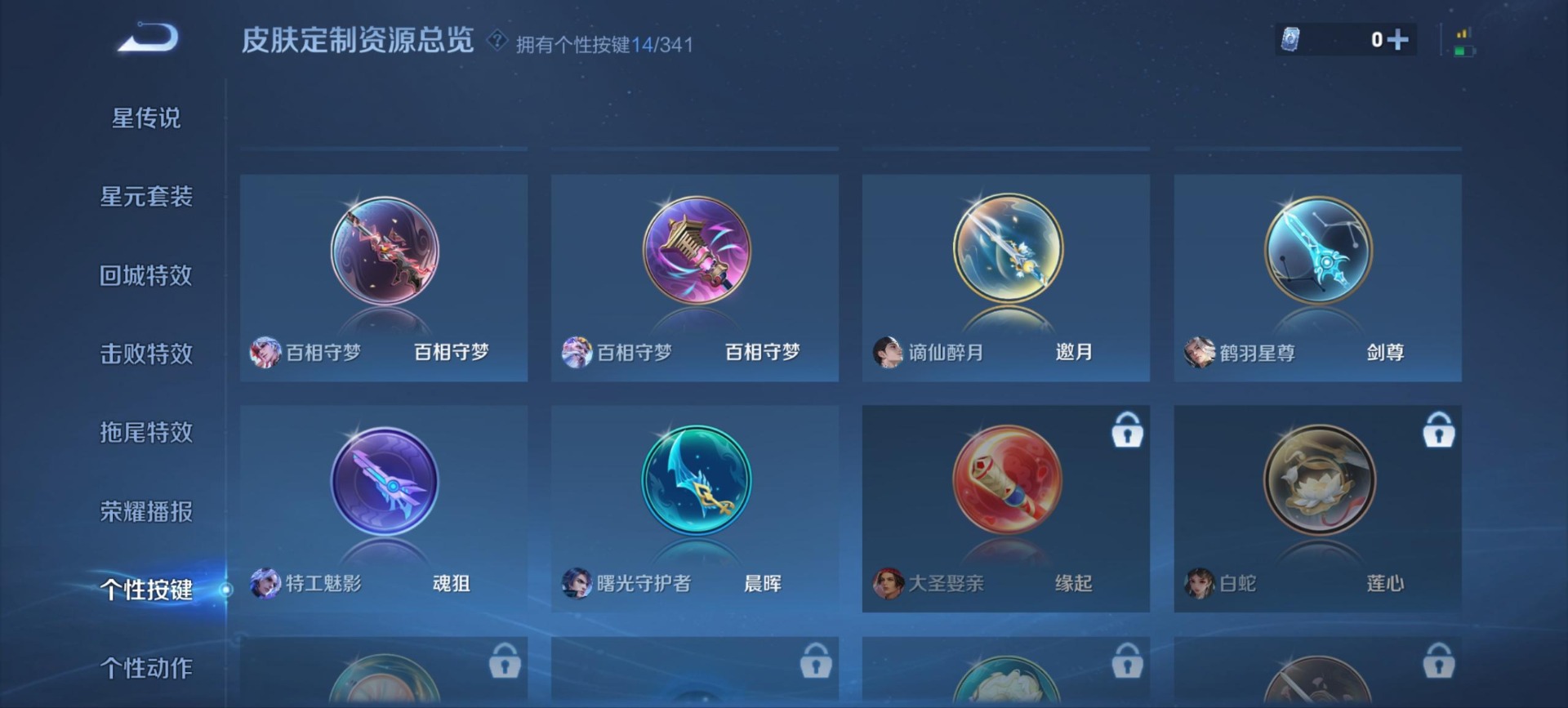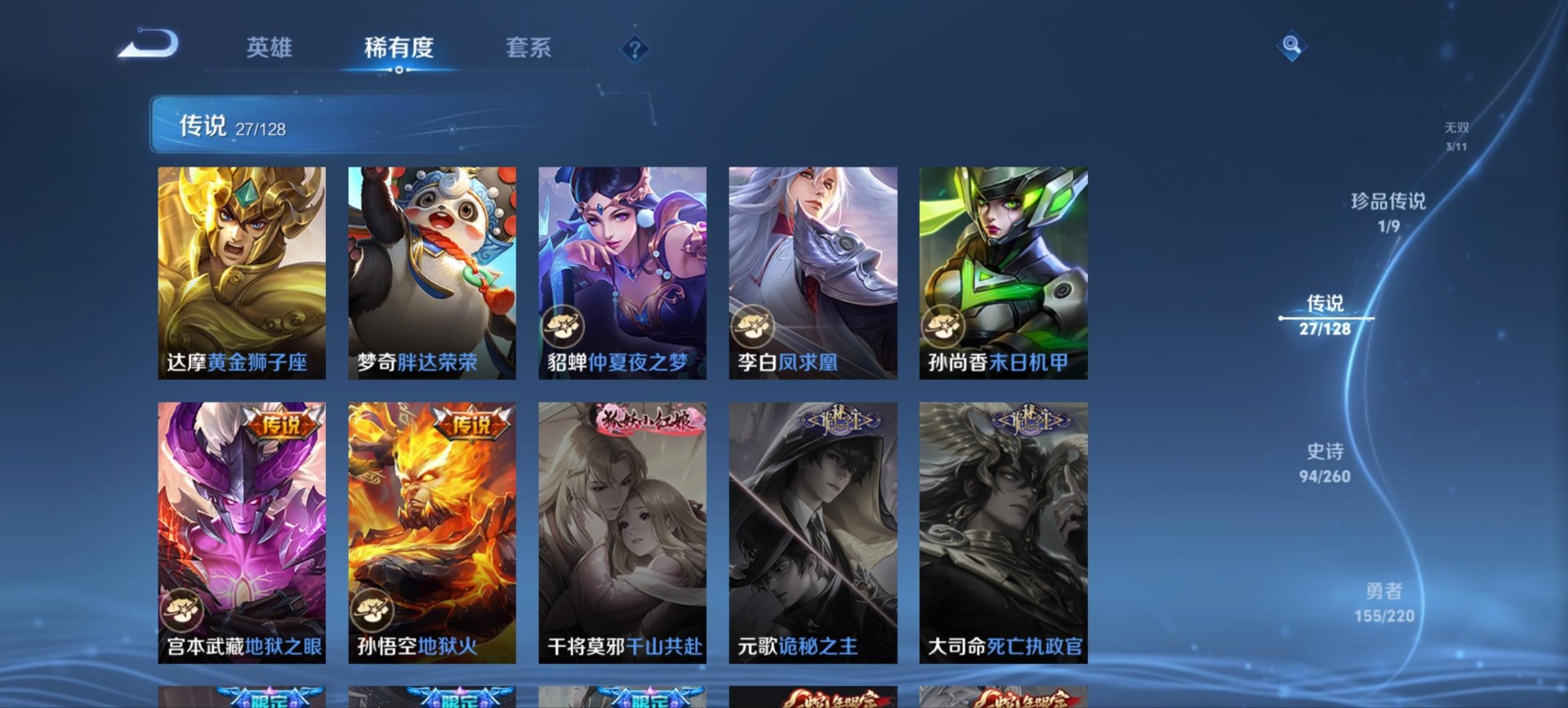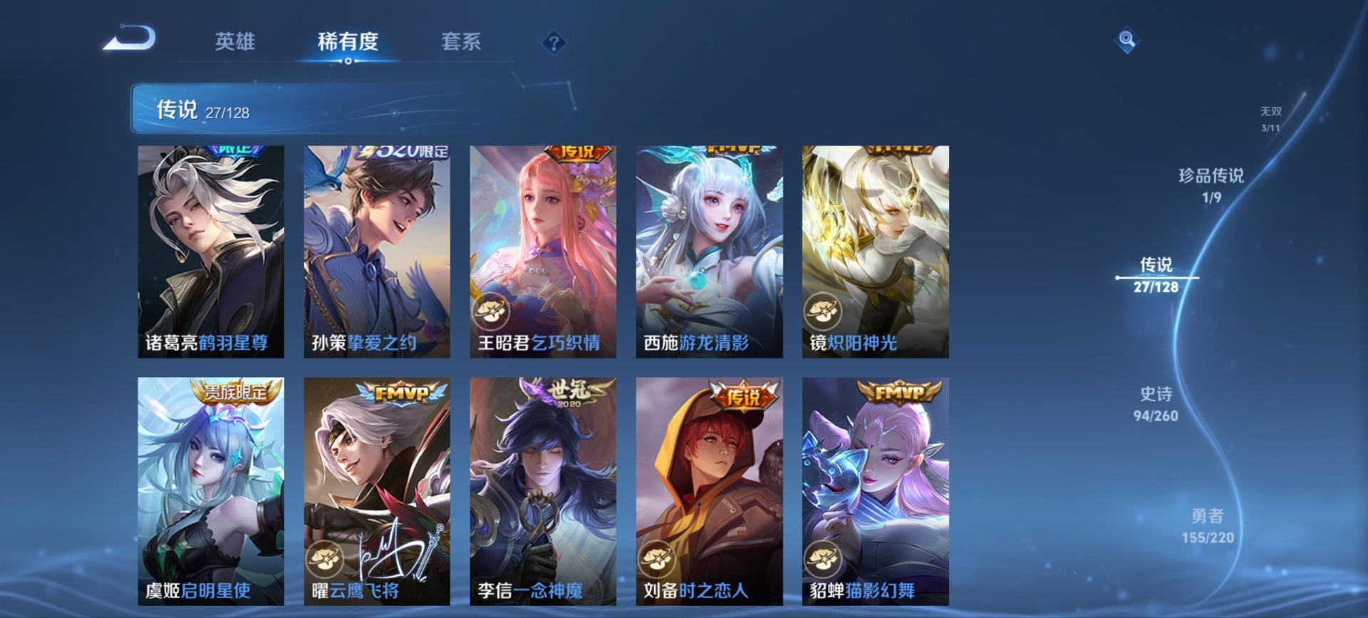 甄姬幽恒,后羿辉光之辰,裴擒虎李小龙,裴擒虎天狼狩猎者,上官婉儿梁祝,桑启鸣野蒿,孙悟空孙行者,孙悟空大圣娶亲,孙悟空至尊宝,孙悟空美猴王,马超神威,韩信傲雪梅枪,韩信飞衡,韩信逐梦之影