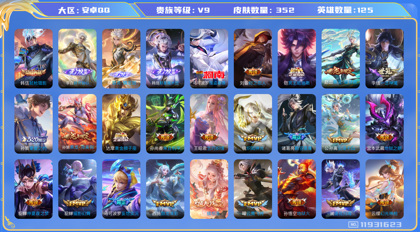 [11931623]V9 1典藏 3无双 1珍品传说 27传说 125英雄 352皮肤 可修改实名 优质装备:弑枪猎影(韩信典藏),碎月剑心(李白无双),韩信群星魔术团(韩信无双),器灵·螭龙剑,怪盗基德,黄金狮子座,云鹰飞将(小将军),猫影幻舞,炽阳神光,一念神魔,末日机甲-孙尚香(绿蚂蚱),地狱火,仲夏夜之梦(大飞蛾),地狱之眼,胖达荣荣,乞巧织情,时之恋人-刘备(电焊工),游龙清影(小青龙),挚爱之约,鹤羽星尊,妄想实况,鹤归松栖(云缨),澜逐花归海,涂山容容 传说皮:乘龙·铭钟鼎(赵云年限),乘龙·淬吴钩(孙策年限),云诺千山,铠冥王哈迪斯,续相思,幻光神枪 珍宝阁皮:女武神,玩趣恶龙 限定皮:逐霄战戟,鸣野蒿,至尊宝,凤求凰(白切鸡),傲雪梅枪,神威(电光马子),飞衡(韩信年限),幽恒(沐浴露),梁祝,天狼狩猎者,李小龙,逐梦之影,辉光之辰,孙行者,大圣娶亲,美猴王 史诗皮:赞萌露比,化蝶舞,星界战将,谪仙醉月,龙之律动,雪豹·霜爪,百相守梦-周瑜,茶境仙,破空之剑,海诺心动手记,蔬乡物语(鲁班七号),百相守梦-百里守约,百相守梦-黄忠,织梦人,紫霞仙子,苍穹之光,电玩小子(小书包),白龙吟,黄金分割率,特工魅影,千年之狐,江河有灵,鹤归松栖(赵怀真),真我赫兹(百里守约),百解令(蒙犽),高渐离燃音魔法,蒙恬荣光圣徽,冰冠公主,青蛇,偶像歌手,龙骑士(小龙虾),末日机甲-吕布,猫狗日记-孙策,乱世虎臣,节奏热浪,女仆咖啡,摇滚巨星,水果甜心,天才门将,星夜王子,心灵骇客,功夫厨神,德古拉伯爵,暗隐猎兽者,幽灵船长,鬼剑武藏,暗渊魔法,心灵战警,乐园奇幻夜,舞动绿茵,地狱岩魂,纤云弄巧,拒霜思,缤纷独角兽,乘风破浪,逐浪之夏,月团寄思,水晶猎龙者,曙光守护者,箭羽风息,金属风暴,原初追逐者,圣诞狂欢,圣诞恋歌,鹰眼统帅,暗夜贵公子,魅力维加斯,黎明之约,赏金猎手,无心,未来纪元-赵云