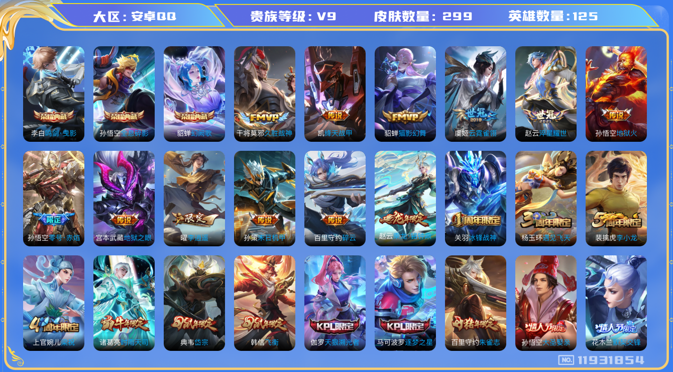 [11931854]【商品标题】:安卓Q-V9-尊贵铂金IV段位-125英雄-299皮肤-3典藏-0珍品无双-0无双-0珍品传说-20传说-103史诗