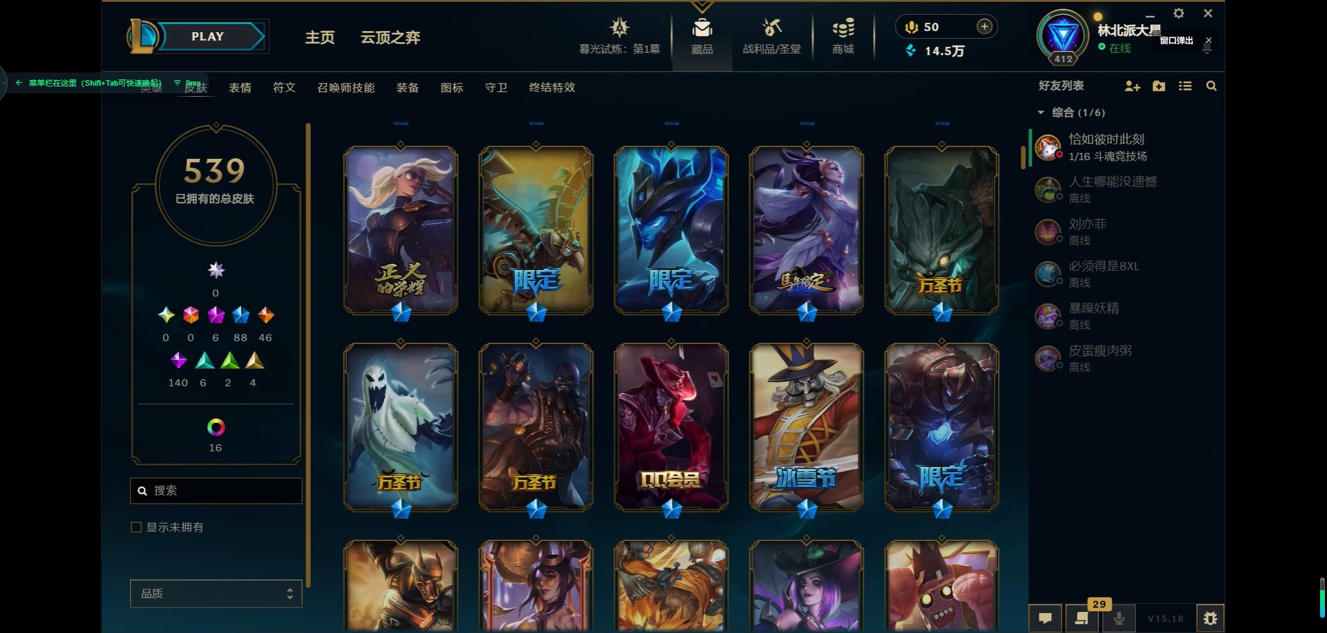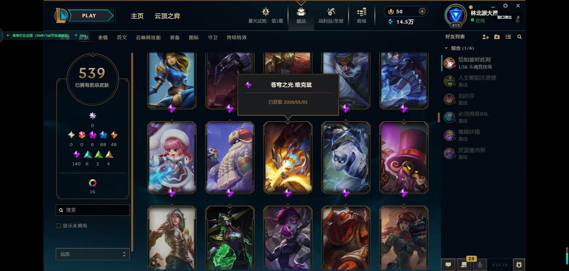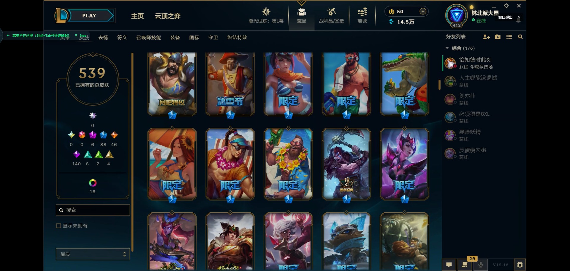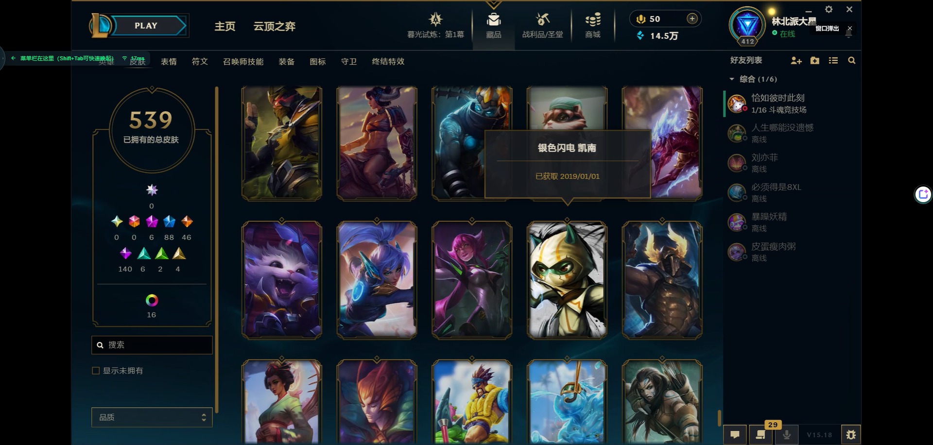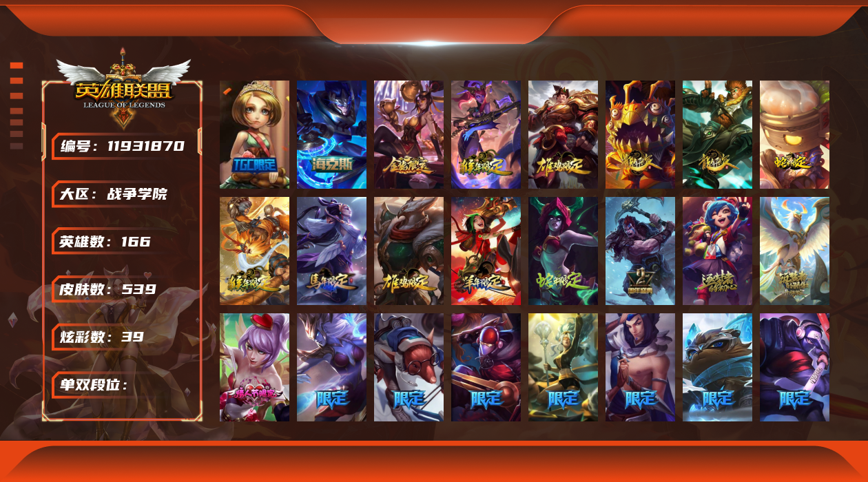 [11931870]6神话 88限定 46传说 140史诗 539皮肤 39炫彩 166英雄 可二次 可修改实名 优质装备:源代码 乐芙兰,防爆天使 凯尔,暗影 沃里克,巧克力工坊 波比,地底世界 崔斯特,电玩战魂 人马,都铎王朝 图奇,防爆士兵 炼金,钢铁之翼 凤凰,冠军之矛 滑板鞋,红桃杰克 崔斯特,机械迷城 加里奥,警用试作体K-9 内瑟斯,蒙多蒙多,密林猎手 提莫,女猎手 希维尔,诺斯费拉图 弗拉基米尔,破空枪骑 孙悟空,糖果使徒 费德提克,野兽猎人 德莱文,野兽猎人 瑟庄妮,野兽猎人 泰达米尔,勇者 阿狸,征服者 卡尔玛,卧虎藏龙 贾克斯,冠军掠夺者 卡兹克 凯旋圣装,弹幕天使 卡莎 炽天使·勇敢,冠军典狱长 锤石 凯旋圣装,无畏骑士 瑟庄妮 赤子初心,新卧虎藏龙 贾克斯,闭月之颜 貂蝉 炫金莲华,外星装甲 库奇,净雪之月 莫甘娜 冬虹,墨之影武者 亚索 金墨耀影,十五周年纪念 希维尔,心之钢 伊泽瑞尔 天纵才华,魔女 阿卡丽 虚荣,暗裔英雄 盖伦 海克斯:海克斯 嘉文四世 限定:舞会公主 安妮 情人节限定:觅心之翼 奎因 赛季限定皮:胜利女神 希维尔 冠军限定系列:S1FNC 酒桶,S1FNC 迦娜,S1FNC 嘉文四世,S2 暗杀星 蒙多,S2 暗杀星 努努,S2 暗杀星 慎,S3 SKT T1 劫,S4 SSW 锤石,S4 SSW 雷恩加尔,S4 SSW 泰隆,S4 SSW 图奇,S4 SSW 炼金,S5 SKT T1 瑞兹,S5 SKT T1 蜘蛛,S6 SKT T1 烬,S6 SKT T1 球女,S7 SSG 洛,S10 DWG 凯南 冰雪节限定:“主人不要我了” 阿木木,冰雪节 炼金,胡桃夹子 小丑,平安夜女神 娑娜,魄罗骑士 瑟庄妮,圣诞开心鬼 提莫,圣诞精灵 崔丝塔娜,圣诞狂欢 时光,圣诞老人 酒桶,圣诞糖果棒 厄运小姐,圣诞玩偶 波比,圣诞驯鹿 克格莫,冰雪节 茂凯,邪恶圣诞老人 维迦,幸福女神 乐芙兰,雪默丁格,英勇玩具兵船长 泳池派对:泳池派对 吉格斯,泳池派对 蕾欧娜,泳池派对 男枪,泳池派对 菲奥娜,泳池派对 雷克顿,泳池派对 李青,泳池派对 普朗克 万圣节限定:魅惑女巫 乐芙兰,鬼影森森 茂凯,鬼影重重 魔腾,海贼 瑞兹,死亡誓约 劫,无头骑士 人马 年限:点心宝贝 阿木木,龙年 克格莫,龙年 孙悟空,蛇年 卡西奥佩娅,马年 黛安娜,羊年 金克丝,