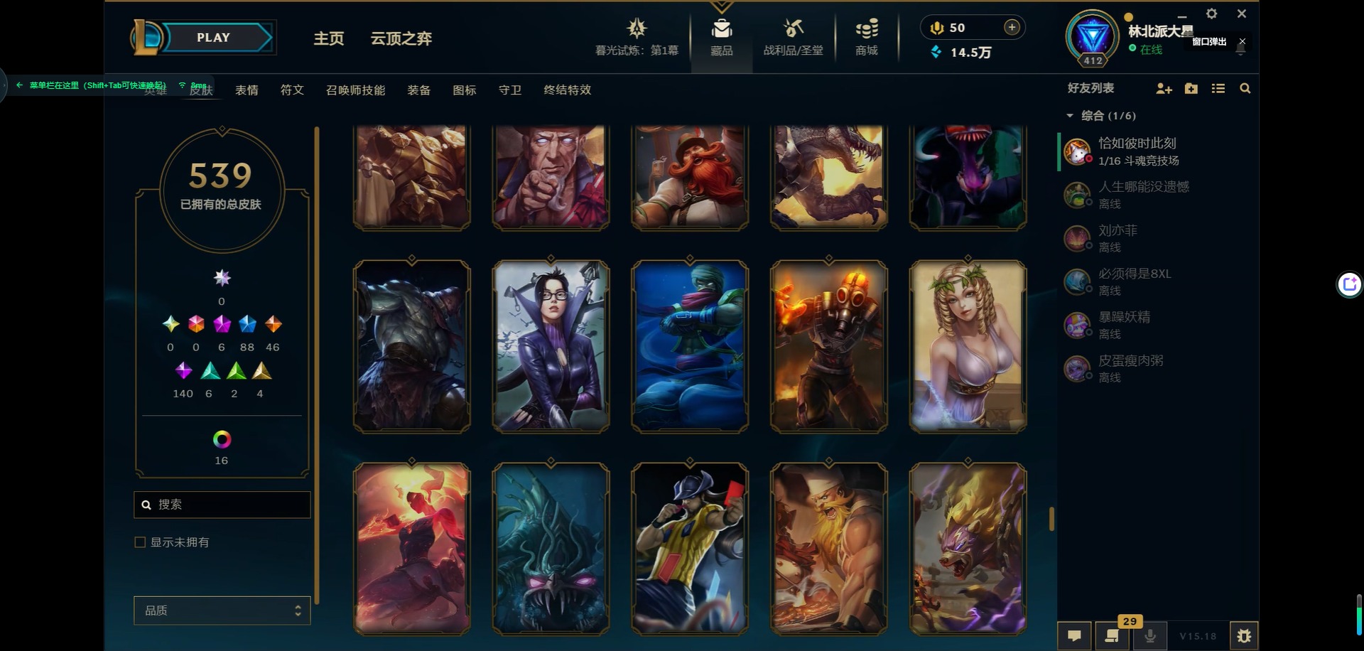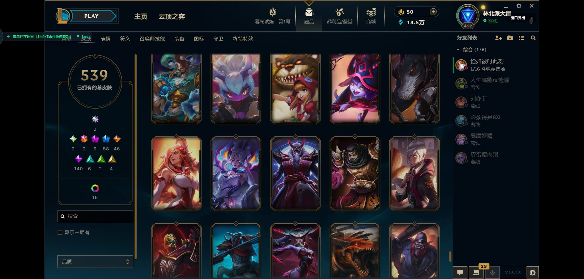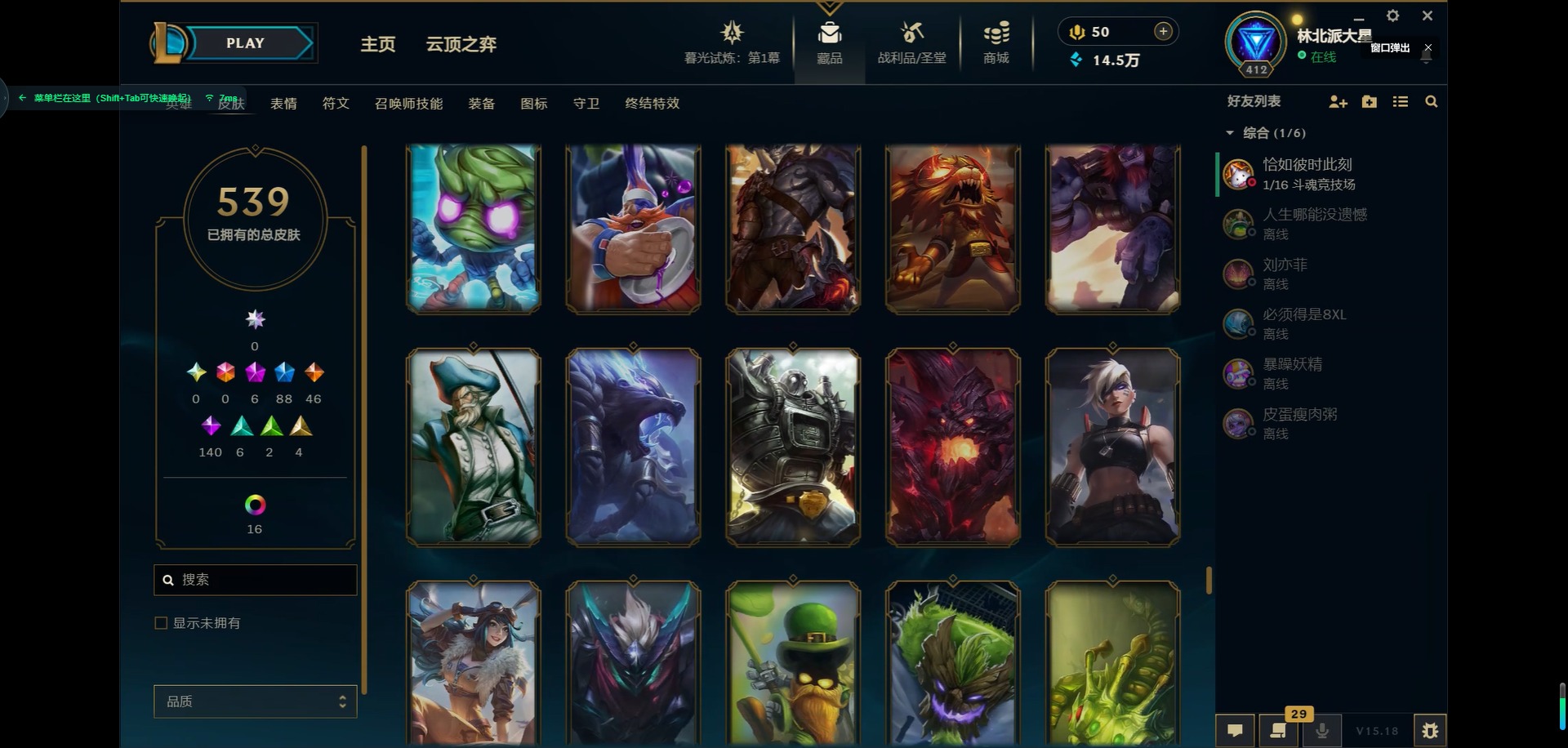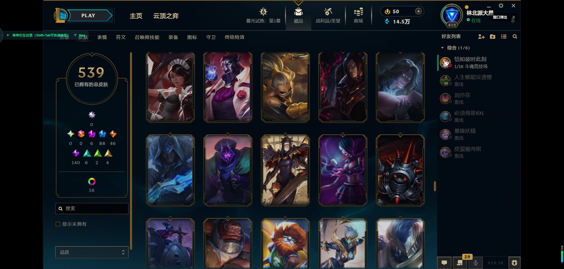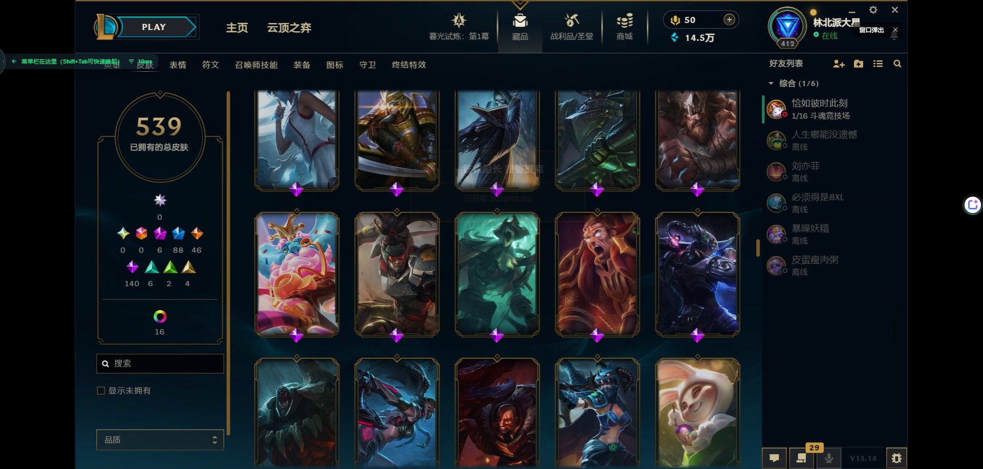 [11931870]6神话 88限定 46传说 140史诗 539皮肤 39炫彩 166英雄 可二次 可修改实名 优质装备:源代码 乐芙兰,防爆天使 凯尔,暗影 沃里克,巧克力工坊 波比,地底世界 崔斯特,电玩战魂 人马,都铎王朝 图奇,防爆士兵 炼金,钢铁之翼 凤凰,冠军之矛 滑板鞋,红桃杰克 崔斯特,机械迷城 加里奥,警用试作体K-9 内瑟斯,蒙多蒙多,密林猎手 提莫,女猎手 希维尔,诺斯费拉图 弗拉基米尔,破空枪骑 孙悟空,糖果使徒 费德提克,野兽猎人 德莱文,野兽猎人 瑟庄妮,野兽猎人 泰达米尔,勇者 阿狸,征服者 卡尔玛,卧虎藏龙 贾克斯,冠军掠夺者 卡兹克 凯旋圣装,弹幕天使 卡莎 炽天使·勇敢,冠军典狱长 锤石 凯旋圣装,无畏骑士 瑟庄妮 赤子初心,新卧虎藏龙 贾克斯,闭月之颜 貂蝉 炫金莲华,外星装甲 库奇,净雪之月 莫甘娜 冬虹,墨之影武者 亚索 金墨耀影,十五周年纪念 希维尔,心之钢 伊泽瑞尔 天纵才华,魔女 阿卡丽 虚荣,暗裔英雄 盖伦 海克斯:海克斯 嘉文四世 限定:舞会公主 安妮 情人节限定:觅心之翼 奎因 赛季限定皮:胜利女神 希维尔 冠军限定系列:S1FNC 酒桶,S1FNC 迦娜,S1FNC 嘉文四世,S2 暗杀星 蒙多,S2 暗杀星 努努,S2 暗杀星 慎,S3 SKT T1 劫,S4 SSW 锤石,S4 SSW 雷恩加尔,S4 SSW 泰隆,S4 SSW 图奇,S4 SSW 炼金,S5 SKT T1 瑞兹,S5 SKT T1 蜘蛛,S6 SKT T1 烬,S6 SKT T1 球女,S7 SSG 洛,S10 DWG 凯南 冰雪节限定:“主人不要我了” 阿木木,冰雪节 炼金,胡桃夹子 小丑,平安夜女神 娑娜,魄罗骑士 瑟庄妮,圣诞开心鬼 提莫,圣诞精灵 崔丝塔娜,圣诞狂欢 时光,圣诞老人 酒桶,圣诞糖果棒 厄运小姐,圣诞玩偶 波比,圣诞驯鹿 克格莫,冰雪节 茂凯,邪恶圣诞老人 维迦,幸福女神 乐芙兰,雪默丁格,英勇玩具兵船长 泳池派对:泳池派对 吉格斯,泳池派对 蕾欧娜,泳池派对 男枪,泳池派对 菲奥娜,泳池派对 雷克顿,泳池派对 李青,泳池派对 普朗克 万圣节限定:魅惑女巫 乐芙兰,鬼影森森 茂凯,鬼影重重 魔腾,海贼 瑞兹,死亡誓约 劫,无头骑士 人马 年限:点心宝贝 阿木木,龙年 克格莫,龙年 孙悟空,蛇年 卡西奥佩娅,马年 黛安娜,羊年 金克丝,