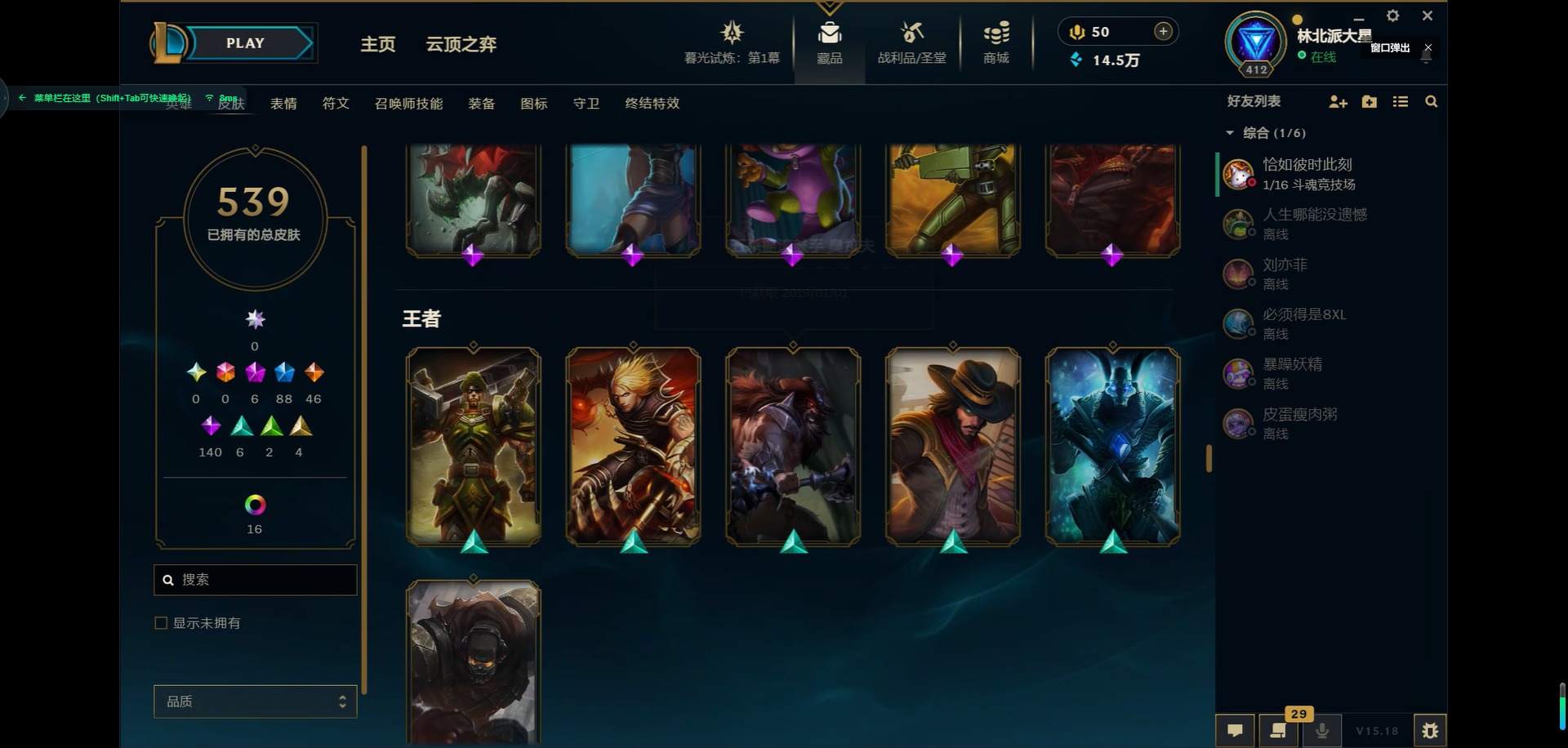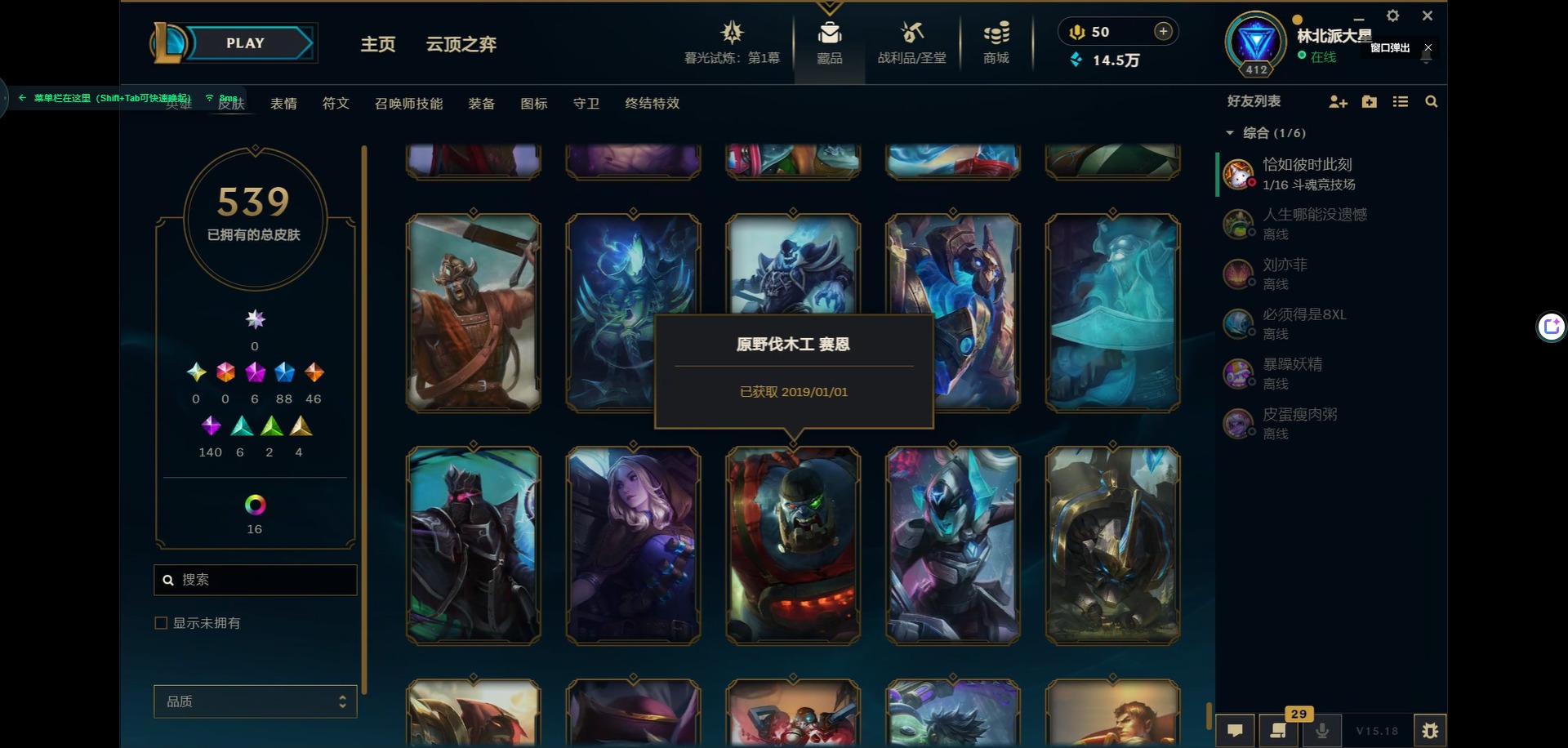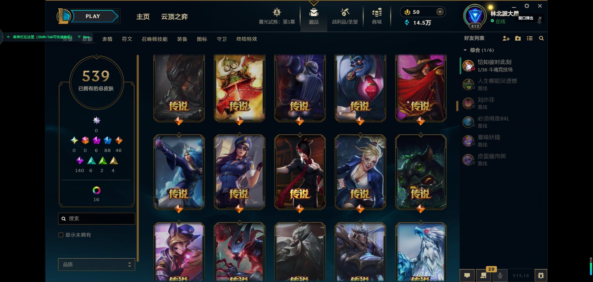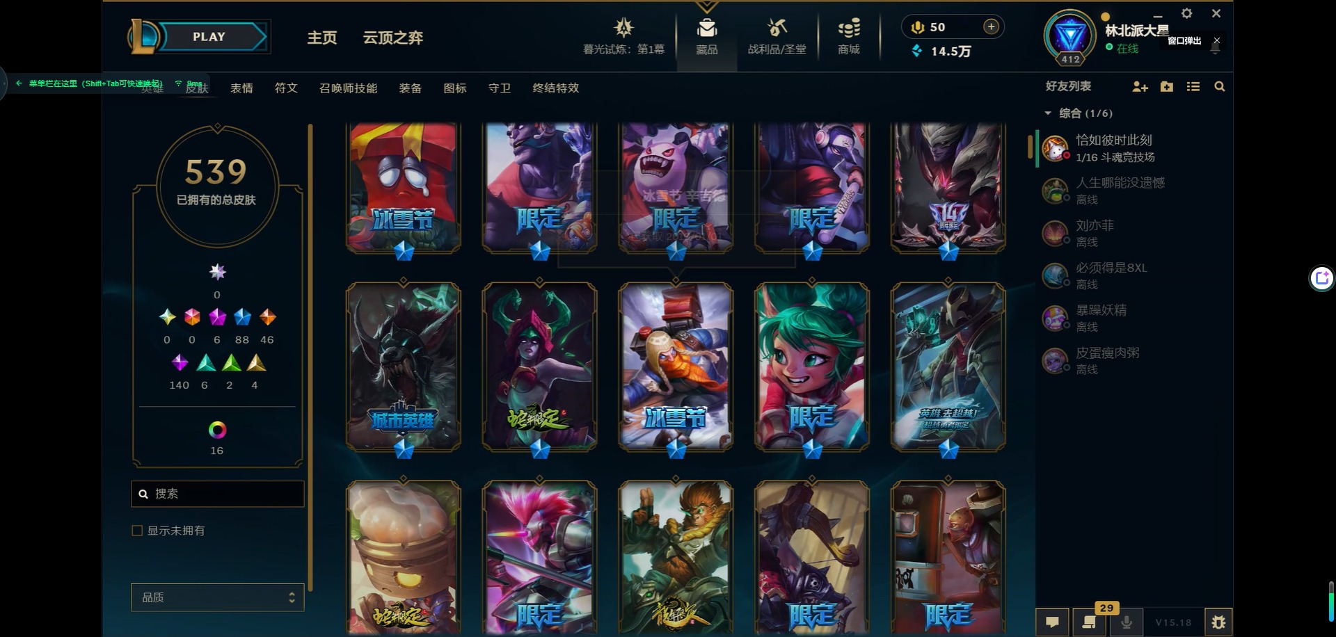 [11931870]6神话 88限定 46传说 140史诗 539皮肤 39炫彩 166英雄 可二次 可修改实名 优质装备:源代码 乐芙兰,防爆天使 凯尔,暗影 沃里克,巧克力工坊 波比,地底世界 崔斯特,电玩战魂 人马,都铎王朝 图奇,防爆士兵 炼金,钢铁之翼 凤凰,冠军之矛 滑板鞋,红桃杰克 崔斯特,机械迷城 加里奥,警用试作体K-9 内瑟斯,蒙多蒙多,密林猎手 提莫,女猎手 希维尔,诺斯费拉图 弗拉基米尔,破空枪骑 孙悟空,糖果使徒 费德提克,野兽猎人 德莱文,野兽猎人 瑟庄妮,野兽猎人 泰达米尔,勇者 阿狸,征服者 卡尔玛,卧虎藏龙 贾克斯,冠军掠夺者 卡兹克 凯旋圣装,弹幕天使 卡莎 炽天使·勇敢,冠军典狱长 锤石 凯旋圣装,无畏骑士 瑟庄妮 赤子初心,新卧虎藏龙 贾克斯,闭月之颜 貂蝉 炫金莲华,外星装甲 库奇,净雪之月 莫甘娜 冬虹,墨之影武者 亚索 金墨耀影,十五周年纪念 希维尔,心之钢 伊泽瑞尔 天纵才华,魔女 阿卡丽 虚荣,暗裔英雄 盖伦 海克斯:海克斯 嘉文四世 限定:舞会公主 安妮 情人节限定:觅心之翼 奎因 赛季限定皮:胜利女神 希维尔 冠军限定系列:S1FNC 酒桶,S1FNC 迦娜,S1FNC 嘉文四世,S2 暗杀星 蒙多,S2 暗杀星 努努,S2 暗杀星 慎,S3 SKT T1 劫,S4 SSW 锤石,S4 SSW 雷恩加尔,S4 SSW 泰隆,S4 SSW 图奇,S4 SSW 炼金,S5 SKT T1 瑞兹,S5 SKT T1 蜘蛛,S6 SKT T1 烬,S6 SKT T1 球女,S7 SSG 洛,S10 DWG 凯南 冰雪节限定:“主人不要我了” 阿木木,冰雪节 炼金,胡桃夹子 小丑,平安夜女神 娑娜,魄罗骑士 瑟庄妮,圣诞开心鬼 提莫,圣诞精灵 崔丝塔娜,圣诞狂欢 时光,圣诞老人 酒桶,圣诞糖果棒 厄运小姐,圣诞玩偶 波比,圣诞驯鹿 克格莫,冰雪节 茂凯,邪恶圣诞老人 维迦,幸福女神 乐芙兰,雪默丁格,英勇玩具兵船长 泳池派对:泳池派对 吉格斯,泳池派对 蕾欧娜,泳池派对 男枪,泳池派对 菲奥娜,泳池派对 雷克顿,泳池派对 李青,泳池派对 普朗克 万圣节限定:魅惑女巫 乐芙兰,鬼影森森 茂凯,鬼影重重 魔腾,海贼 瑞兹,死亡誓约 劫,无头骑士 人马 年限:点心宝贝 阿木木,龙年 克格莫,龙年 孙悟空,蛇年 卡西奥佩娅,马年 黛安娜,羊年 金克丝,