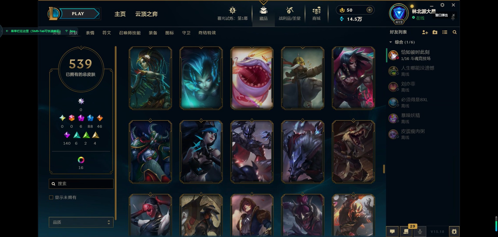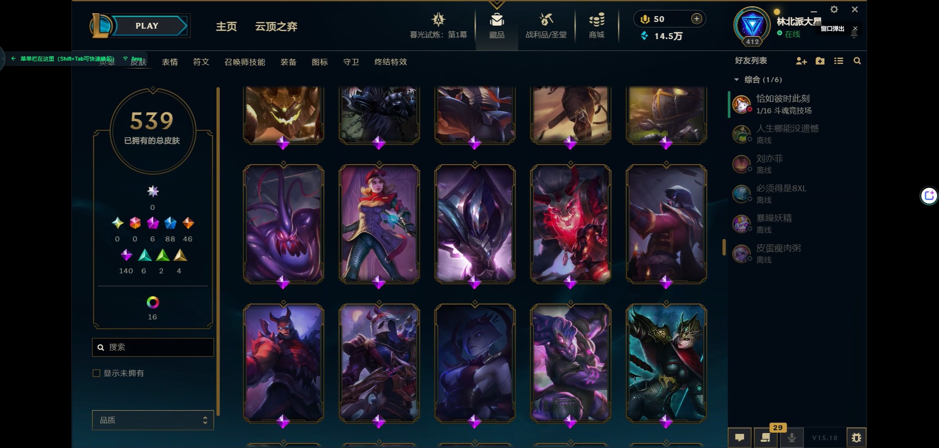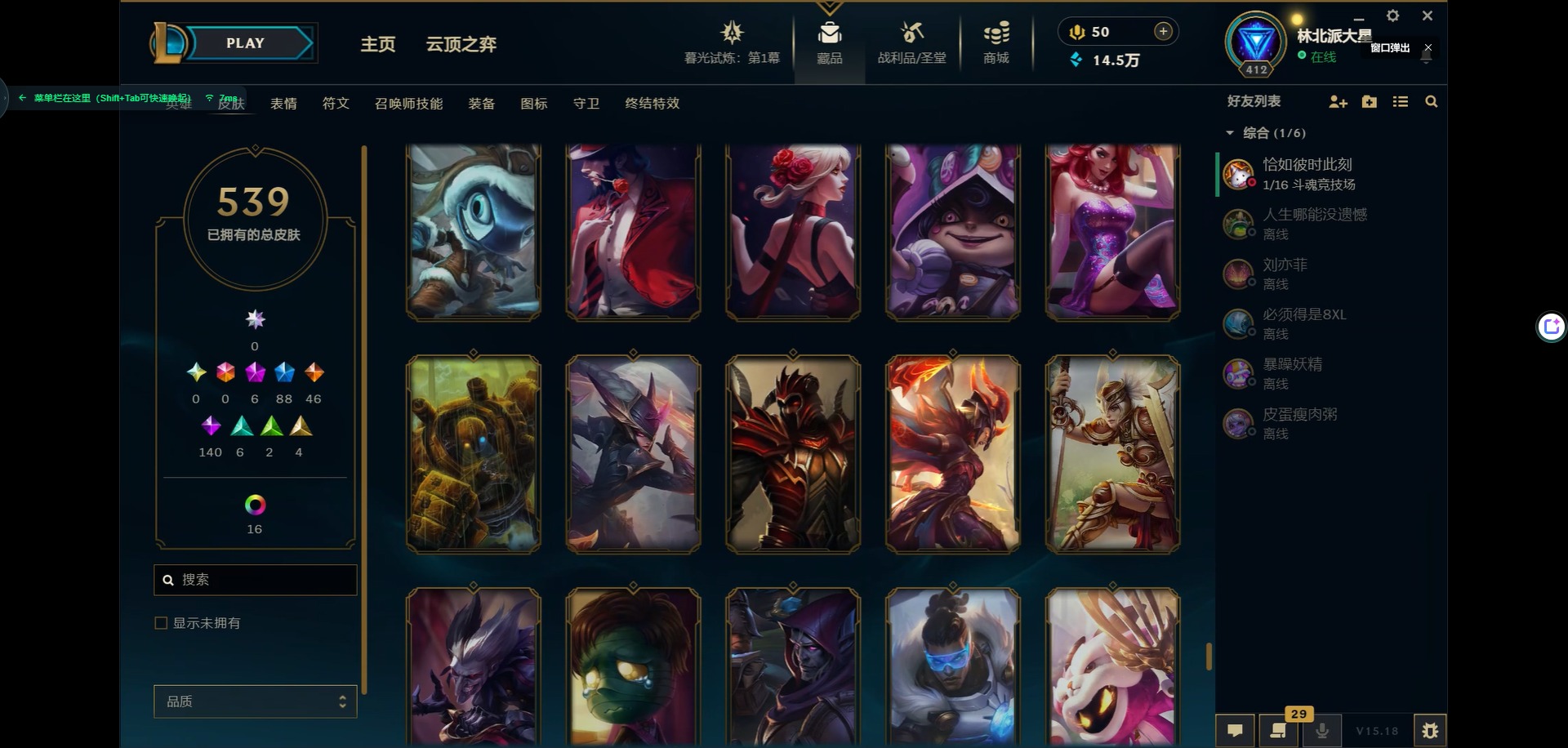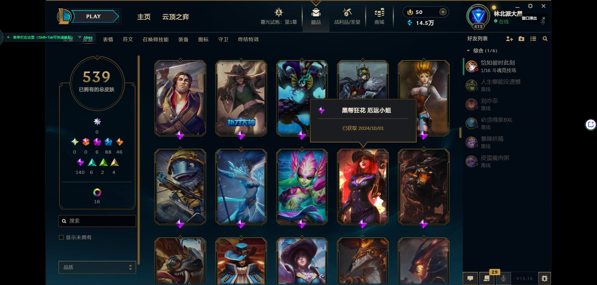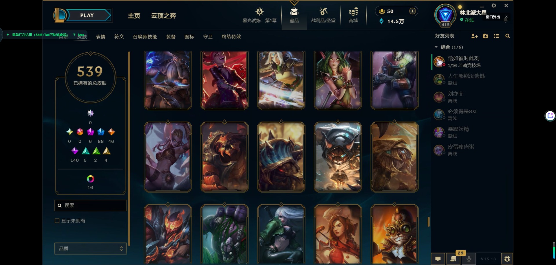 [11931870]6神话 88限定 46传说 140史诗 539皮肤 39炫彩 166英雄 可二次 可修改实名 优质装备:源代码 乐芙兰,防爆天使 凯尔,暗影 沃里克,巧克力工坊 波比,地底世界 崔斯特,电玩战魂 人马,都铎王朝 图奇,防爆士兵 炼金,钢铁之翼 凤凰,冠军之矛 滑板鞋,红桃杰克 崔斯特,机械迷城 加里奥,警用试作体K-9 内瑟斯,蒙多蒙多,密林猎手 提莫,女猎手 希维尔,诺斯费拉图 弗拉基米尔,破空枪骑 孙悟空,糖果使徒 费德提克,野兽猎人 德莱文,野兽猎人 瑟庄妮,野兽猎人 泰达米尔,勇者 阿狸,征服者 卡尔玛,卧虎藏龙 贾克斯,冠军掠夺者 卡兹克 凯旋圣装,弹幕天使 卡莎 炽天使·勇敢,冠军典狱长 锤石 凯旋圣装,无畏骑士 瑟庄妮 赤子初心,新卧虎藏龙 贾克斯,闭月之颜 貂蝉 炫金莲华,外星装甲 库奇,净雪之月 莫甘娜 冬虹,墨之影武者 亚索 金墨耀影,十五周年纪念 希维尔,心之钢 伊泽瑞尔 天纵才华,魔女 阿卡丽 虚荣,暗裔英雄 盖伦 海克斯:海克斯 嘉文四世 限定:舞会公主 安妮 情人节限定:觅心之翼 奎因 赛季限定皮:胜利女神 希维尔 冠军限定系列:S1FNC 酒桶,S1FNC 迦娜,S1FNC 嘉文四世,S2 暗杀星 蒙多,S2 暗杀星 努努,S2 暗杀星 慎,S3 SKT T1 劫,S4 SSW 锤石,S4 SSW 雷恩加尔,S4 SSW 泰隆,S4 SSW 图奇,S4 SSW 炼金,S5 SKT T1 瑞兹,S5 SKT T1 蜘蛛,S6 SKT T1 烬,S6 SKT T1 球女,S7 SSG 洛,S10 DWG 凯南 冰雪节限定:“主人不要我了” 阿木木,冰雪节 炼金,胡桃夹子 小丑,平安夜女神 娑娜,魄罗骑士 瑟庄妮,圣诞开心鬼 提莫,圣诞精灵 崔丝塔娜,圣诞狂欢 时光,圣诞老人 酒桶,圣诞糖果棒 厄运小姐,圣诞玩偶 波比,圣诞驯鹿 克格莫,冰雪节 茂凯,邪恶圣诞老人 维迦,幸福女神 乐芙兰,雪默丁格,英勇玩具兵船长 泳池派对:泳池派对 吉格斯,泳池派对 蕾欧娜,泳池派对 男枪,泳池派对 菲奥娜,泳池派对 雷克顿,泳池派对 李青,泳池派对 普朗克 万圣节限定:魅惑女巫 乐芙兰,鬼影森森 茂凯,鬼影重重 魔腾,海贼 瑞兹,死亡誓约 劫,无头骑士 人马 年限:点心宝贝 阿木木,龙年 克格莫,龙年 孙悟空,蛇年 卡西奥佩娅,马年 黛安娜,羊年 金克丝,
