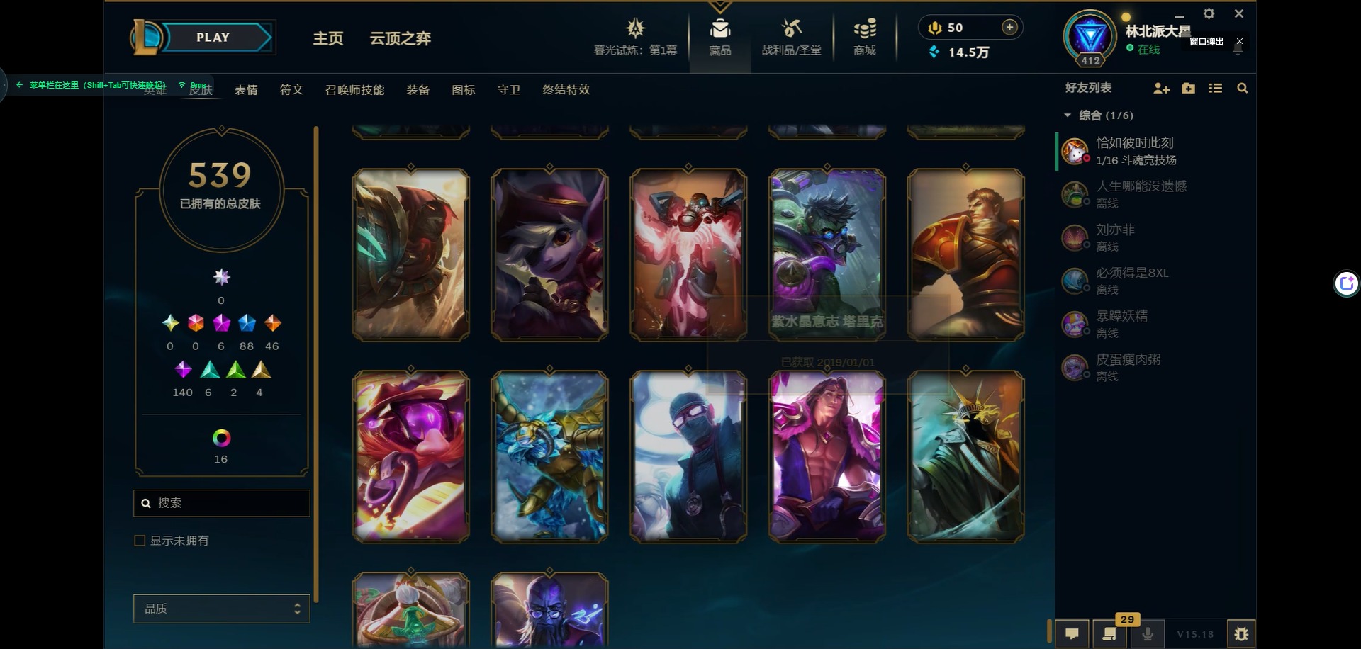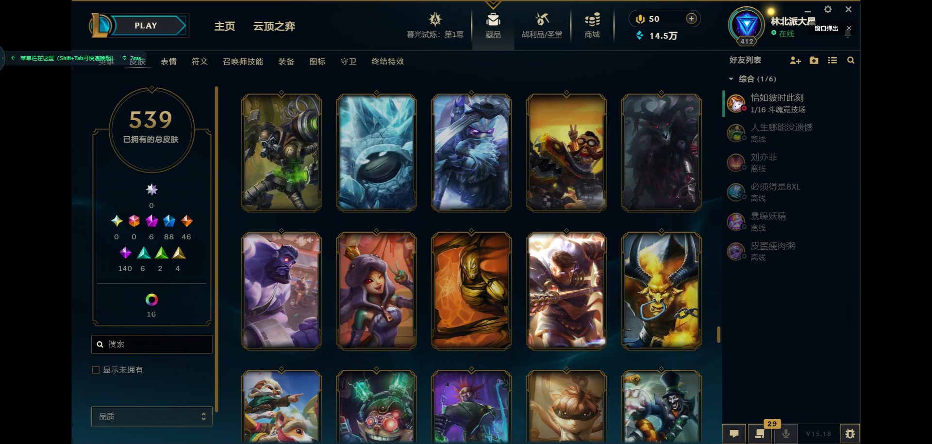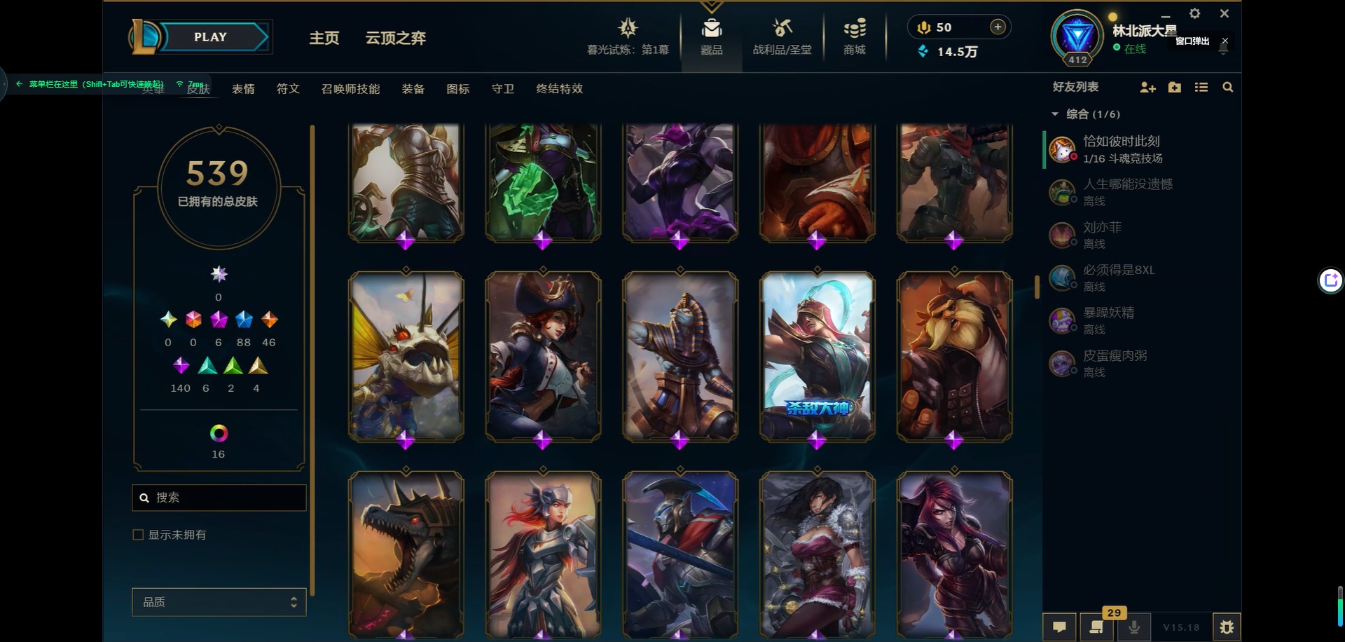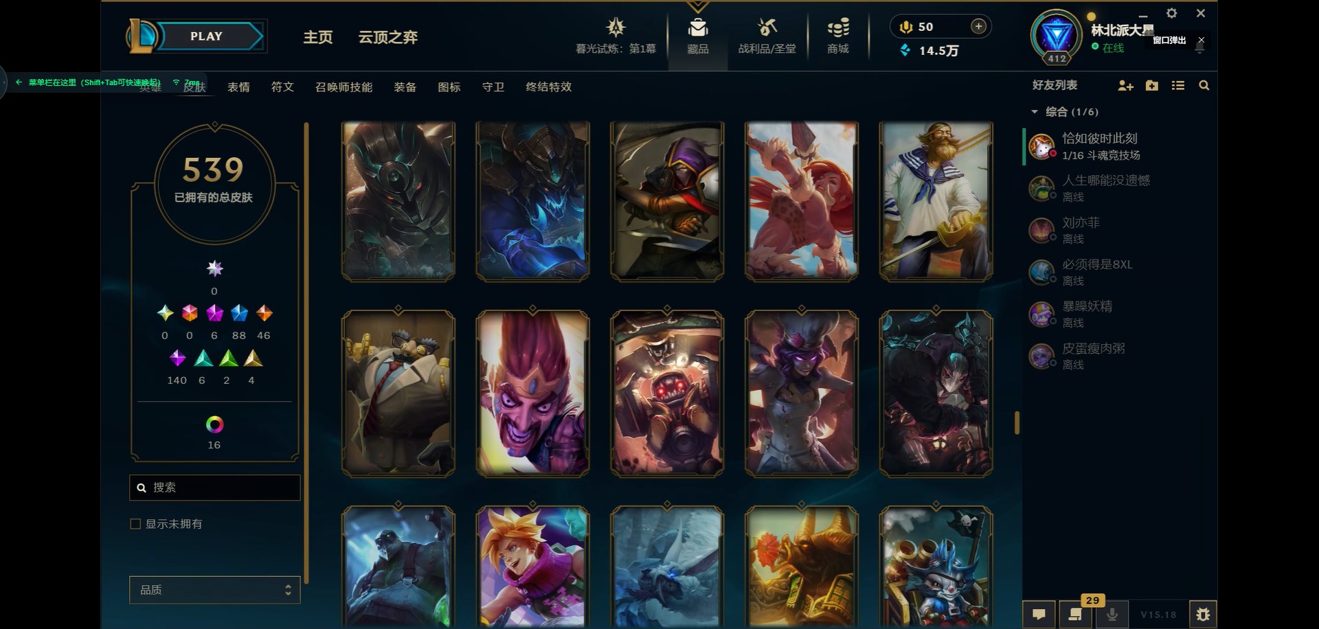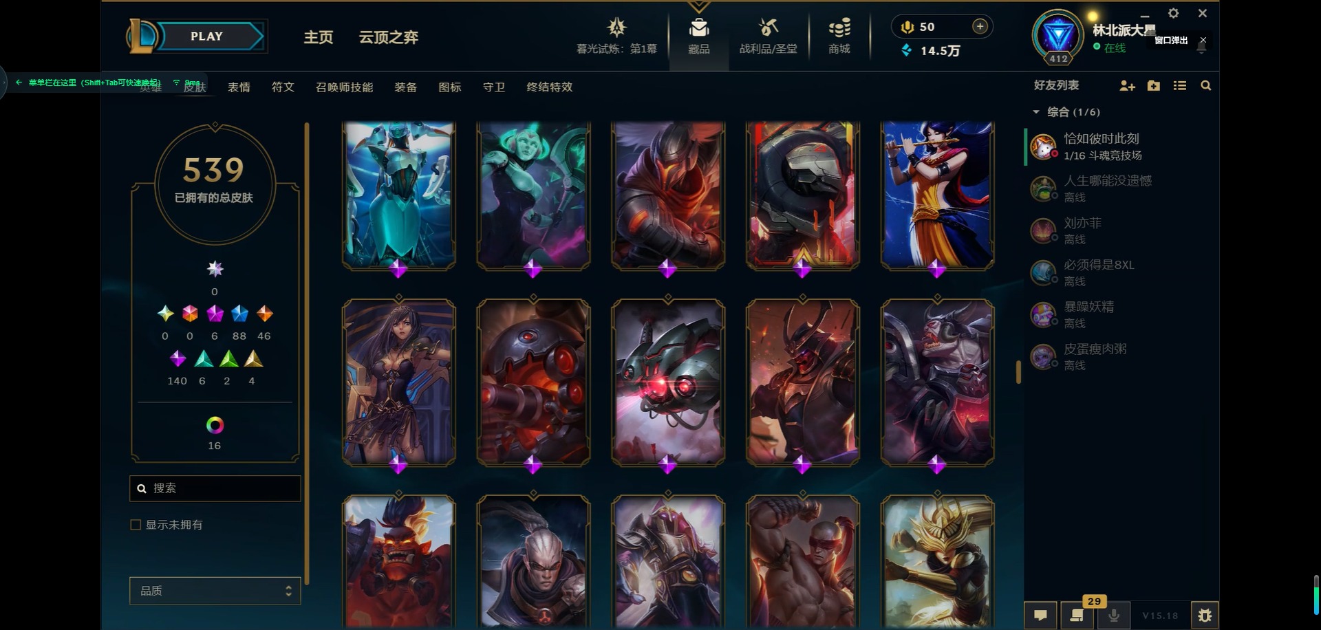 [11931870]6神话 88限定 46传说 140史诗 539皮肤 39炫彩 166英雄 可二次 可修改实名 优质装备:源代码 乐芙兰,防爆天使 凯尔,暗影 沃里克,巧克力工坊 波比,地底世界 崔斯特,电玩战魂 人马,都铎王朝 图奇,防爆士兵 炼金,钢铁之翼 凤凰,冠军之矛 滑板鞋,红桃杰克 崔斯特,机械迷城 加里奥,警用试作体K-9 内瑟斯,蒙多蒙多,密林猎手 提莫,女猎手 希维尔,诺斯费拉图 弗拉基米尔,破空枪骑 孙悟空,糖果使徒 费德提克,野兽猎人 德莱文,野兽猎人 瑟庄妮,野兽猎人 泰达米尔,勇者 阿狸,征服者 卡尔玛,卧虎藏龙 贾克斯,冠军掠夺者 卡兹克 凯旋圣装,弹幕天使 卡莎 炽天使·勇敢,冠军典狱长 锤石 凯旋圣装,无畏骑士 瑟庄妮 赤子初心,新卧虎藏龙 贾克斯,闭月之颜 貂蝉 炫金莲华,外星装甲 库奇,净雪之月 莫甘娜 冬虹,墨之影武者 亚索 金墨耀影,十五周年纪念 希维尔,心之钢 伊泽瑞尔 天纵才华,魔女 阿卡丽 虚荣,暗裔英雄 盖伦 海克斯:海克斯 嘉文四世 限定:舞会公主 安妮 情人节限定:觅心之翼 奎因 赛季限定皮:胜利女神 希维尔 冠军限定系列:S1FNC 酒桶,S1FNC 迦娜,S1FNC 嘉文四世,S2 暗杀星 蒙多,S2 暗杀星 努努,S2 暗杀星 慎,S3 SKT T1 劫,S4 SSW 锤石,S4 SSW 雷恩加尔,S4 SSW 泰隆,S4 SSW 图奇,S4 SSW 炼金,S5 SKT T1 瑞兹,S5 SKT T1 蜘蛛,S6 SKT T1 烬,S6 SKT T1 球女,S7 SSG 洛,S10 DWG 凯南 冰雪节限定:“主人不要我了” 阿木木,冰雪节 炼金,胡桃夹子 小丑,平安夜女神 娑娜,魄罗骑士 瑟庄妮,圣诞开心鬼 提莫,圣诞精灵 崔丝塔娜,圣诞狂欢 时光,圣诞老人 酒桶,圣诞糖果棒 厄运小姐,圣诞玩偶 波比,圣诞驯鹿 克格莫,冰雪节 茂凯,邪恶圣诞老人 维迦,幸福女神 乐芙兰,雪默丁格,英勇玩具兵船长 泳池派对:泳池派对 吉格斯,泳池派对 蕾欧娜,泳池派对 男枪,泳池派对 菲奥娜,泳池派对 雷克顿,泳池派对 李青,泳池派对 普朗克 万圣节限定:魅惑女巫 乐芙兰,鬼影森森 茂凯,鬼影重重 魔腾,海贼 瑞兹,死亡誓约 劫,无头骑士 人马 年限:点心宝贝 阿木木,龙年 克格莫,龙年 孙悟空,蛇年 卡西奥佩娅,马年 黛安娜,羊年 金克丝,