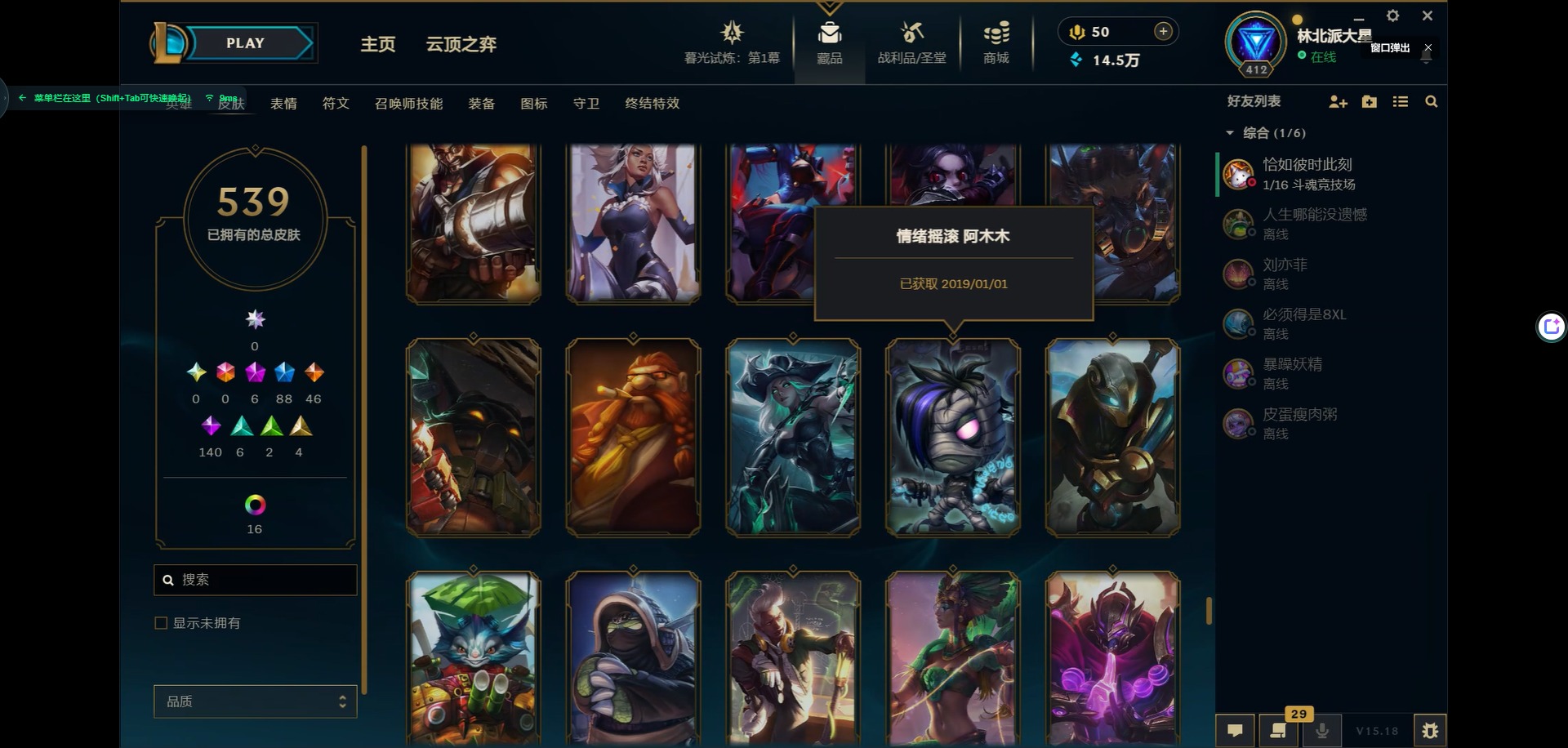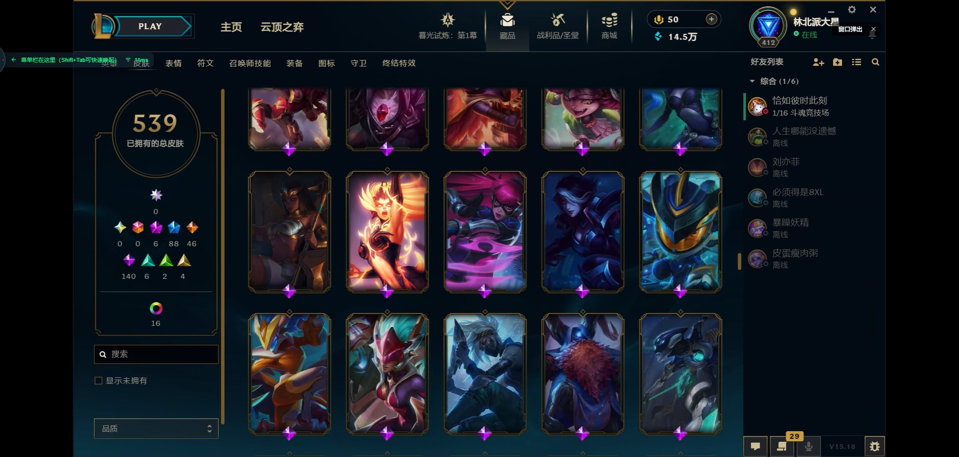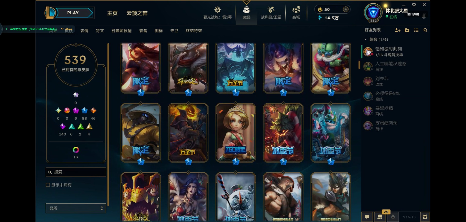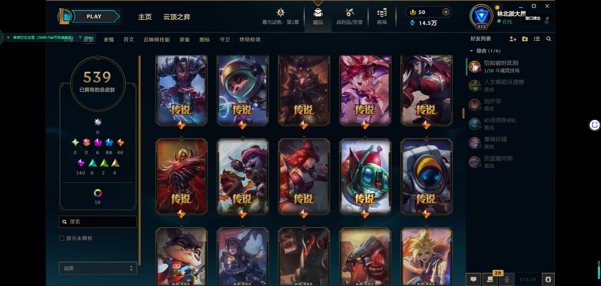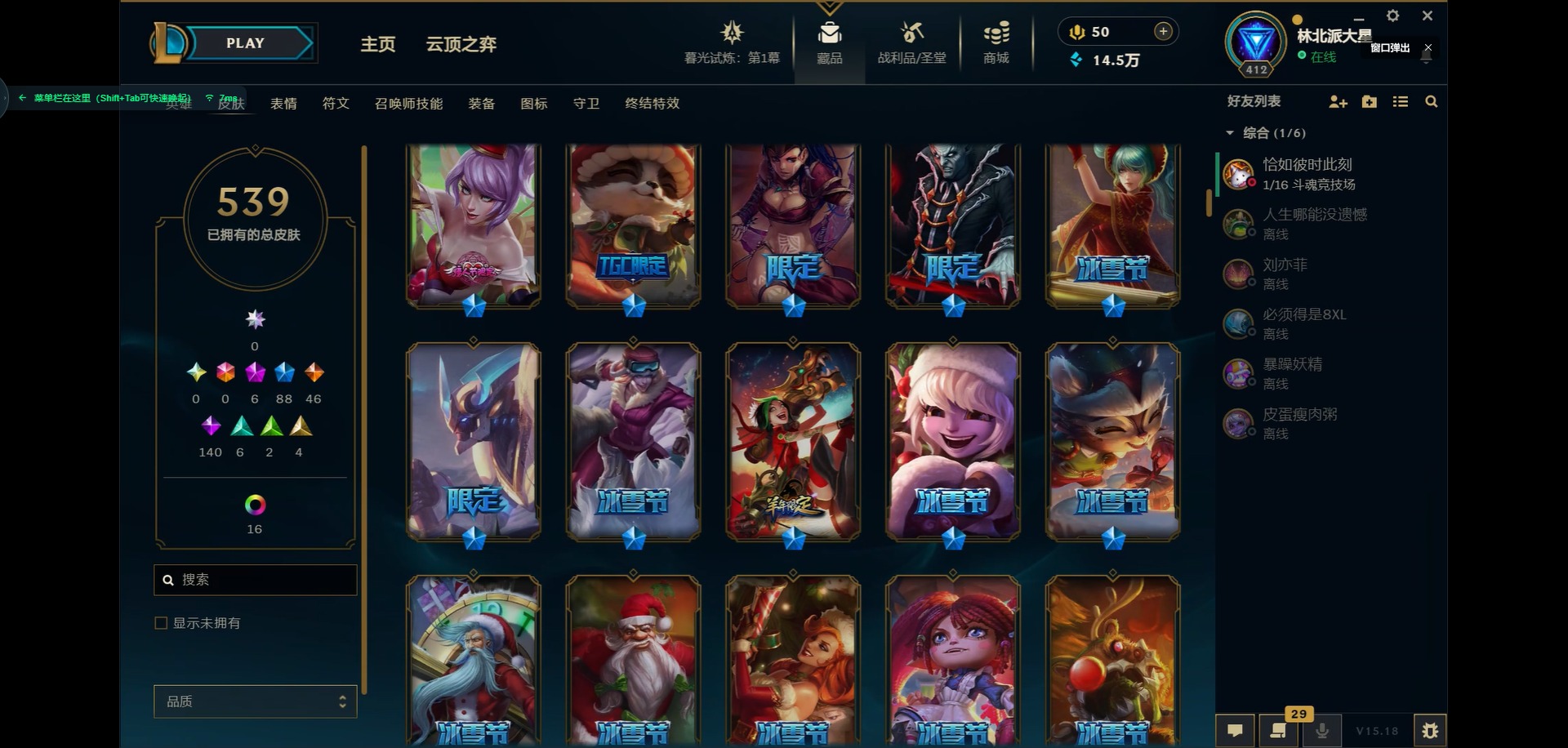 [11931870]6神话 88限定 46传说 140史诗 539皮肤 39炫彩 166英雄 可二次 可修改实名 优质装备:源代码 乐芙兰,防爆天使 凯尔,暗影 沃里克,巧克力工坊 波比,地底世界 崔斯特,电玩战魂 人马,都铎王朝 图奇,防爆士兵 炼金,钢铁之翼 凤凰,冠军之矛 滑板鞋,红桃杰克 崔斯特,机械迷城 加里奥,警用试作体K-9 内瑟斯,蒙多蒙多,密林猎手 提莫,女猎手 希维尔,诺斯费拉图 弗拉基米尔,破空枪骑 孙悟空,糖果使徒 费德提克,野兽猎人 德莱文,野兽猎人 瑟庄妮,野兽猎人 泰达米尔,勇者 阿狸,征服者 卡尔玛,卧虎藏龙 贾克斯,冠军掠夺者 卡兹克 凯旋圣装,弹幕天使 卡莎 炽天使·勇敢,冠军典狱长 锤石 凯旋圣装,无畏骑士 瑟庄妮 赤子初心,新卧虎藏龙 贾克斯,闭月之颜 貂蝉 炫金莲华,外星装甲 库奇,净雪之月 莫甘娜 冬虹,墨之影武者 亚索 金墨耀影,十五周年纪念 希维尔,心之钢 伊泽瑞尔 天纵才华,魔女 阿卡丽 虚荣,暗裔英雄 盖伦 海克斯:海克斯 嘉文四世 限定:舞会公主 安妮 情人节限定:觅心之翼 奎因 赛季限定皮:胜利女神 希维尔 冠军限定系列:S1FNC 酒桶,S1FNC 迦娜,S1FNC 嘉文四世,S2 暗杀星 蒙多,S2 暗杀星 努努,S2 暗杀星 慎,S3 SKT T1 劫,S4 SSW 锤石,S4 SSW 雷恩加尔,S4 SSW 泰隆,S4 SSW 图奇,S4 SSW 炼金,S5 SKT T1 瑞兹,S5 SKT T1 蜘蛛,S6 SKT T1 烬,S6 SKT T1 球女,S7 SSG 洛,S10 DWG 凯南 冰雪节限定:“主人不要我了” 阿木木,冰雪节 炼金,胡桃夹子 小丑,平安夜女神 娑娜,魄罗骑士 瑟庄妮,圣诞开心鬼 提莫,圣诞精灵 崔丝塔娜,圣诞狂欢 时光,圣诞老人 酒桶,圣诞糖果棒 厄运小姐,圣诞玩偶 波比,圣诞驯鹿 克格莫,冰雪节 茂凯,邪恶圣诞老人 维迦,幸福女神 乐芙兰,雪默丁格,英勇玩具兵船长 泳池派对:泳池派对 吉格斯,泳池派对 蕾欧娜,泳池派对 男枪,泳池派对 菲奥娜,泳池派对 雷克顿,泳池派对 李青,泳池派对 普朗克 万圣节限定:魅惑女巫 乐芙兰,鬼影森森 茂凯,鬼影重重 魔腾,海贼 瑞兹,死亡誓约 劫,无头骑士 人马 年限:点心宝贝 阿木木,龙年 克格莫,龙年 孙悟空,蛇年 卡西奥佩娅,马年 黛安娜,羊年 金克丝,