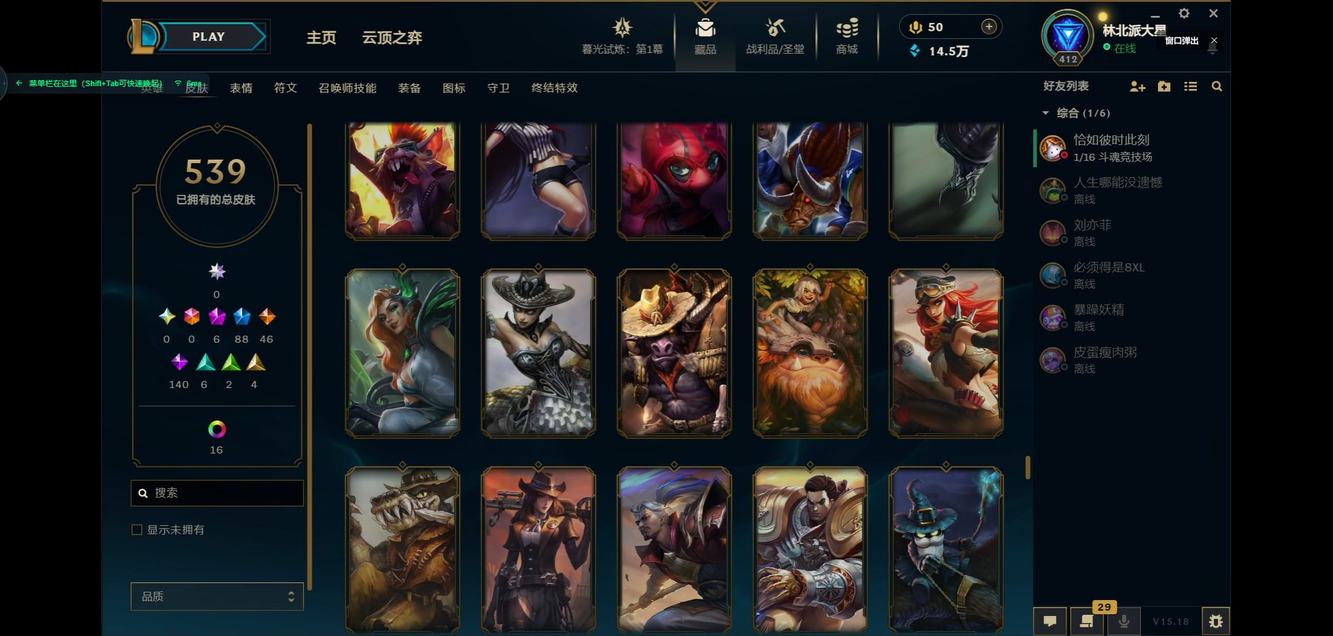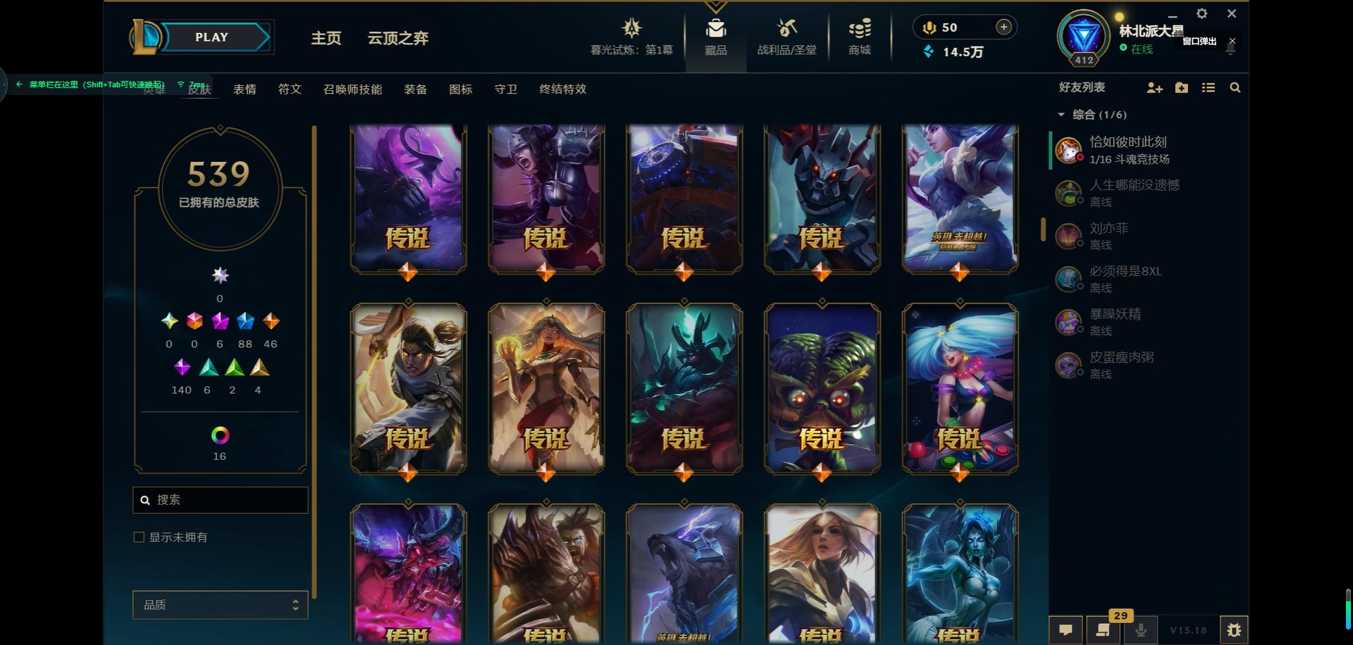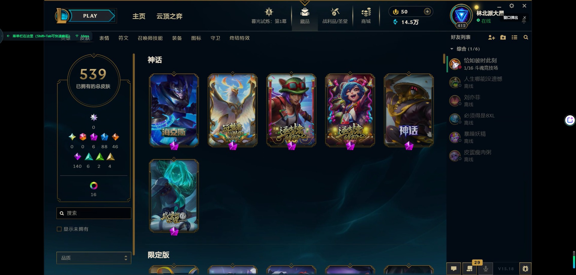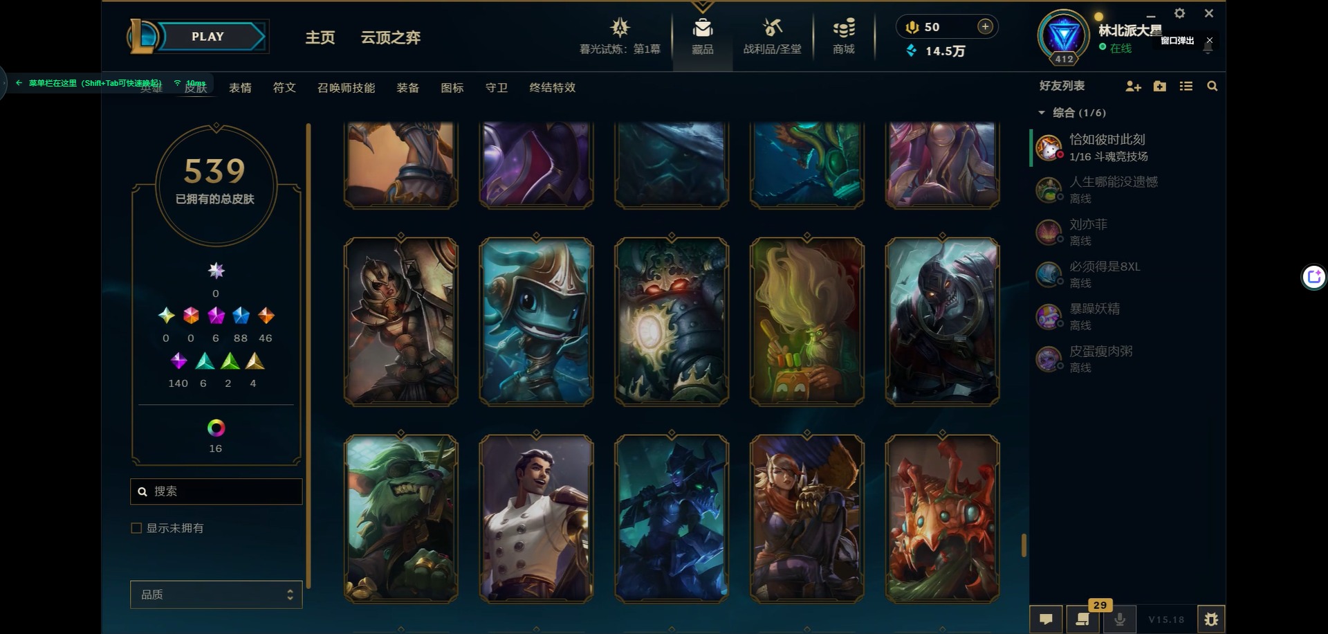 [11931870]6神话 88限定 46传说 140史诗 539皮肤 39炫彩 166英雄 可二次 可修改实名 优质装备:源代码 乐芙兰,防爆天使 凯尔,暗影 沃里克,巧克力工坊 波比,地底世界 崔斯特,电玩战魂 人马,都铎王朝 图奇,防爆士兵 炼金,钢铁之翼 凤凰,冠军之矛 滑板鞋,红桃杰克 崔斯特,机械迷城 加里奥,警用试作体K-9 内瑟斯,蒙多蒙多,密林猎手 提莫,女猎手 希维尔,诺斯费拉图 弗拉基米尔,破空枪骑 孙悟空,糖果使徒 费德提克,野兽猎人 德莱文,野兽猎人 瑟庄妮,野兽猎人 泰达米尔,勇者 阿狸,征服者 卡尔玛,卧虎藏龙 贾克斯,冠军掠夺者 卡兹克 凯旋圣装,弹幕天使 卡莎 炽天使·勇敢,冠军典狱长 锤石 凯旋圣装,无畏骑士 瑟庄妮 赤子初心,新卧虎藏龙 贾克斯,闭月之颜 貂蝉 炫金莲华,外星装甲 库奇,净雪之月 莫甘娜 冬虹,墨之影武者 亚索 金墨耀影,十五周年纪念 希维尔,心之钢 伊泽瑞尔 天纵才华,魔女 阿卡丽 虚荣,暗裔英雄 盖伦 海克斯:海克斯 嘉文四世 限定:舞会公主 安妮 情人节限定:觅心之翼 奎因 赛季限定皮:胜利女神 希维尔 冠军限定系列:S1FNC 酒桶,S1FNC 迦娜,S1FNC 嘉文四世,S2 暗杀星 蒙多,S2 暗杀星 努努,S2 暗杀星 慎,S3 SKT T1 劫,S4 SSW 锤石,S4 SSW 雷恩加尔,S4 SSW 泰隆,S4 SSW 图奇,S4 SSW 炼金,S5 SKT T1 瑞兹,S5 SKT T1 蜘蛛,S6 SKT T1 烬,S6 SKT T1 球女,S7 SSG 洛,S10 DWG 凯南 冰雪节限定:“主人不要我了” 阿木木,冰雪节 炼金,胡桃夹子 小丑,平安夜女神 娑娜,魄罗骑士 瑟庄妮,圣诞开心鬼 提莫,圣诞精灵 崔丝塔娜,圣诞狂欢 时光,圣诞老人 酒桶,圣诞糖果棒 厄运小姐,圣诞玩偶 波比,圣诞驯鹿 克格莫,冰雪节 茂凯,邪恶圣诞老人 维迦,幸福女神 乐芙兰,雪默丁格,英勇玩具兵船长 泳池派对:泳池派对 吉格斯,泳池派对 蕾欧娜,泳池派对 男枪,泳池派对 菲奥娜,泳池派对 雷克顿,泳池派对 李青,泳池派对 普朗克 万圣节限定:魅惑女巫 乐芙兰,鬼影森森 茂凯,鬼影重重 魔腾,海贼 瑞兹,死亡誓约 劫,无头骑士 人马 年限:点心宝贝 阿木木,龙年 克格莫,龙年 孙悟空,蛇年 卡西奥佩娅,马年 黛安娜,羊年 金克丝,