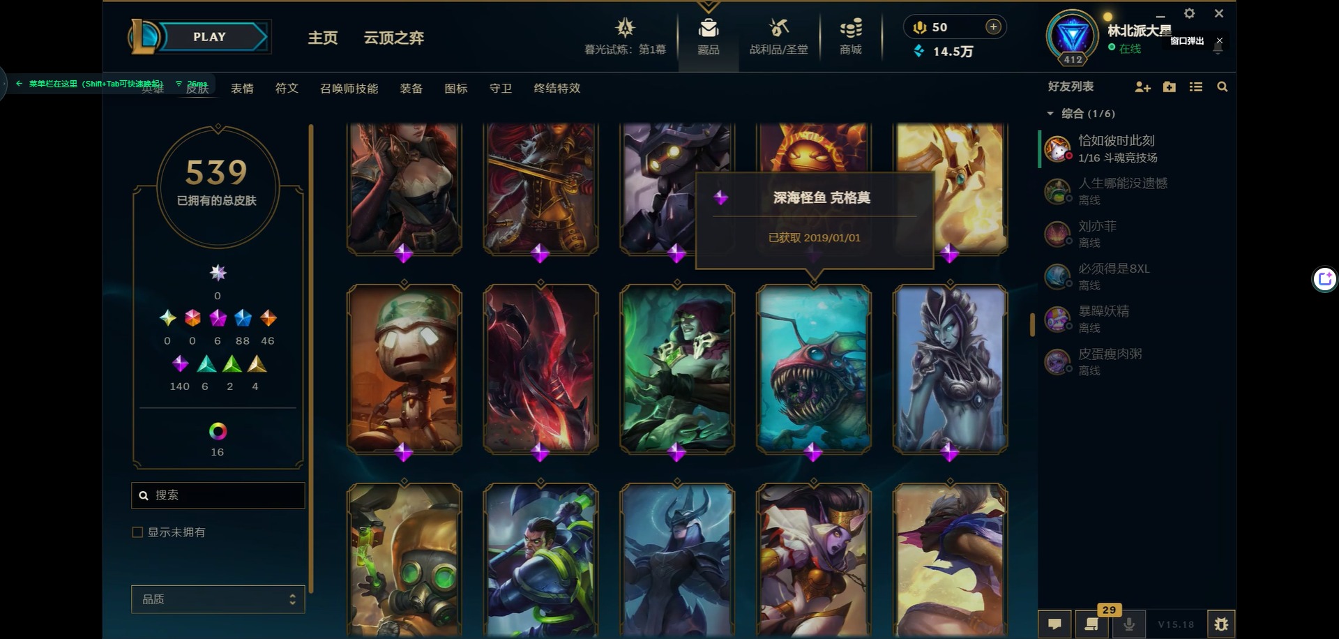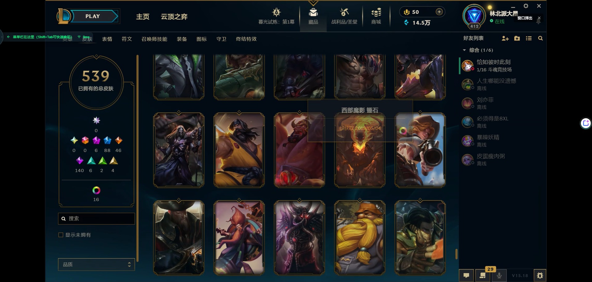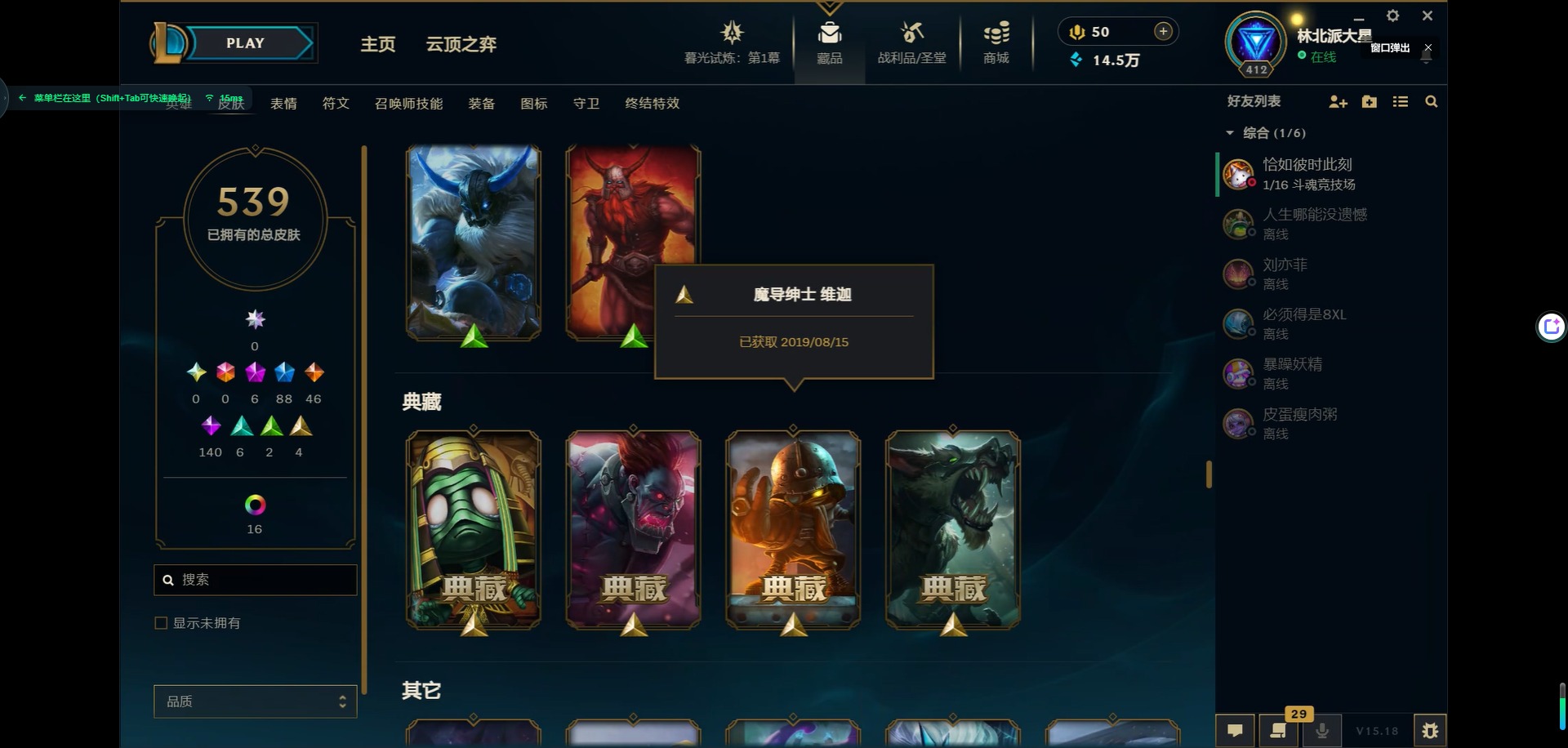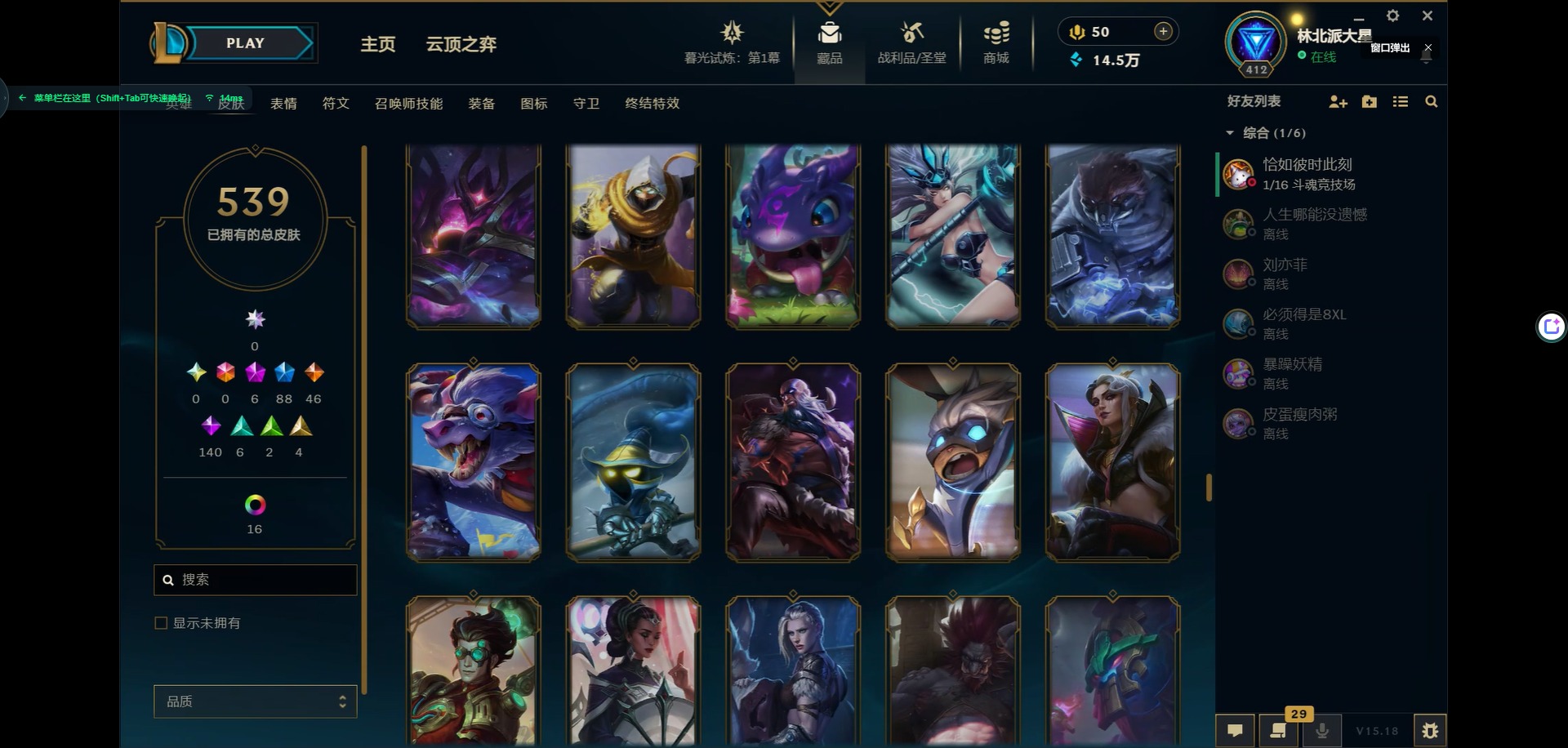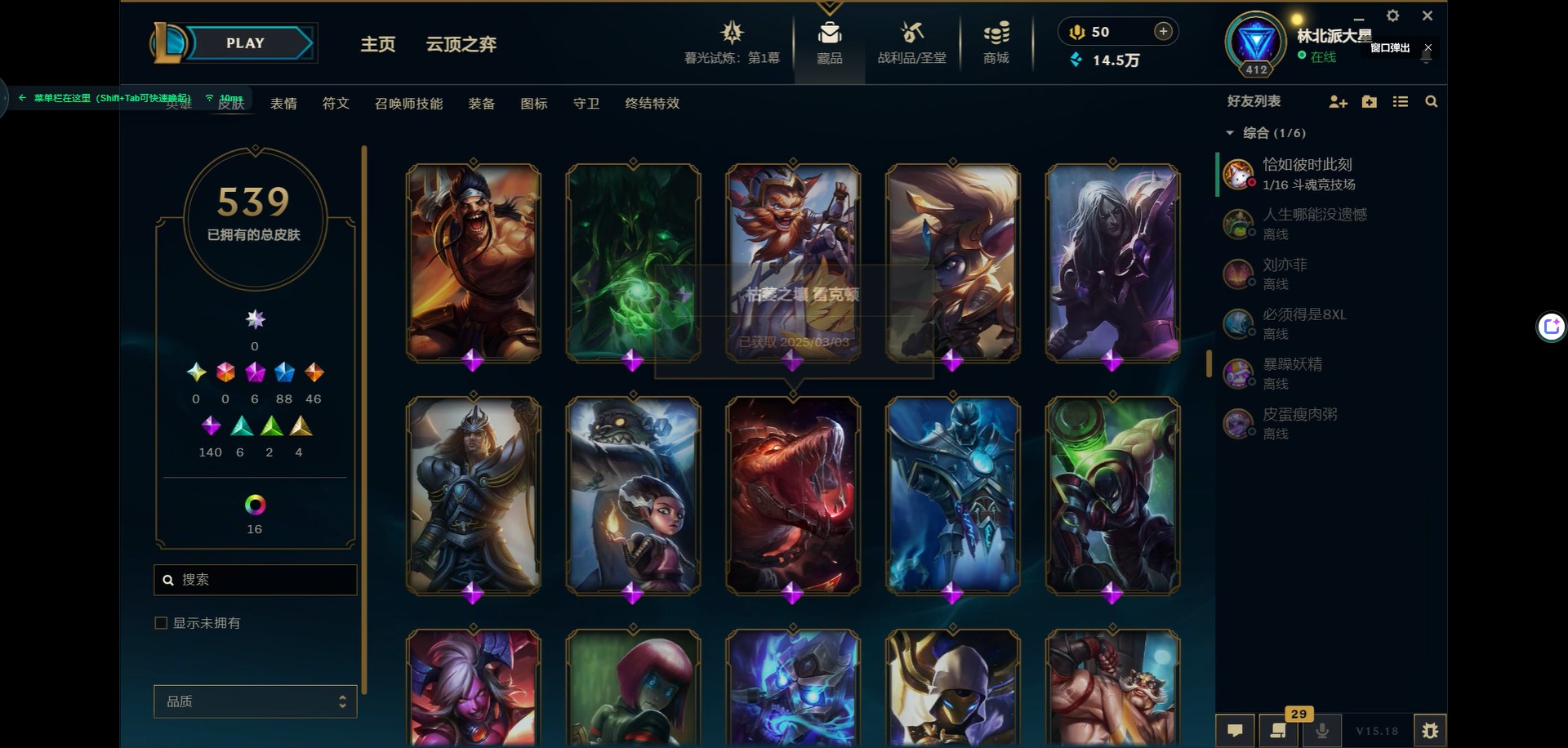 [11931870]6神话 88限定 46传说 140史诗 539皮肤 39炫彩 166英雄 可二次 可修改实名 优质装备:源代码 乐芙兰,防爆天使 凯尔,暗影 沃里克,巧克力工坊 波比,地底世界 崔斯特,电玩战魂 人马,都铎王朝 图奇,防爆士兵 炼金,钢铁之翼 凤凰,冠军之矛 滑板鞋,红桃杰克 崔斯特,机械迷城 加里奥,警用试作体K-9 内瑟斯,蒙多蒙多,密林猎手 提莫,女猎手 希维尔,诺斯费拉图 弗拉基米尔,破空枪骑 孙悟空,糖果使徒 费德提克,野兽猎人 德莱文,野兽猎人 瑟庄妮,野兽猎人 泰达米尔,勇者 阿狸,征服者 卡尔玛,卧虎藏龙 贾克斯,冠军掠夺者 卡兹克 凯旋圣装,弹幕天使 卡莎 炽天使·勇敢,冠军典狱长 锤石 凯旋圣装,无畏骑士 瑟庄妮 赤子初心,新卧虎藏龙 贾克斯,闭月之颜 貂蝉 炫金莲华,外星装甲 库奇,净雪之月 莫甘娜 冬虹,墨之影武者 亚索 金墨耀影,十五周年纪念 希维尔,心之钢 伊泽瑞尔 天纵才华,魔女 阿卡丽 虚荣,暗裔英雄 盖伦 海克斯:海克斯 嘉文四世 限定:舞会公主 安妮 情人节限定:觅心之翼 奎因 赛季限定皮:胜利女神 希维尔 冠军限定系列:S1FNC 酒桶,S1FNC 迦娜,S1FNC 嘉文四世,S2 暗杀星 蒙多,S2 暗杀星 努努,S2 暗杀星 慎,S3 SKT T1 劫,S4 SSW 锤石,S4 SSW 雷恩加尔,S4 SSW 泰隆,S4 SSW 图奇,S4 SSW 炼金,S5 SKT T1 瑞兹,S5 SKT T1 蜘蛛,S6 SKT T1 烬,S6 SKT T1 球女,S7 SSG 洛,S10 DWG 凯南 冰雪节限定:“主人不要我了” 阿木木,冰雪节 炼金,胡桃夹子 小丑,平安夜女神 娑娜,魄罗骑士 瑟庄妮,圣诞开心鬼 提莫,圣诞精灵 崔丝塔娜,圣诞狂欢 时光,圣诞老人 酒桶,圣诞糖果棒 厄运小姐,圣诞玩偶 波比,圣诞驯鹿 克格莫,冰雪节 茂凯,邪恶圣诞老人 维迦,幸福女神 乐芙兰,雪默丁格,英勇玩具兵船长 泳池派对:泳池派对 吉格斯,泳池派对 蕾欧娜,泳池派对 男枪,泳池派对 菲奥娜,泳池派对 雷克顿,泳池派对 李青,泳池派对 普朗克 万圣节限定:魅惑女巫 乐芙兰,鬼影森森 茂凯,鬼影重重 魔腾,海贼 瑞兹,死亡誓约 劫,无头骑士 人马 年限:点心宝贝 阿木木,龙年 克格莫,龙年 孙悟空,蛇年 卡西奥佩娅,马年 黛安娜,羊年 金克丝,
