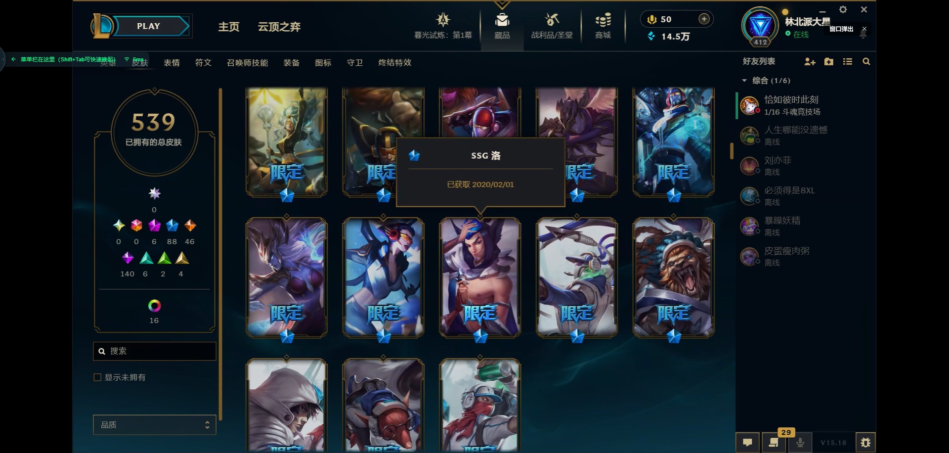 - PX_2068347-贵族等级: V7 英雄数: 123 皮肤数: 191 传说皮: 云鹰飞将,一念神魔,地狱火,山海·炽霜斩 限定皮: 李小龙,梁祝,神威,天狼绘梦者,大圣娶亲,傲雪梅枪,时之祈愿-瑶,山海·玄木吟