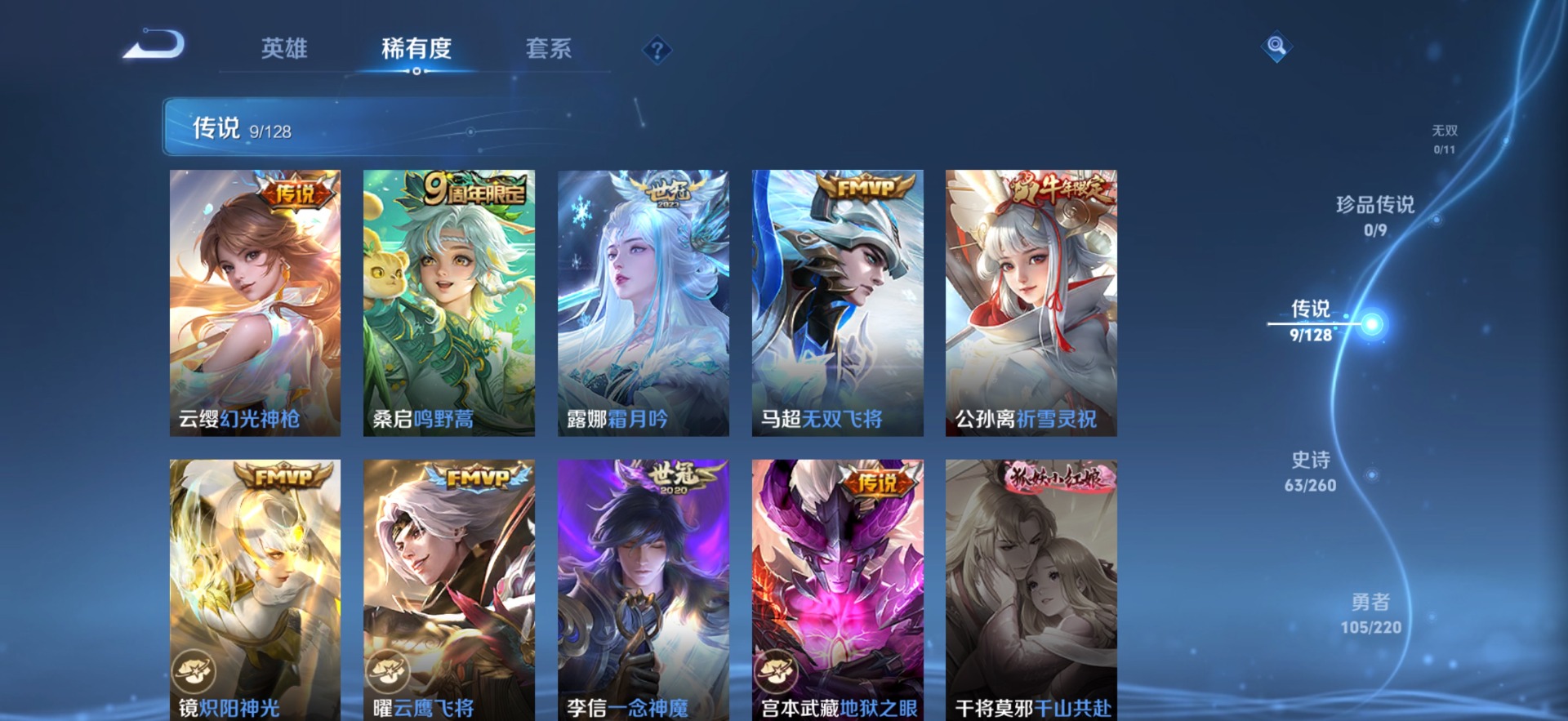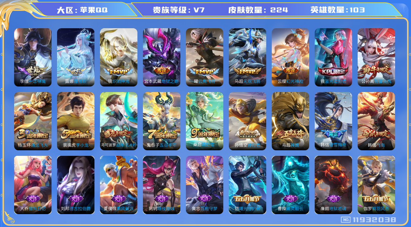 - [12002225]V7 1典藏 1珍品传说 9传说 125英雄 203皮肤 可修改实名 优质装备:鸣剑·曳影,怪盗基德,炽阳神光,山海·炽霜斩(李信年限) 传说皮:祥瑞亨通,幻光神枪 珍宝阁皮:万物之道,蔷薇恋人 限定皮:愿照·九州拓(澜年限),愿照·岁时盈(虞姬年限),愿照·山河定(司空震年限),鸣野蒿,遇见飞天,诗剑行,五谷丰年,李小龙,山海·玄木吟(马可年限) 史诗皮:星界战将,龙之律动,茶境仙,怒海争锋,破空之剑,蒙犽顽岩魄,百相守梦-百里守约,紫霞仙子,苍穹之光,电玩小子(小书包),黄金分割率,特工魅影,江河有灵,真我赫兹(镜),魅语,百解令(蒙犽),蒙恬荣光圣徽,偶像歌手,白蛇,电玩·爆裂旋风,末日机甲-吕布,乱世虎臣,节奏热浪,摇滚巨星,水果甜心,星夜王子,心灵骇客,功夫厨神,暗隐猎兽者,幽灵船长,鬼剑武藏,天秀·启明,缤纷独角兽,乘风破浪,逐浪之夏,月团寄思,水晶猎龙者,曙光守护者,箭羽风息,唤灵魅影,金属风暴,原初追逐者,圣诞狂欢,圣诞恋歌,鹰眼统帅,黎明之约,赏金猎手,无心,未来纪元-赵云