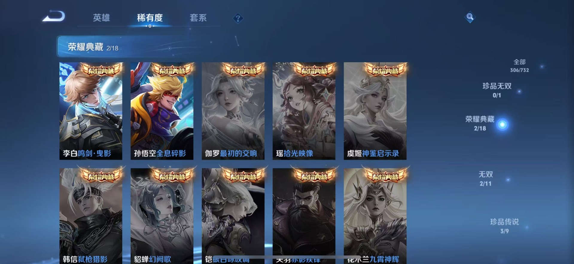 大乔白鹤梁神女,赵云龙胆,后羿辉光之辰,镜匿光追影者,诸葛亮时雨天司,公孙离祈雪灵祝,公孙离蜜橘之夏,司空震愿照·山河定,上官婉儿梁祝,花木兰默契交锋,马可波罗山海·玄木吟,女娲愿照·千秋盛,孙悟空孙行者,孙悟空至尊宝,芈月白晶晶,马超神威,雅典娜神奇女侠,赵云引擎之心,盘古冰霜神祇,妲己时之奇旅,妲己愿照·众生和,韩信逐梦之影,蔡文姬愿照·福禄聚,澜愿照·九州拓,虞姬愿照·岁时盈,关羽冰锋战神
