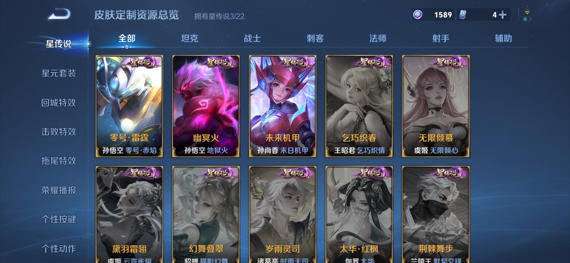 夏侯惇霜北刀,伽罗天狼溯光者,赵云百木心枪,干将莫邪冰霜恋舞曲,吕布御风骁将,诸葛亮时雨天司,裴擒虎李小龙,上官婉儿梁祝,艾琳陌上桑,桑启鸣野蒿,猪八戒猪悟能,孙悟空孙行者,芈月白晶晶,孙悟空至尊宝,百里玄策白虎志,韩信傲雪梅枪,韩信飞衡,虞姬霸王别姬