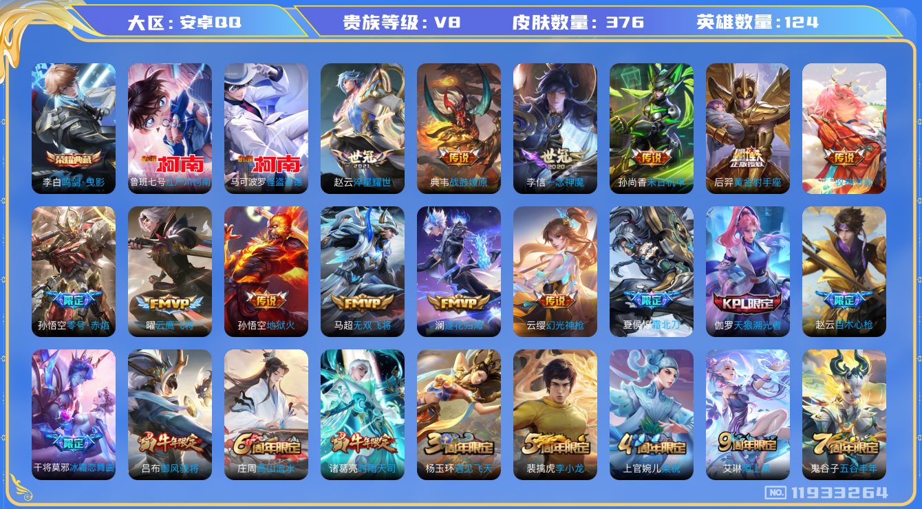 [11933264]V8 1典藏 2珍品传说 17传说 124英雄 376皮肤 可修改实名 优质装备:鸣剑·曳影,江户川柯南,怪盗基德,黄金射手座,云鹰飞将(小将军),一念神魔,末日机甲-孙尚香(绿蚂蚱),地狱火,零号·赤焰,淬星耀世,无双飞将,澜逐花归海,牧神诗旅 传说皮:典韦战鼓燎原,幻光神枪 珍宝阁皮:妄想食味,蔷薇恋人,女武神 限定皮:陌上桑,鸣野蒿,夏侯惇霜北刀,至尊宝,白虎志(电光耗子),傲雪梅枪,白晶晶,时雨天司(水龙头),飞衡(韩信年限),遇见飞天,高山流水,五谷丰年,梁祝,御风骁将(吕布年限),天狼溯光者,李小龙,霸王别姬-虞姬,孙行者,猪悟能,冰霜恋舞曲,百木心枪 史诗皮:鸭鸭历险记-刘禅,器灵·浮梦炉,谪仙醉月,龙之律动,百相守梦-周瑜,茶境仙,炽弈燎原,破空之剑,涂山红红,东方月初,蒙犽顽岩魄,埋骨钱,百相守梦-黄忠,紫霞仙子,苍穹之光,电玩小子(小书包),黄金分割率,特工魅影,千年之狐,永昼,魅语,蒙恬荣光圣徽,无限星赏官,冰冠公主,青蛇,偶像歌手,晚萤,电玩·爆裂旋风,暗夜猫娘,末日机甲-吕布,猫狗日记-孙策,猫狗日记-大乔,时之恋人-孙尚香,乱世虎臣,节奏热浪,修罗,女仆咖啡,摇滚巨星,水果甜心,绅士熊喵,天才门将,星夜王子,心灵骇客,时之奇旅-安琪拉,功夫厨神,德古拉伯爵,暗隐猎兽者,幽灵船长,鬼剑武藏,暗渊魔法,心灵战警,乐园奇幻夜,天秀·启明,舞动绿茵,地狱岩魂,诗语江南,纤云弄巧,繁星吟游(呼啦呼啦),拒霜思,缤纷独角兽,乘风破浪,逐浪之夏,水晶猎龙者,曙光守护者,箭羽风息,金属风暴,原初追逐者,圣诞狂欢,圣诞恋歌,鹰眼统帅,暗夜贵公子,魅力维加斯,黎明之约,未来纪元-赵云