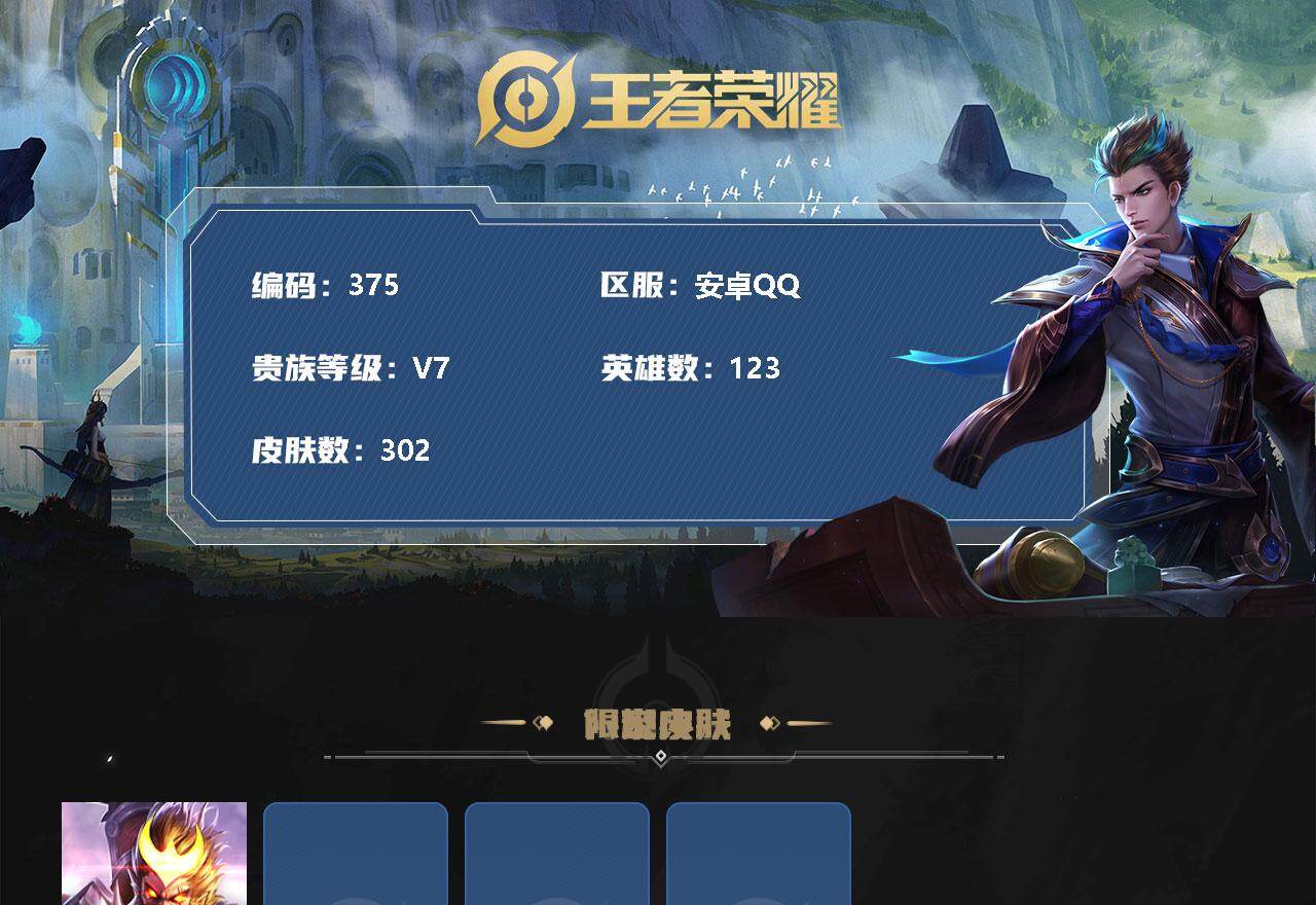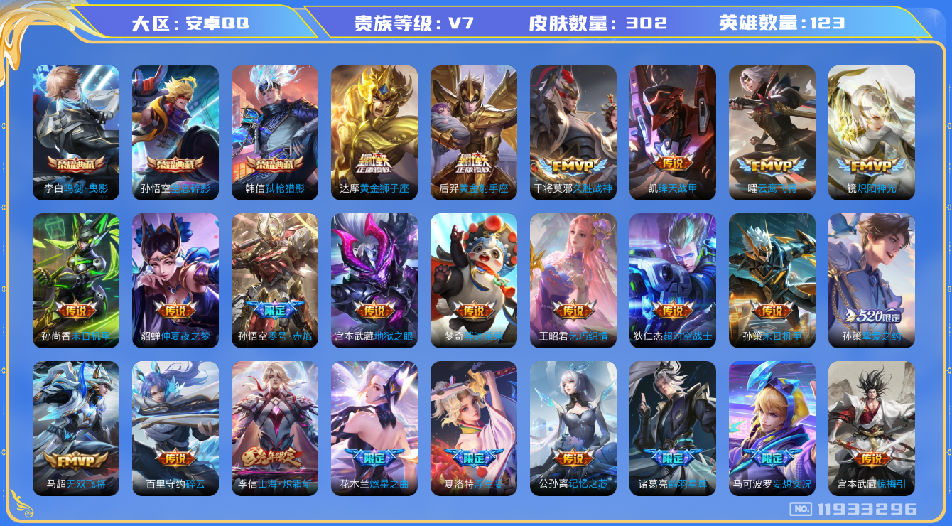 [11933296]【商品标题】:安卓Q-V7-永恒钻石II段位-123英雄-302皮肤-3典藏-0珍品无双-0无双-0珍品传说-35传说-86史诗