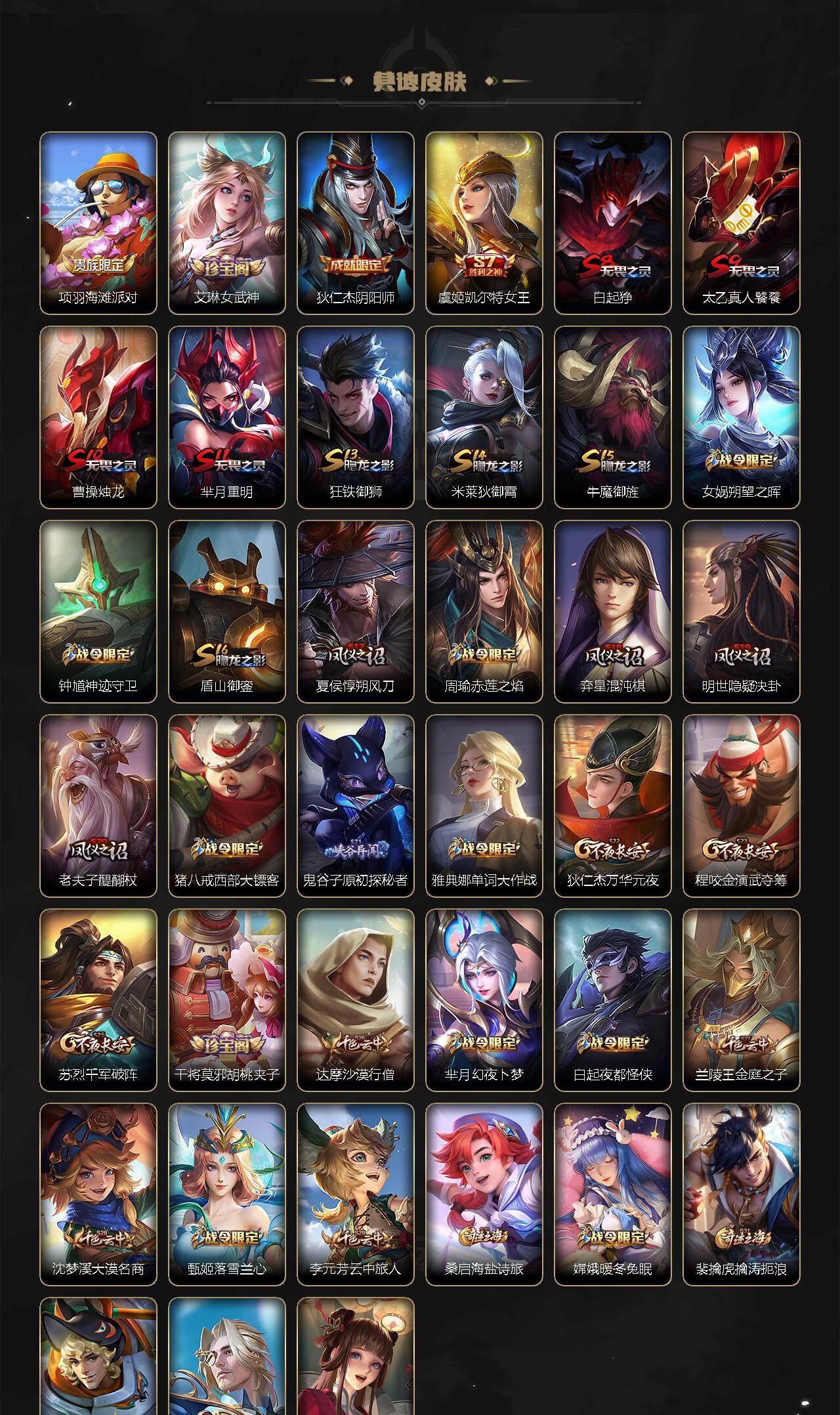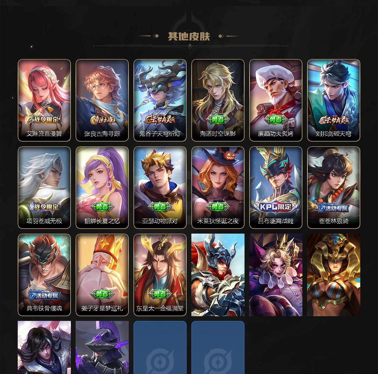 【限定皮肤】:白起狰,李白谪仙醉月,狄仁杰阴阳师,虞姬凯尔特女王,廉颇寅虎御盾,赵云皇家上将,赵云龙胆,赵云百木心枪,鲁班七号狮舞东方,鲁班七号寅虎瑞焰,钟无艳超时空战士,扁鹊奇幻香踪,白起夜都怪侠,芈月重明,芈月幻夜卜梦,周瑜赤莲之焰,元歌无心,夏侯惇朔风刀,甄姬落雪兰心,曹操烛龙,典韦蓝屏警告,马可波罗暗影游猎,马可波罗山海玄木吟,马可波罗妄想实况,狄仁杰魔术师,狄仁杰万华元夜,达摩沙漠行僧,项羽海滩派对,项羽无限倾心,老夫子醍醐杖,貂蝉逐梦之音,程咬金演武夺筹,韩信飞衡,韩信傲雪梅枪,兰陵王驯魔猎人,兰陵王金庭之子,花木兰燃星之曲,孙悟空至尊宝,孙悟空零号赤焰,孙悟空齐天大圣,牛魔御旌,后羿无尽星芒,刘备百相守梦,李元芳云中旅人,虞姬启明星使,钟馗神迹守卫,杨戬潮玩骑兵,女娲朔望之晖,女娲补天,干将莫邪冰霜恋舞曲,干将莫邪胡桃夹子,雅典娜单词大作战,蔡文姬繁星吟游,太乙真人饕餮,鬼谷子原初探秘者,鬼谷子五谷丰年,诸葛亮鹤羽星尊,黄忠火炮绅士,苏烈千军破阵,百里玄策白虎志,百里玄策原初追逐者,百里守约朱雀志,弈星混沌棋,沈梦溪大漠名商,明世隐疑决卦,明世隐吟游魔法,裴擒虎天狼狩猎者,裴擒虎李小龙,裴擒虎寅虎赤拳,裴擒虎擒涛扼浪,狂铁御狮,米莱狄御霄,云中君纤云弄巧,云中君时之祈愿,李信山海炽霜斩,伽罗太华,盾山御銮,孙策挚爱之约,猪八戒西部大镖客,嫦娥暖冬兔眠,西施玲珑珍味,鲁班大师探海日志,桑启海盐诗旅,夏