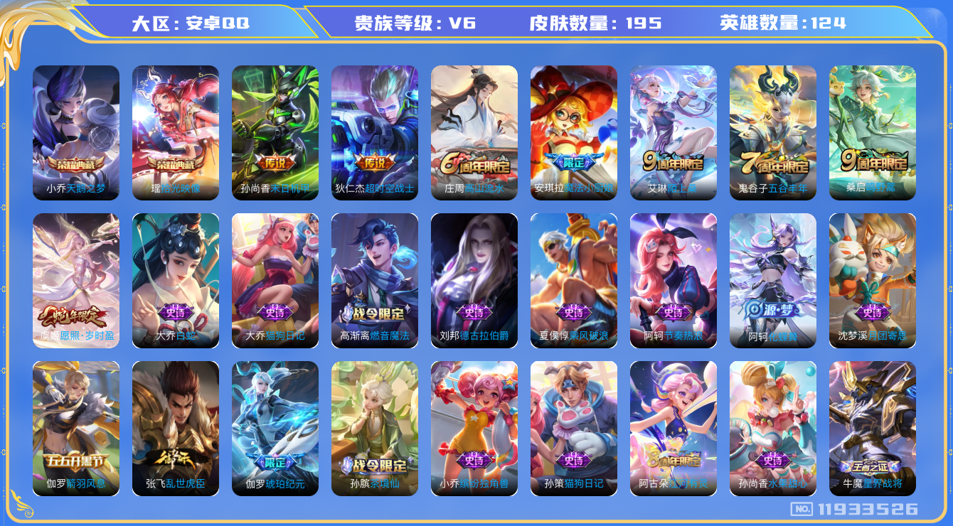 [11933526]V6 2典藏 4传说 124英雄 195皮肤 可修改实名 优质装备:天鹅之梦(小乔典藏),拾光映像(瑶典藏),末日机甲-孙尚香(绿蚂蚱),超时空战士-狄仁杰,涂山容容 珍宝阁皮:万物之道,女武神 限定皮:愿照·岁时盈(虞姬年限),陌上桑,鸣野蒿,魔法小厨娘,高山流水,五谷丰年 史诗皮:鸭鸭历险记-刘禅,器灵·浮梦炉,化蝶舞,星界战将,龙之律动,茶境仙,破空之剑,战舞者,琥珀纪元伽罗,蔬乡物语(鲁班七号),遇见神鹿,黄金分割率,特工魅影,江河有灵,真我赫兹(百里守约),百解令(蒙犽),高渐离燃音魔法,蒙恬荣光圣徽,冰冠公主,偶像歌手,白蛇,晚萤,电玩·爆裂旋风,龙骑士(小龙虾),猫狗日记-孙策,猫狗日记-大乔,乱世虎臣,节奏热浪,女仆咖啡,水果甜心,天才门将,心灵骇客,德古拉伯爵,鬼剑武藏,心灵战警,天秀·启明,舞动绿茵,纤云弄巧,繁星吟游(呼啦呼啦),拒霜思,缤纷独角兽,乘风破浪,逐浪之夏,月团寄思,水晶猎龙者,箭羽风息,唤灵魅影,金属风暴,鹰眼统帅,暗夜贵公子,魅力维加斯,黎明之约,无心,未来纪元-赵云