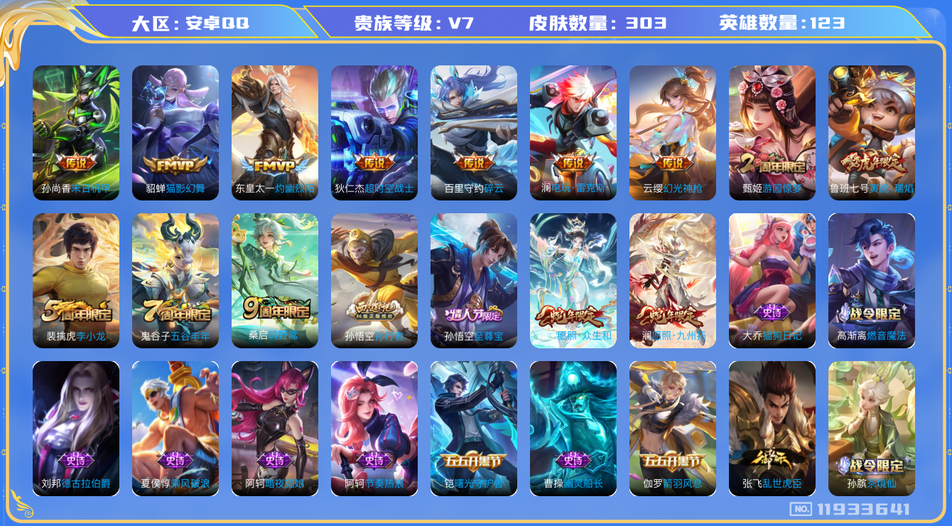 [11933641]V7 11传说 123英雄 303皮肤 可修改实名 优质装备:猫影幻舞,末日机甲-孙尚香(绿蚂蚱),超时空战士-狄仁杰,碎云,电玩·雷克斯,灼幽烈阳 传说皮:幻光神枪 珍宝阁皮:妄想食味,玩趣恶龙 限定皮:愿照·九州拓(澜年限),愿照·众生和(妲己年限),鸣野蒿,至尊宝,五谷丰年,游园惊梦,李小龙,孙行者,寅虎·瑞焰(虎皮蛋子) 史诗皮:鸭鸭历险记-刘禅,苍鳞隐世,龙之律动,雪豹·霜爪,百相守梦-周瑜,茶境仙,蔬乡物语(鲁班七号),百相守梦-百里守约,紫霞仙子,特工魅影,江河有灵,匿光侦查者,百解令(蒙犽),高渐离燃音魔法,青蛇,电玩·爆裂旋风,暗夜猫娘,末日机甲-吕布,猫狗日记-孙策,猫狗日记-大乔,乱世虎臣,节奏热浪,女仆咖啡,摇滚巨星,水果甜心,绅士熊喵,天才门将,星夜王子,心灵骇客,功夫厨神,德古拉伯爵,幽灵船长,鬼剑武藏,心灵战警,拒霜思,缤纷独角兽,乘风破浪,逐浪之夏,水晶猎龙者,曙光守护者,箭羽风息,金属风暴,圣诞恋歌,鹰眼统帅,赏金猎手,无心,未来纪元-赵云