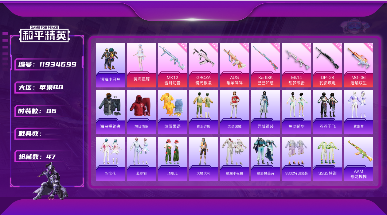- PX_2083069- 苹果手Q-9王牌印记-5粉装-8特效枪-0载具-52761热力值-142套装-172枪皮-2卓越印记-1传奇印记 【5粉装】,幻彩电音,星穹咏叹调,智能音符,守护天翼,数码大师 【8特效枪】AKM-绿萝繁花-5级 M416-电玩时刻-5级 GROZA-镜光银凌-5级 AUG-暖羊咩咩-5级 Kar98K-巳巳如意-5级 UMP45-量子极限-5级 AKS-74U-星穹咏叹调