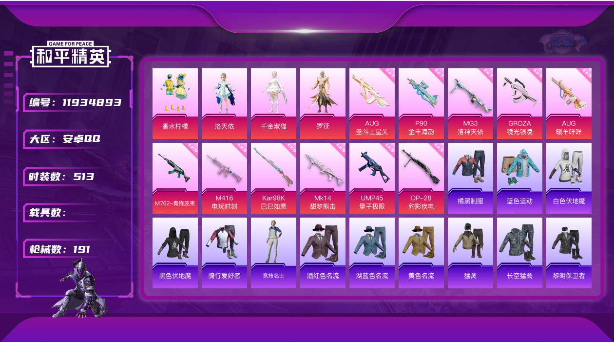 [11934893]4粉装 11特效枪 15印记 可二次 可修改实名 身法装备:Mark.06(新蓝螳螂) 优质装备:MG3洛神天依,香水柠檬,洛天依,七级MG3-洛神天依,M416电玩时刻,UMP45量子极限,P90-金丰海韵,七级P90-金丰海韵,M762-青锋波束,千金淑猫,GROZA-镜光银凌,AUG-暖羊咩咩,AUG-圣斗士星矢,七级AUG-圣斗士星矢,MK14-甜梦熊击,罗征,Kar98K-巳巳如意 稀有枪皮:DP-28-豹影疾电 五级特效枪:五级M762-青锋波束,五级UMP45-量子极限,五级GROZA-镜光银凌,五级Kar98K-巳巳如意,五级DP-28-豹影疾电,五级MK14-甜梦熊击,五级AUG-暖羊咩咩,五级M416-电玩时刻 紫色装扮:田园牧歌,轻风白浪,SS22特训,SS23特训,娇憨猪猪,萌趣咩咩,SS21特训,绚烂繁星,SS31特训套装,人气偶像,军械专家,旭日情侣,SS30特训套装,云朵鹅,彩虹兔,雪绒豹,SS33特训套装,青涩时光,顶瓜瓜,SS20特训,SS15特训,SS16特训,SS13特训,SS14特训,萌趣颜团子,SS19特训,吉莉礼服,电音精灵,天籁歌者,瑞龙福将,团圆交子,SS17特训,SS18特训,酒红色名流,野性战心,长空猛禽,霓虹街区,缤纷果语,蓝色守护者,蓝色运动,虎虎生威吉莉,超能勇士,蓝海鲸歌,骑行爱好者,魅力单车,黄色名流,黎明保卫者,黑色伏地魔,龙的传人,龟仙人,冰河战士,龙魂突击队,蝶变,香桃花海,极速红龙,柠萌假日,橘黑制服,沙漠兵团,海岛探路者,深蓝色名流,滨海假日,坚韧舞者,夏日音浪,幻世战舞者,战地督导,探宝勇士,湖蓝色名流,滨海厨神,绮丽涂鸦,白色伏地魔,破蛋小黄鸡,福星高照,空投萌叽,王牌教练,牛气冲天,灼焰舞者,炫蓝之夏,热血青春,牛气满满,猛禽,小熊娃娃,雏菊兔兔,萝兰蝴蝶,SS29特训,狂花道·雅典娜,星途旅人,白光莹,纯真浪花,热情海星,曼妙人鱼,SS28特训,Mark.06(新蓝螳螂),冰公主,异域银装,石蕴玉辉,鱼渊荷华,玉兔迎春,燕燕于飞,巳巳如意,森林游猎者,青团波波,糖糖葫芦,棉花软糖,竞技名士,摩登魅猫,街头风暴,许七安,银尘,情公主,果汁能量,惊鸿侠骨,SS24特训(SS24特训套装),SS25特训,锦衣飞扬,SS27特训,日照花林,SS26特训,智谋强哥,大橘大利,SS12特训,SS