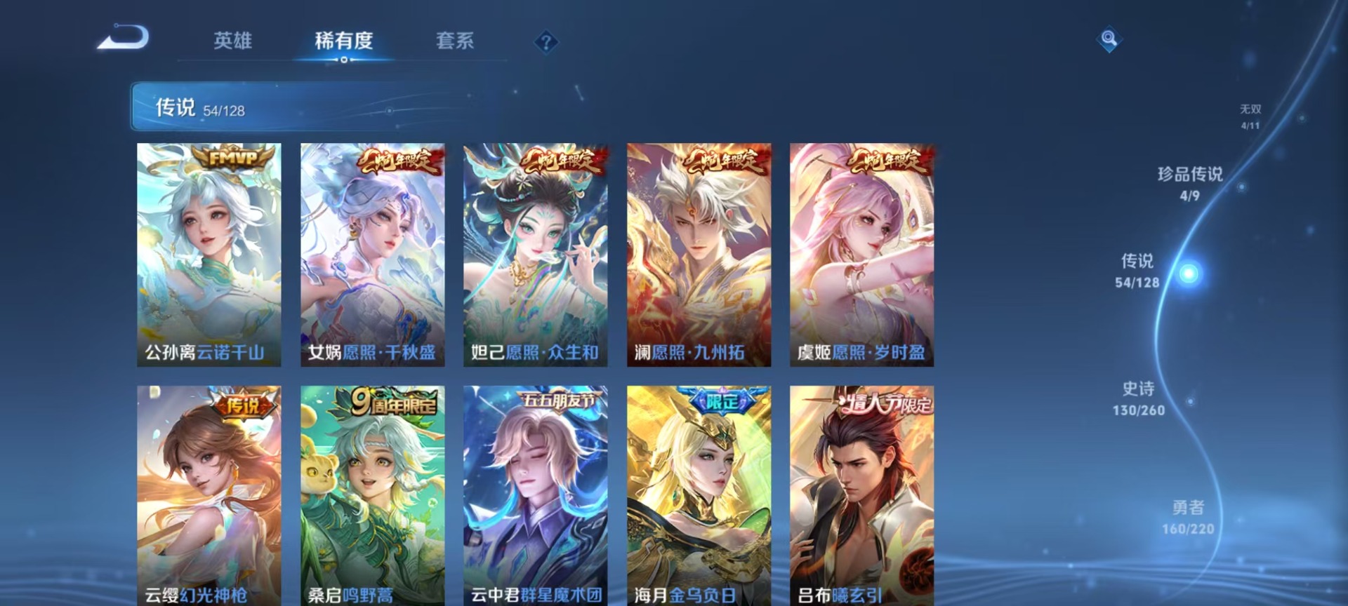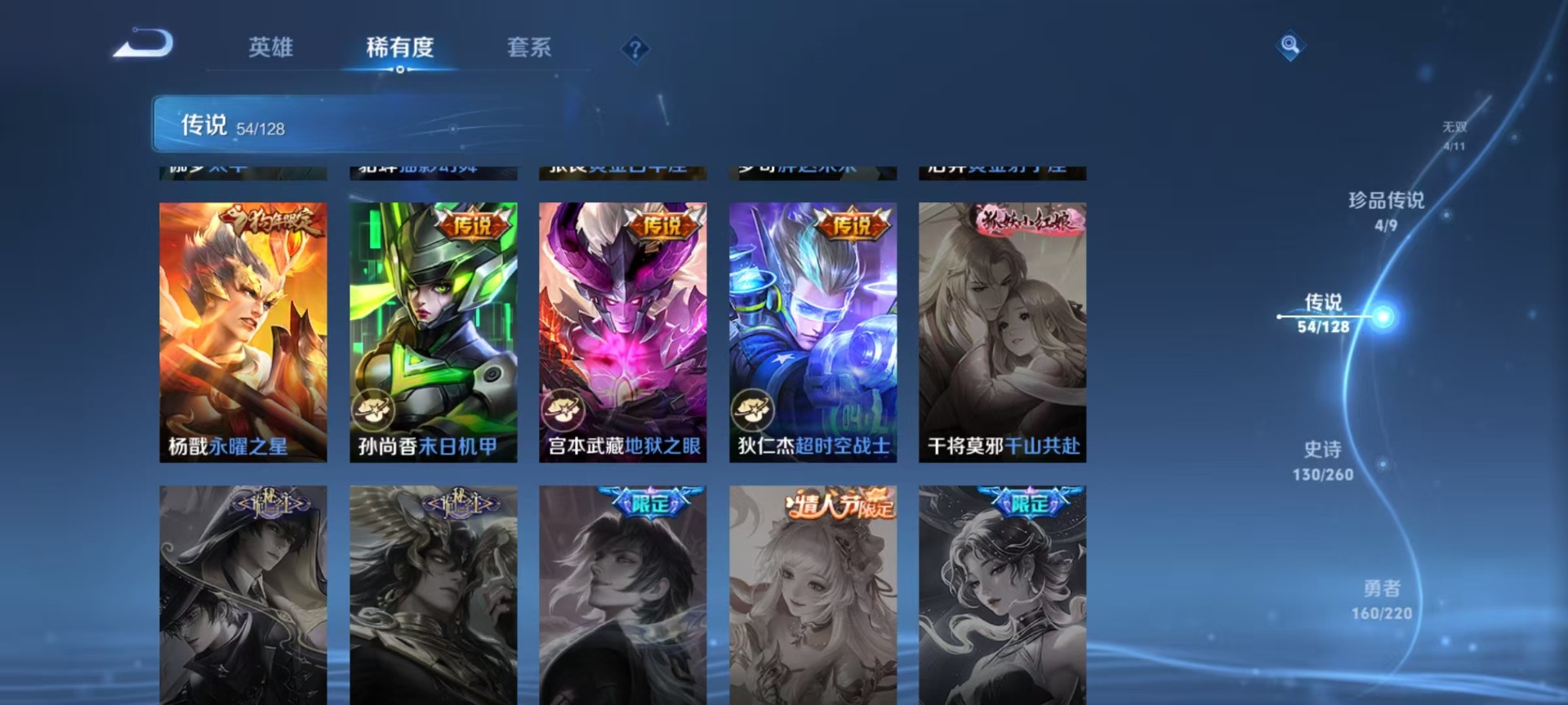 - [11571944]V8 1典藏 1无双 10传说 124英雄 190皮肤 可修改实名 优质装备:鸣剑·曳影,碎月剑心(李白无双),黄金射手座,云鹰飞将(小将军),炽阳神光,淬星耀世 珍宝阁皮:胡桃夹子,玩趣恶龙 限定皮:鸣野蒿,至尊宝,凤求凰(白切鸡),凤凰于飞,傲雪梅枪,高山流水,诗剑行,五谷丰年,李小龙,孙行者,天魔缭乱,寅虎·赤拳(老虎年限) 史诗皮:星界战将,龙之律动,百相守梦-周瑜,百相守梦-黄忠,紫霞仙子,苍穹之光,电玩小子(小书包),黄金分割率,特工魅影,千年之狐,江河有灵,蒙恬荣光圣徽,偶像歌手,电玩·爆裂旋风,暗夜猫娘,末日机甲-吕布,猫狗日记-孙策,节奏热浪,修罗,摇滚巨星,水果甜心,绅士熊喵,天才门将,星夜王子,心灵骇客,功夫厨神,德古拉伯爵,暗隐猎兽者,幽灵船长,鬼剑武藏,心灵战警,舞动绿茵,地狱岩魂,缤纷独角兽,乘风破浪,逐浪之夏,水晶猎龙者,曙光守护者,箭羽风息,金属风暴,原初追逐者,圣诞狂欢,圣诞恋歌,鹰眼统帅,暗夜贵公子,魅力维加斯,黎明之约
