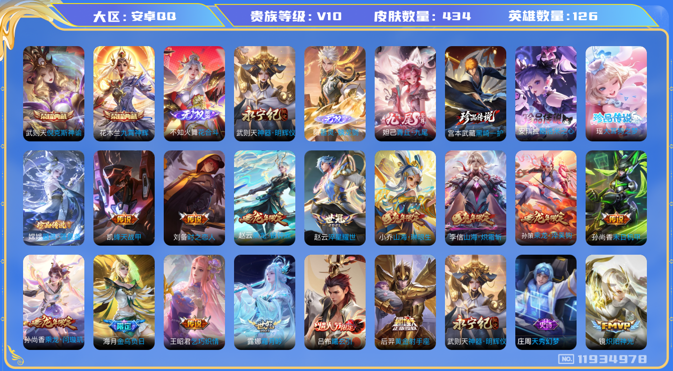 [11934978]V10 2典藏 4无双 4珍品传说 54传说 126英雄 434皮肤 典藏英雄武则天 女号 可修改实名 优质装备:倪克斯神谕(宇宙婆娘),九霄神辉(木兰典藏),神器·明辉仪,青丘·九尾(妲己无双),花合斗,器灵·螭龙剑,器灵·落星盏,酷洛米之心,大耳狗之梦,黑崎一护,黄金射手座,云鹰飞将(小将军),绛天战甲(鸡嘴战神),黄金白羊座,猫影幻舞,炽阳神光,末日机甲-孙尚香(绿蚂蚱),地狱之眼,飞鸢探春,音你心动-周瑜,胖达荣荣,乞巧织情,时之恋人-刘备(电焊工),游龙清影(小青龙),淬星耀世,超时空战士-狄仁杰,无双飞将,碎云,天秀幻梦,神器·明辉仪,山海·炽霜斩(李信年限),山海·琳琅生(小乔年限),山海·苍雷引(电光曜子),浮生妄,青丘·九尾,电玩·雷克斯,霜月吟,艾琳觅芳踪,琥珀纪元马超,金乌负日,云中君群星魔术团 传说皮:乘龙·问璇玑(孙尚香年限),乘龙·铭钟鼎(赵云年限),乘龙·淬吴钩(孙策年限),貂蝉曦玄引,吕布曦玄引,云诺千山,幻光神枪 珍宝阁皮:妄想食味,万物之道,蔷薇恋人 限定皮:愿照·九州拓(澜年限),愿照·岁时盈(虞姬年限),愿照·众生和(妲己年限),愿照·千秋盛(女娲年限),逐霄战戟,陌上桑,鸣野蒿,太华(伽罗年限),异界灵契(白毛香),前尘镜,绯月行,时之彼端,白晶晶,时雨天司(水龙头),神威(电光马子),飞衡(韩信年限),山海·碧波行(瑶年限),无限倾心-项羽,至美·乘鲤谣,影龙天霄,遇见飞天,高山流水,诗剑行,无限倾心-虞姬,齐天大圣,五谷丰年,冰锋战神,游园惊梦,梁祝,烈魂,祈雪灵祝(雪兔子),李小龙,朱雀志(守约年限),永曜之星,一生所爱,寅虎·瑞焰(虎皮蛋子),寅虎·心曲(虎婆),神器·万象笔,山海·玄木吟(马可年限),冰霜神祇 史诗皮:器灵·浮梦炉,化蝶舞,龙之律动,石田雨龙,怒海争锋,破空之剑,琥珀纪元伽罗,上官婉儿群星魔术团,蔬乡物语(鲁班七号),乘龙·聚宝船(安琪拉年限),乘龙·忆丹青(大乔年限),百相守梦-百里守约,百相守梦-黄忠,紫霞仙子,苍穹之光,电玩小子(小书包),黄金分割率,特工魅影,千年之狐,永昼,江河有灵,雪夜绮愿(周瑜),魅语,百解令(蒙犽),高渐离燃音魔法,蒙恬荣光圣徽,无限星赏官,匿光破解者,冰冠公主,青蛇,偶像歌手,白蛇,晚萤,电玩·爆裂旋风,暗夜猫娘,龙骑士(小龙虾),末日机甲-吕布,