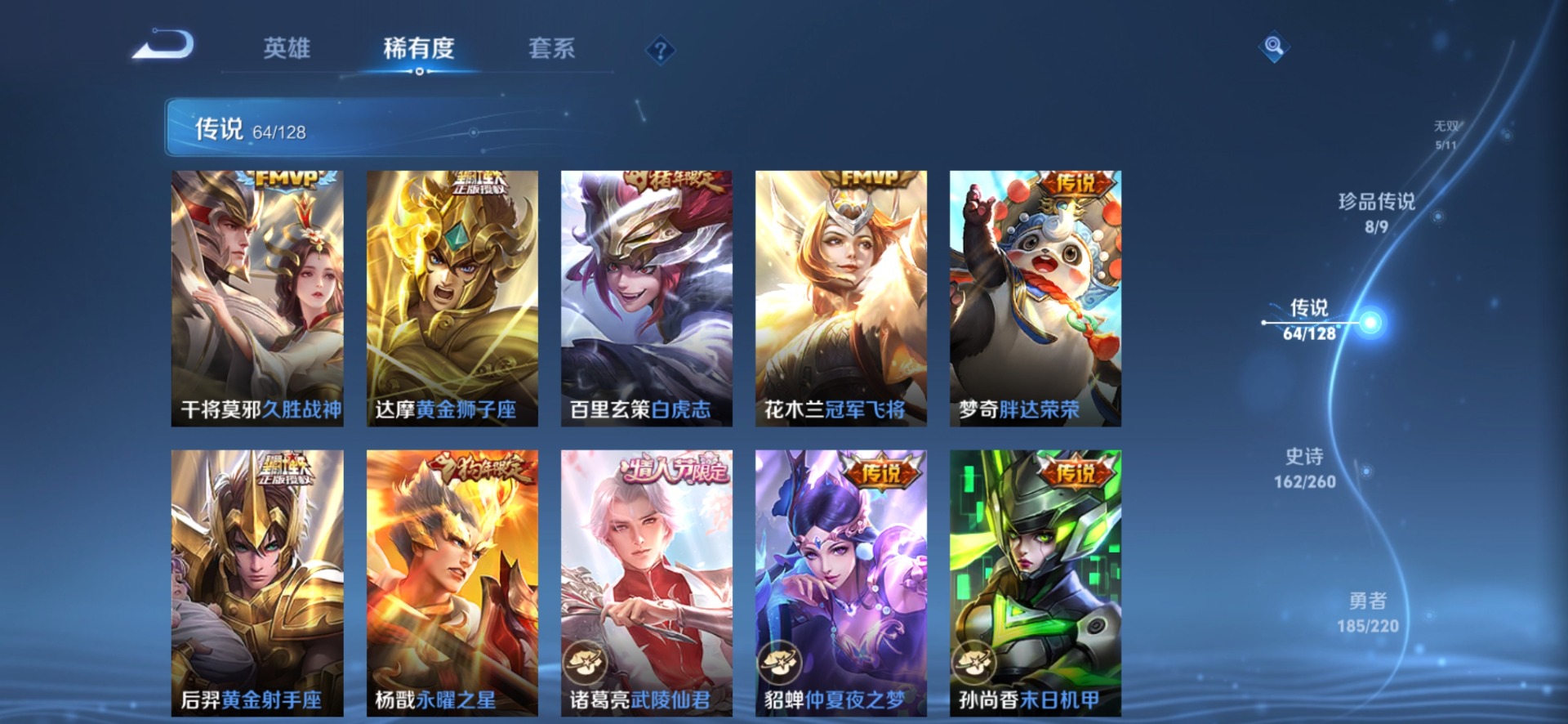 - PX_2095067-实名: 可修改 贵族等级: V7 英雄数: 124 皮肤数: 114 传说皮: 冠军飞将,黄金白羊座,猫影幻舞,超时空战士-狄仁杰,山海·苍雷引,乘龙·淬吴钩 限定皮: 御风骁将,龙胆,烈魂,孙行者,五谷丰年,神器·万象笔,山海·玄木吟
