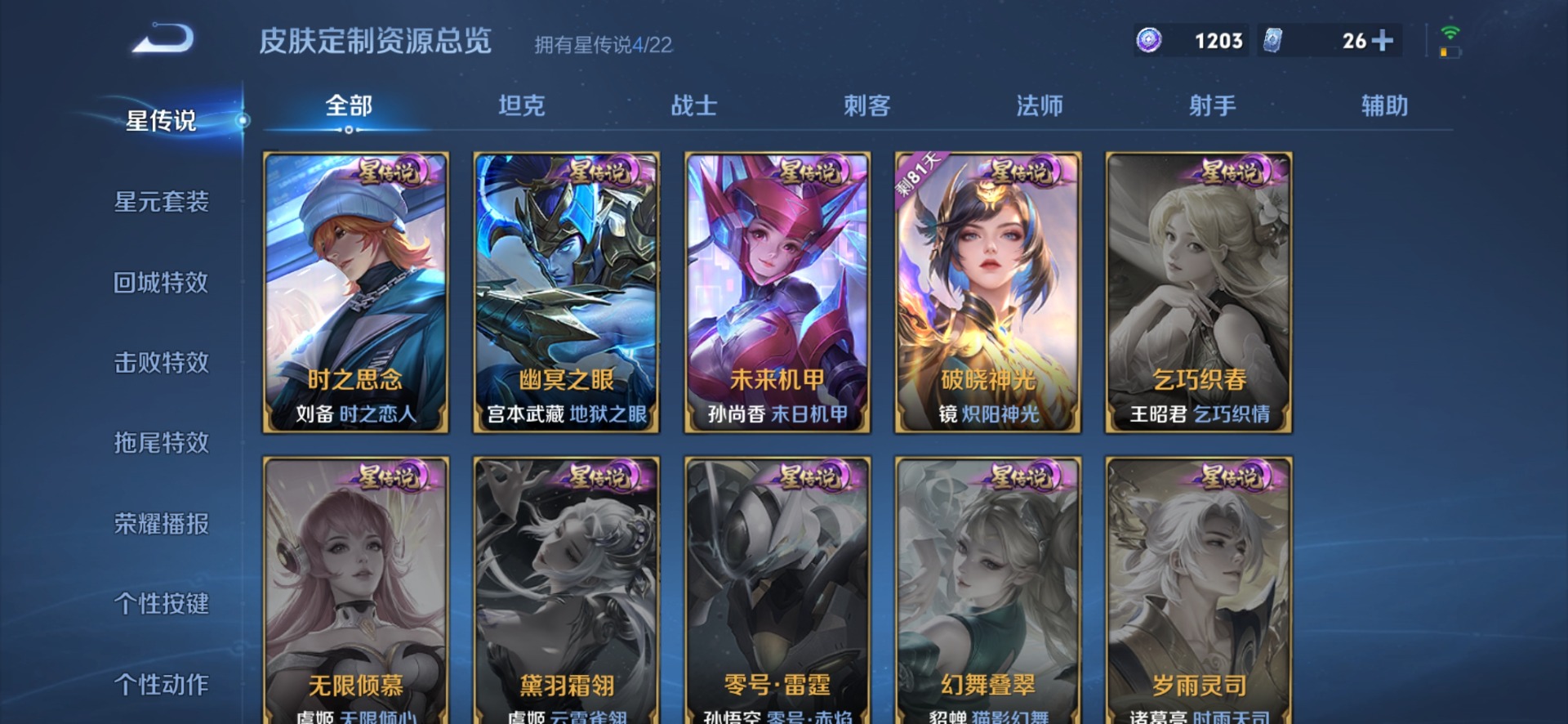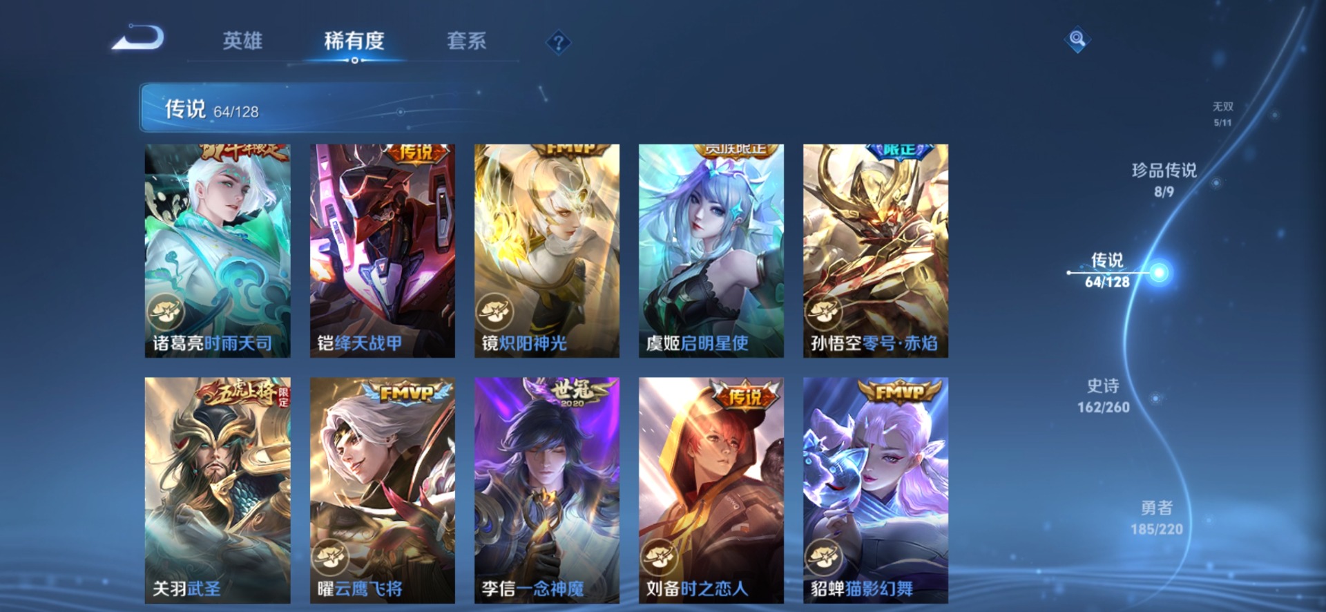 大乔白鹤梁神女,哪吒逐梦之翼,甄姬至美·化雀舞,廉颇寅虎·御盾,曹操天狼征服者,伽罗天狼溯光者,张飞虎魄,赵云百木心枪,不知火舞绯月行,鲁班七号乒乒小将,露娜启示之音,后羿辉光之辰,诸葛亮时雨天司,公孙离玉兔公主,司空震愿照·山河定,公孙离蜜橘之夏,裴擒虎李小龙,上官婉儿梁祝,上官婉儿天狼绘梦者,李白诗剑行,马可波罗山海·玄木吟,马可波罗深海之息,西施至美·乘鲤谣,桑启鸣野蒿,猪八戒猪悟能,女娲愿照·千秋盛,孙悟空孙行者,孙悟空大圣娶亲,孙悟空至尊宝,百里玄策白虎志,马超神威,赵云引擎之心,盘古冰霜神祇,妲己愿照·众生和,韩信傲雪梅枪,韩信飞衡,韩信逐梦之影,百里守约朱雀志,蔡文姬愿照·福禄聚,瑶山海·碧波行,澜愿照·九州拓,虞姬愿照·岁时盈,关羽武圣