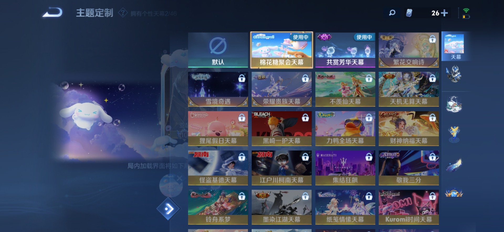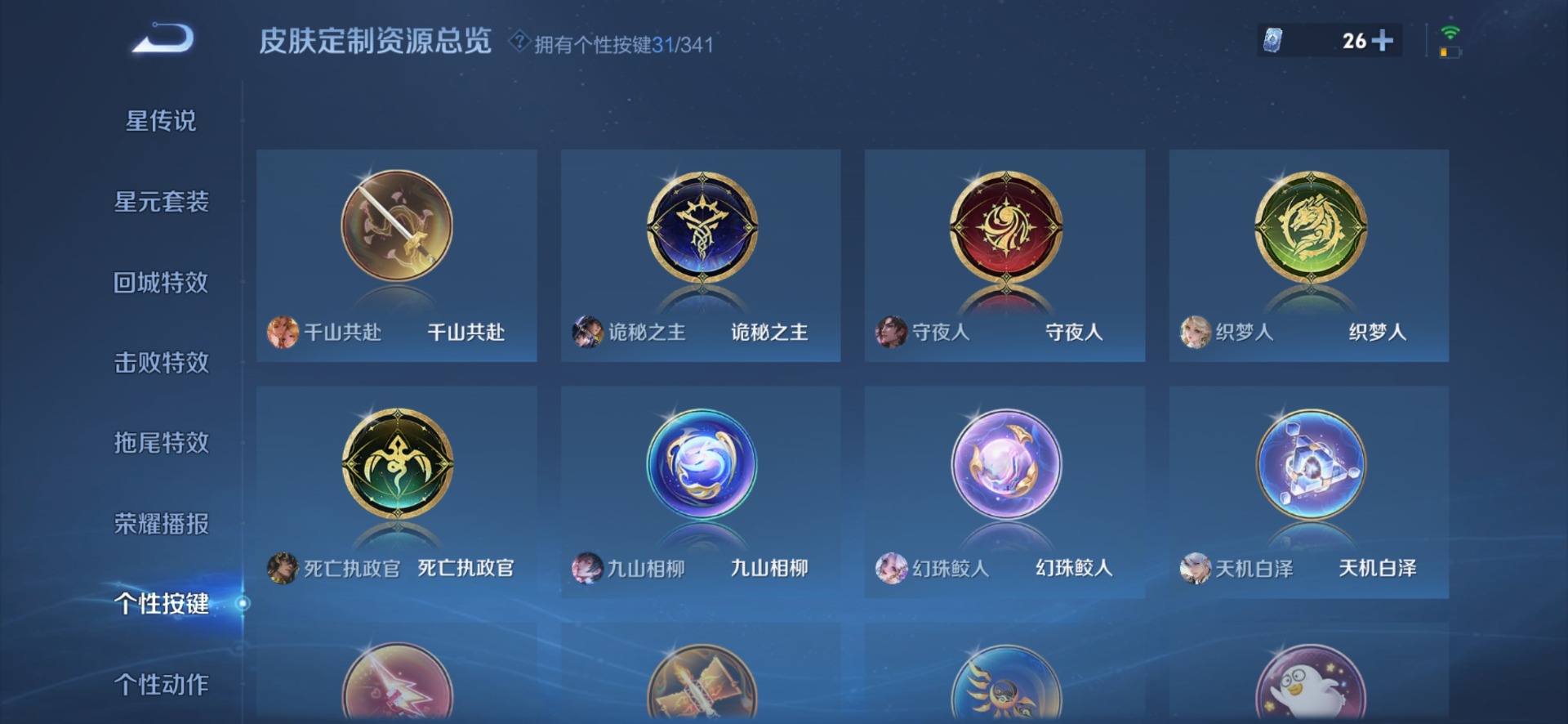 刘备时之恋人,铠绛天战甲,赵云淬星耀世,干将莫邪久胜战神,典韦战鼓燎原,小乔音你心动,李信一念神魔,孙尚香音你闪耀,孙策末日机甲,孙策挚爱之约,达摩黄金狮子座,王昭君乞巧织情,后羿千劫归真,镜炽阳神光,周瑜音你心动,公孙离记忆之芯,杨玉环星之鸣奏,亚连落雪白狼,宫本武藏惊梅引,裴擒虎祥瑞亨通,貂蝉猫影幻舞,夏洛特浮生妄,艾琳觅芳踪,孙悟空零号·赤焰,曜云鹰飞将,曜李逍遥,马超无双飞将,百里守约碎云,澜逐花归海,云缨幻光神枪