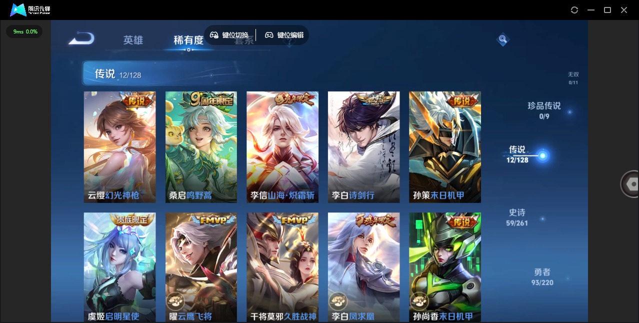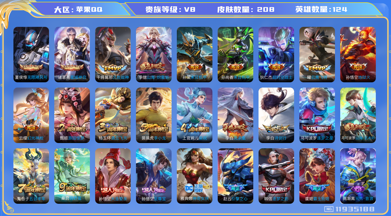 [11935188]V8 2典藏 12传说 124英雄 208皮肤 可修改实名 优质装备:无限飓风号(高达),星域神启(倪克斯贼亮),云鹰飞将(小将军),久胜战神,末日机甲-孙尚香(绿蚂蚱),地狱火,超时空战士-狄仁杰,末日机甲-孙策,山海·炽霜斩(李信年限),涂山容容 传说皮:幻光神枪 珍宝阁皮:妄想食味 限定皮:鸣野蒿,至尊宝,凤求凰(白切鸡),遇见飞天,诗剑行,五谷丰年,游园惊梦,梁祝,逐梦之星,李小龙,逐梦之影,霸王别姬-虞姬,大圣娶亲,引擎之心,神奇女侠,山海·玄木吟(马可年限) 史诗皮:紫霞仙子,黄金分割率,特工魅影,千年之狐,魅语,百解令(蒙犽),冰冠公主,晚萤,末日机甲-吕布,乱世虎臣,节奏热浪,修罗,女仆咖啡,水果甜心,天才门将,星夜王子,心灵骇客,功夫厨神,德古拉伯爵,暗隐猎兽者,幽灵船长,鬼剑武藏,心灵战警,缤纷独角兽,乘风破浪,逐浪之夏,水晶猎龙者,曙光守护者,金属风暴,圣诞狂欢,圣诞恋歌,鹰眼统帅,魅力维加斯,赏金猎手,天秀·音浪,千筹问战,无心,未来纪元-赵云