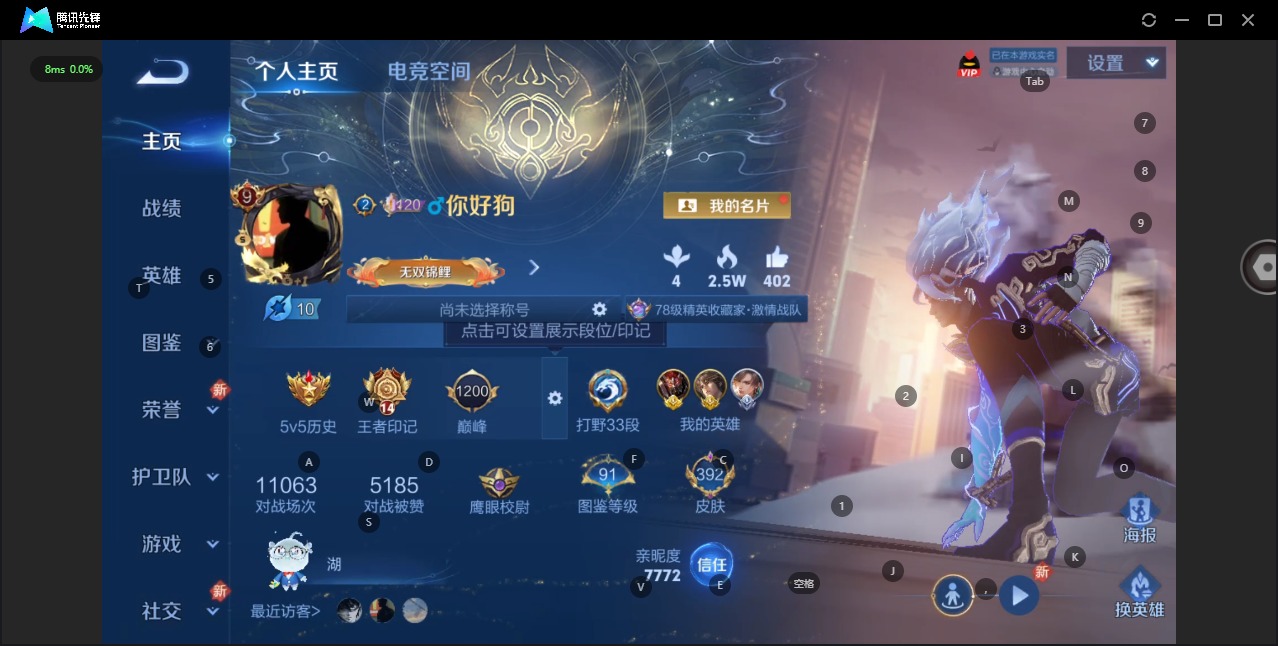 - [11296222]V4 3传说 85英雄 50皮肤 可修改实名 优质装备:云鹰飞将(小将军),一念神魔 限定皮:鸣野蒿 史诗皮:特工魅影,水果甜心,鬼剑武藏,曙光守护者,金属风暴,鹰眼统帅,魅力维加斯