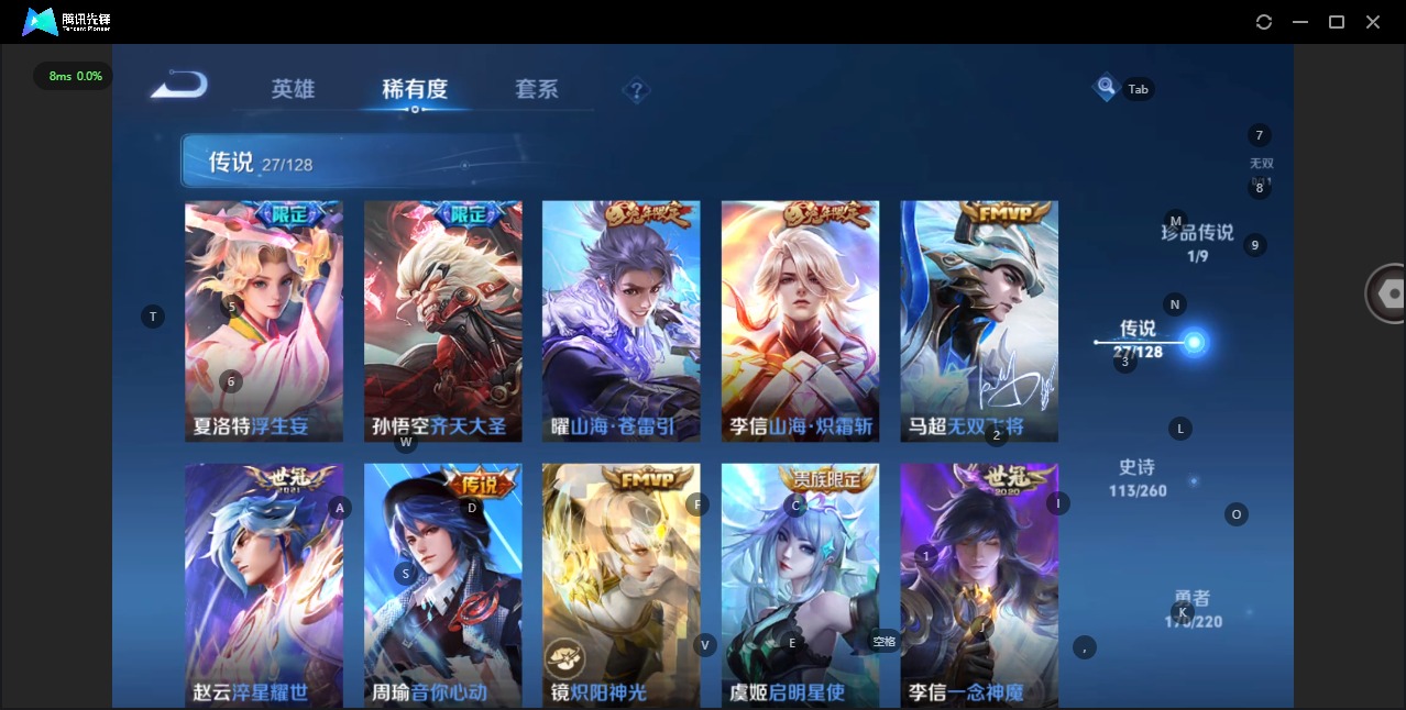 - [11579210]V7 3传说 122英雄 211皮肤 可修改实名 传说皮:零号·赤焰,末日机甲-孙尚香(绿蚂蚱) 珍宝阁皮:蔷薇恋人 限定皮:鸣野蒿,至尊宝,飞衡(韩信年限),五谷丰年,青龙志(铠年限),冰锋战神,李小龙,如梦令-后羿,冰霜恋舞曲 史诗皮:紫霞仙子,白龙吟,千年之狐,江河有灵,冰冠公主,暗夜猫娘,猫狗日记-孙策,乱世虎臣,修罗,水果甜心,天才门将,功夫厨神,德古拉伯爵,暗隐猎兽者,纤云弄巧,繁星吟游(呼啦呼啦),乘风破浪,逐浪之夏,曙光守护者,箭羽风息,原初追逐者,圣诞恋歌,鹰眼统帅,魅力维加斯,黎明之约