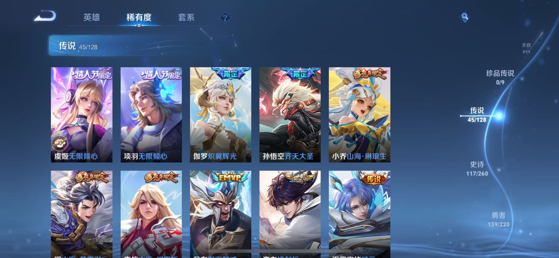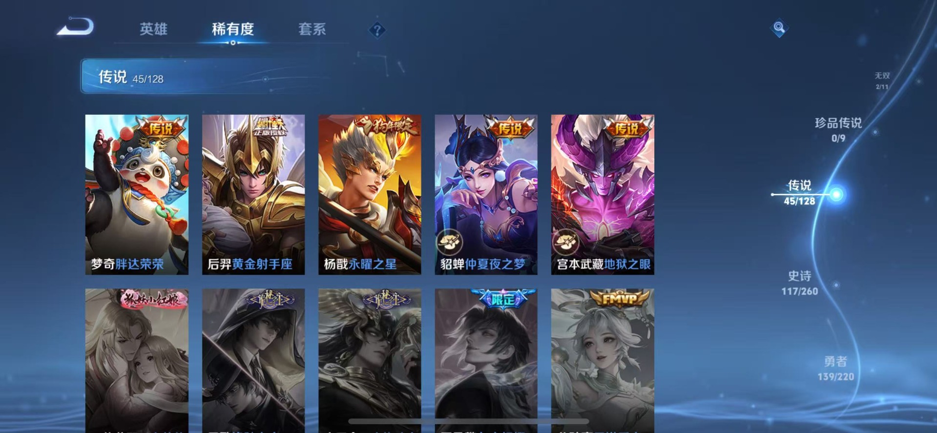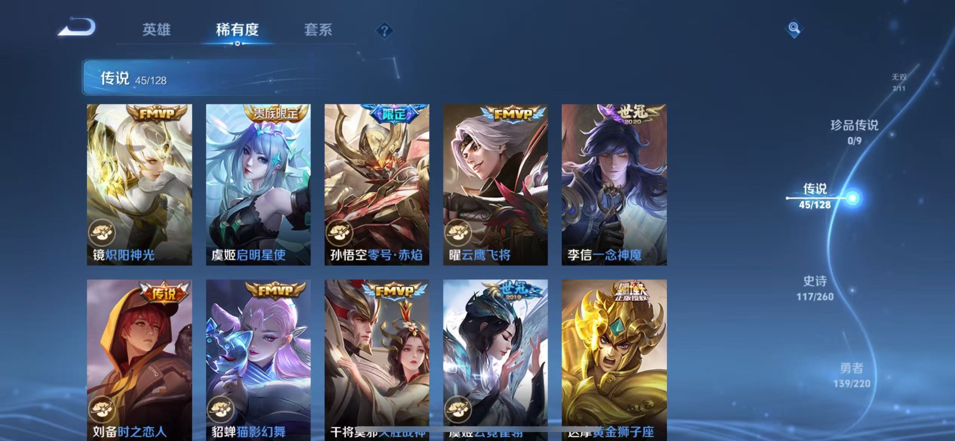 - [12223959]V8 1典藏 18传说 125英雄 349皮肤 可修改实名 优质装备:鸣剑·曳影,黄金狮子座,黄金射手座,炽阳神光,末日机甲-孙尚香(绿蚂蚱),地狱火,仲夏夜之梦(大飞蛾),胖达荣荣,时之恋人-刘备(电焊工),无双飞将,霜月吟,涂山容容 传说皮:幻光神枪 珍宝阁皮:妄想食味,胡桃夹子,女武神 限定皮:愿照·九州拓(澜年限),愿照·山河定(司空震年限),至尊宝,白虎志(电光耗子),武陵仙君(小桃花),白晶晶,时雨天司(水龙头),神威(电光马子),山海·碧波行(瑶年限),高山流水,怒海麟威,五谷丰年,梁祝,御风骁将(吕布年限),天狼狩猎者,龙胆,烈魂,天狼溯光者,李小龙,逐梦之影,朱雀志(守约年限),大圣娶亲,寅虎·心曲(虎婆),玉兔公主,山海·玄木吟(马可年限) 史诗皮:器灵·浮梦炉,星界战将,龙之律动,石田雨龙,百相守梦-周瑜,怒海争锋,蔬乡物语(鲁班七号),百相守梦-百里守约,百相守梦-黄忠,紫霞仙子,苍穹之光,白龙吟,特工魅影,千年之狐,永昼,江河有灵,魅语,百解令(蒙犽),高渐离燃音魔法,蒙恬荣光圣徽,匿光破解者,冰冠公主,偶像歌手,晚萤,电玩·爆裂旋风,猫狗日记-孙策,乱世虎臣,节奏热浪,修罗,女仆咖啡,摇滚巨星,水果甜心,天才门将,星夜王子,心灵骇客,功夫厨神,德古拉伯爵,暗隐猎兽者,幽灵船长,鬼剑武藏,地狱岩魂,纤云弄巧,繁星吟游(呼啦呼啦),拒霜思,缤纷独角兽,乘风破浪,逐浪之夏,水晶猎龙者,曙光守护者,箭羽风息,金属风暴,原初追逐者,圣诞狂欢,圣诞恋歌,鹰眼统帅,魅力维加斯,黎明之约,赏金猎手,未来纪元-赵云
