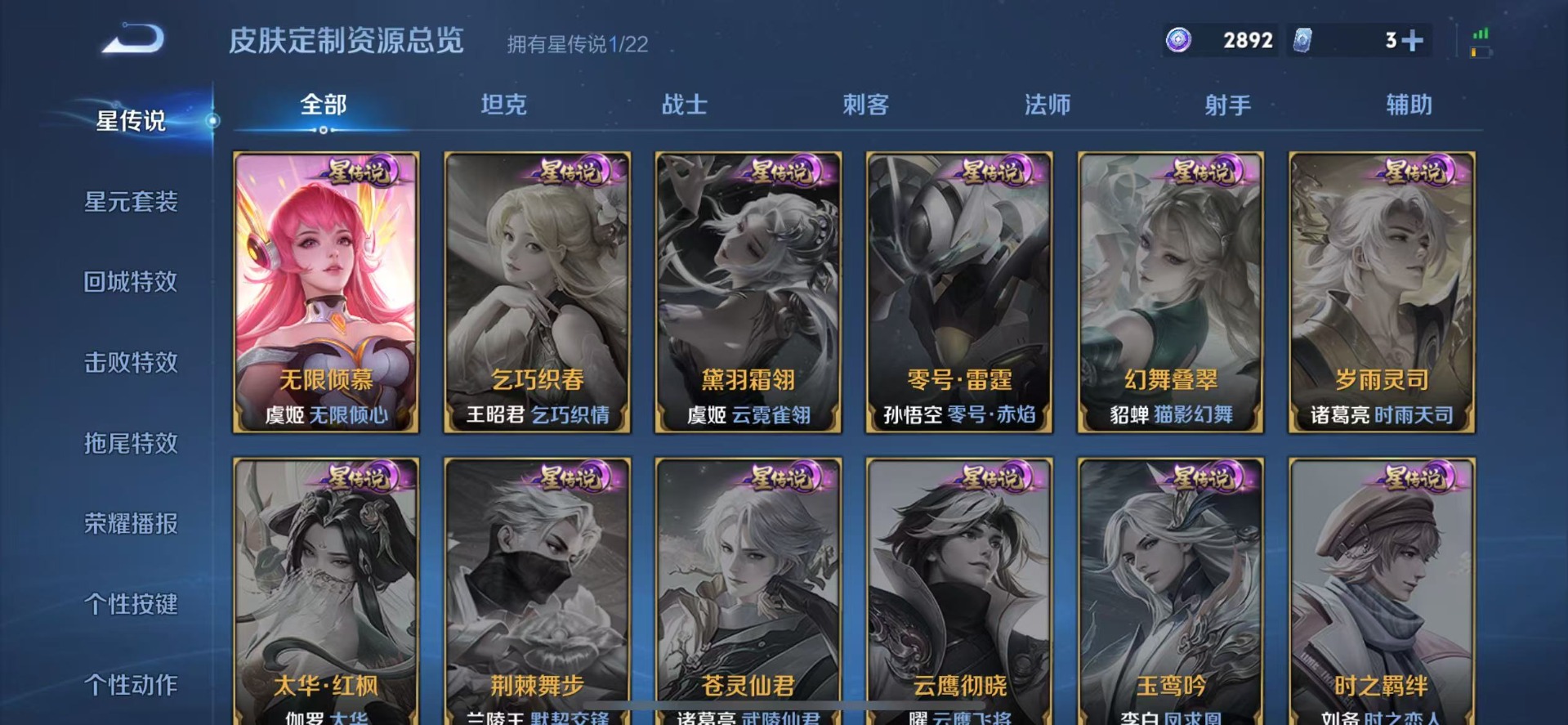 - [12323717]V8 2典藏 3无双 4珍品传说 25传说 124英雄 295皮肤 可修改实名 优质装备:杀手不太冷,神鉴启示录,离恨烟(公孙离无双),雪境奇遇-甄姬,器灵·螭龙剑,江户川柯南,怪盗基德,器灵·落星盏,黄金狮子座,云鹰飞将(小将军),猫影幻舞,久胜战神,炽阳神光,末日机甲-孙尚香(绿蚂蚱),地狱之眼,音你心动-周瑜,时之恋人-刘备(电焊工),淬星耀世,浮生妄,玄雷天君,千劫归真 珍品传说:时之奇旅-孙策 传说皮:幻光神枪,祥瑞亨通,云诺千山 珍宝阁皮:妄想食味,胡桃夹子,蔷薇恋人,女武神 限定皮:愿照·九州拓(澜年限),愿照·山河定(司空震年限),鸣野蒿,至尊宝,白虎志(电光耗子),凤求凰(白切鸡),武陵仙君(小桃花),时雨天司(水龙头),神威(电光马子),飞衡(韩信年限),瑞麟志(木兰年限),遇见飞天,高山流水,五谷丰年,冰锋战神,梁祝,天狼征服者,祈雪灵祝(雪兔子),李小龙,逐梦之影,猪悟能,大圣娶亲,匿光追影者,玉兔公主 史诗皮:器灵·浮梦炉,狼魂孤将,瑰影绮梦,茶境仙,石田雨龙,破空之剑,芈月浮光幕影,曹操夜都魔契,百相守梦-黄忠,星界战将,紫霞仙子,苍穹之光,电玩小子(小书包),白龙吟,黄金分割率,特工魅影,千年之狐,江河有灵,龙骑士(小龙虾),蒙恬荣光圣徽,晚萤,魅语,无限星赏官,冰冠公主,青蛇,偶像歌手,电玩·爆裂旋风,猫狗日记-孙策,时之恋人-孙尚香,乱世虎臣,节奏热浪,女仆咖啡,摇滚巨星,水果甜心,天才门将,星夜王子,德古拉伯爵,暗隐猎兽者,幽灵船长,鬼剑武藏,暗渊魔法,地狱岩魂,纤云弄巧,繁星吟游(呼啦呼啦),拒霜思,缤纷独角兽,乘风破浪,逐浪之夏,水晶猎龙者,箭羽风息,金属风暴,原初追逐者,圣诞狂欢,圣诞恋歌,鹰眼统帅,暗夜贵公子,魅力维加斯,黎明之约,赏金猎手,滕王阁序,无心,未来纪元-赵云