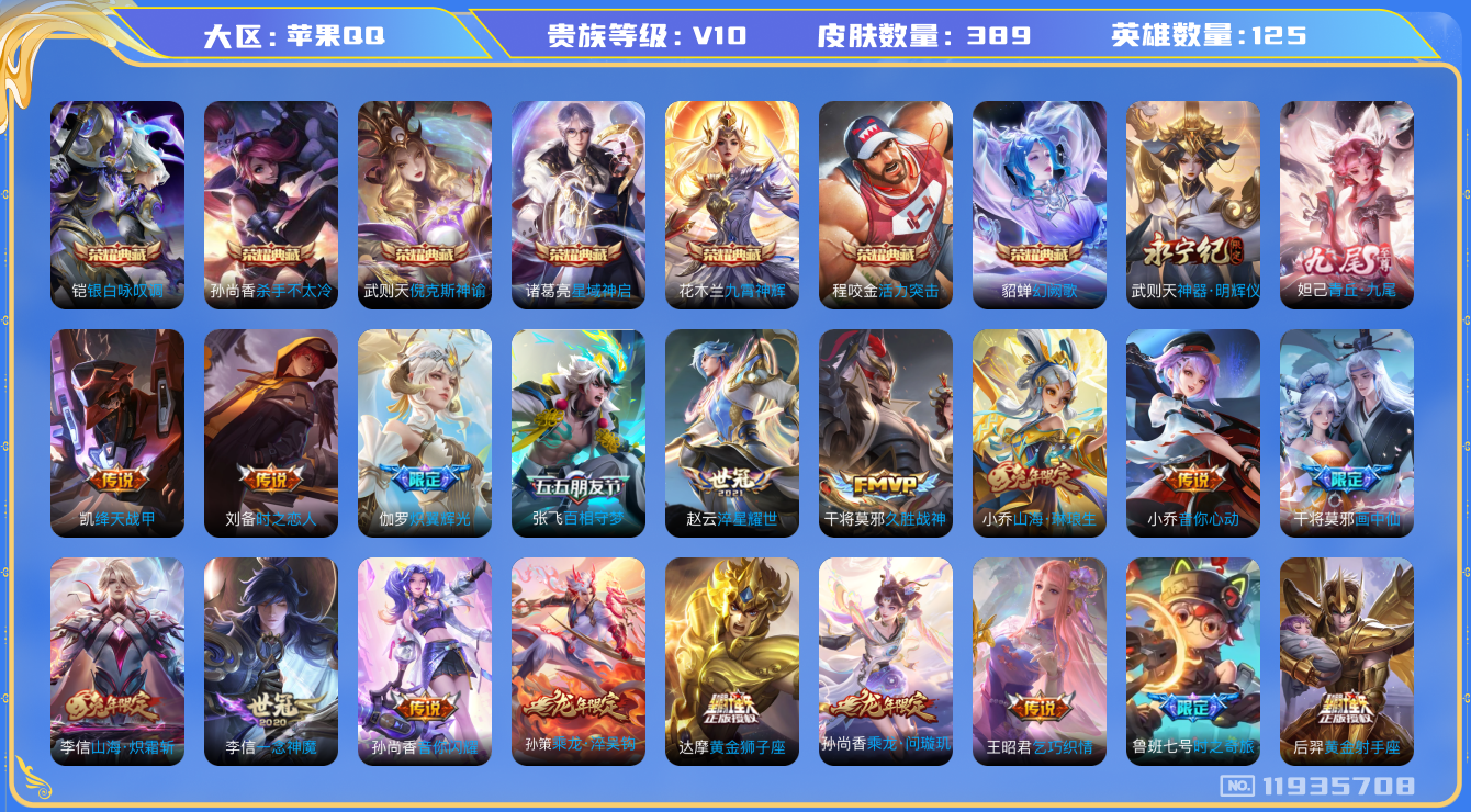 [11935708]V10 7典藏 2无双 45传说 125英雄 389皮肤 典藏英雄武则天 可修改实名 优质装备:倪克斯神谕(宇宙婆娘),活力突击,杀手不太冷,星域神启(倪克斯贼亮),九霄神辉(木兰典藏),银白咏叹调(倪克斯侍卫),幻阙歌(貂蝉典藏),神器·明辉仪,青丘·九尾(妲己无双),黄金狮子座,黄金射手座,云鹰飞将(小将军),绛天战甲(鸡嘴战神),猫影幻舞,久胜战神,炽阳神光,一念神魔,云霓雀翎,仲夏夜之梦(大飞蛾),音你心动-小乔,零号·赤焰,地狱之眼,飞鸢探春,音你心动-周瑜,胖达荣荣,乞巧织情,时之恋人-刘备(电焊工),淬星耀世,音你闪耀(rap皮),碎云,神器·明辉仪,山海·炽霜斩(李信年限),山海·琳琅生(小乔年限),山海·苍雷引(电光曜子),炽翼辉光(娃娃菜牛角包),燃星之曲,画中仙,浮生妄,青丘·九尾,百相守梦(张飞),鲁班七号-时之奇旅,艾琳觅芳踪,涂山容容 传说皮:乘龙·问璇玑(孙尚香年限),乘龙·淬吴钩(孙策年限) 珍宝阁皮:蔷薇恋人 限定皮:鸣野蒿,至尊宝,时雨天司(水龙头),神威(电光马子),山海·碧波行(瑶年限),无限倾心-项羽,至美·乘鲤谣,至美·化雀舞,遇见飞天,高山流水,诗剑行,无限倾心-虞姬,齐天大圣,怒海麟威,降魔,五谷丰年,冰锋战神,天狼运算者,游园惊梦,梁祝,龙胆,烈魂,虎魄,天狼绘梦者,李小龙,朱雀志(守约年限),永曜之星,辉光之辰,寅虎·瑞焰(虎皮蛋子),深海之息(深海大菠萝),匿光启智者,时之奇旅-妲己,神器·万象笔,山海·玄木吟(马可年限),冰霜神祇 史诗皮:石田雨龙,乘龙·忆丹青(大乔年限),遇见神鹿,紫霞仙子,苍穹之光,电玩小子(小书包),黄金分割率,特工魅影,千年之狐,永昼,江河有灵,闲日渔趣,魅语,百解令(蒙犽),高渐离燃音魔法,无限星赏官,匿光破解者,冰冠公主,青蛇,偶像歌手,白蛇,晚萤,电玩·爆裂旋风,百相守梦(刘备),暗夜猫娘,百相守梦(关羽),银翎春语,龙骑士(小龙虾),末日机甲-吕布,猫狗日记-孙策,猫狗日记-大乔,时之恋人-孙尚香,乱世虎臣,节奏热浪,修罗,女仆咖啡,摇滚巨星,水果甜心,绅士熊喵,天才门将,星夜王子,心灵骇客,时之奇旅-安琪拉,功夫厨神,德古拉伯爵,暗隐猎兽者,幽灵船长,鬼剑武藏,暗渊魔法,心灵战警,乐园奇幻夜,天秀·启明,舞动绿茵,地狱岩魂,诗语江南,纤云弄巧,繁星吟游(呼啦呼啦),拒霜思