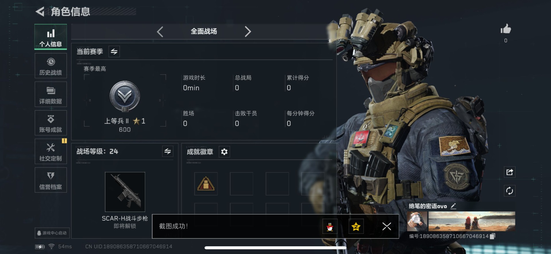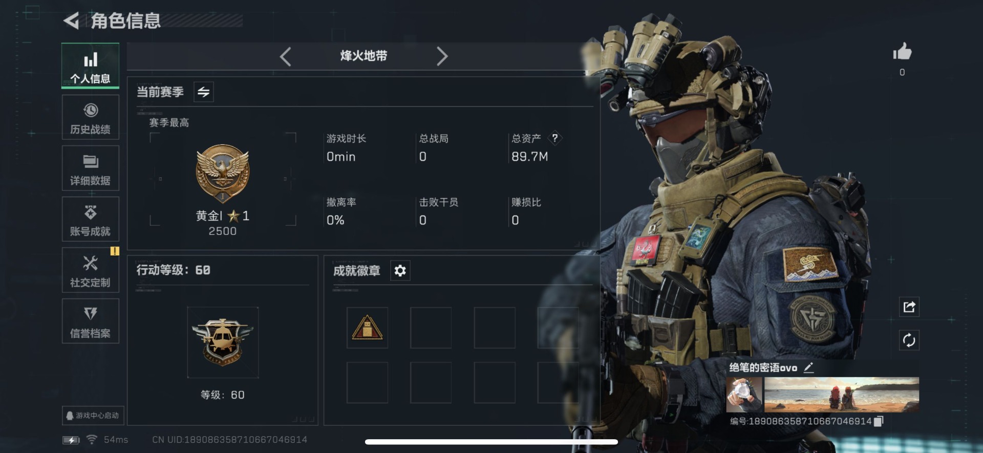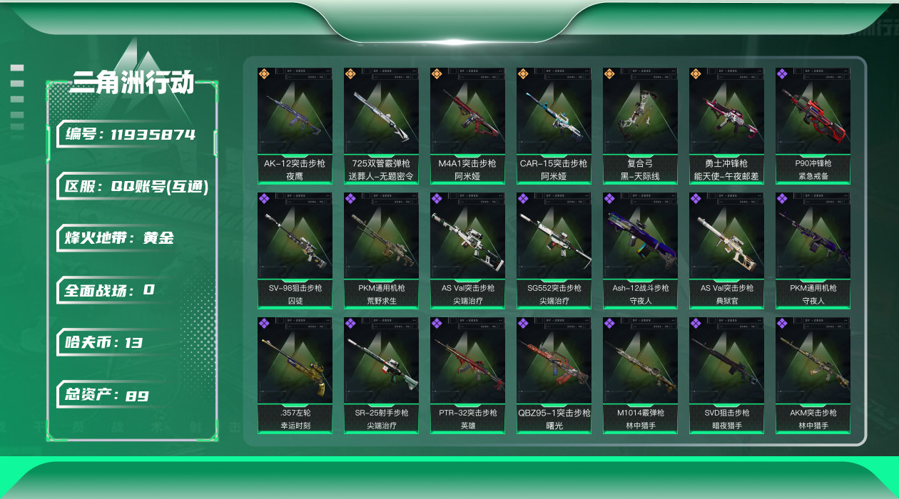 [11935874]总资产:89.7M 1干员外观 6传说枪械 哈夫币:13.743K 可二次 可修改实名 烽火地带段位:黄金 全面战场段位:上等兵 传说武器皮肤:勇士冲锋枪-能天使-午夜邮差,725双管霰弹枪-送葬人-无题密令,M4A1突击步枪-阿米娅,CAR-15突击步枪-阿米娅,复合弓-黑-天际线,AK-12突击步枪-夜鹰 史诗武器皮肤:PKM通用机枪-守夜人,M1014霰弹枪-林中猎手,PSG-1射手步枪-无垢,SCAR-H战斗步枪-囚徒,SV-98狙击步枪-囚徒,SV-98狙击步枪-林中猎手,AS Val突击步枪-典狱官,PTR-32突击步枪-英雄,PKM通用机枪-荒野求生,P90冲锋枪-紧急戒备,M16A4突击步枪-竞赛选手,SVD狙击步枪-暗夜猎手,AS Val突击步枪-尖端治疗,SG552突击步枪-尖端治疗,QBZ95-1突击步枪-曙光,Ash-12战斗步枪-守夜人,SR-25射手步枪-尖端治疗,AKM突击步枪-林中猎手,.357左轮-幸运时刻 干员外观:无名-夜鹰