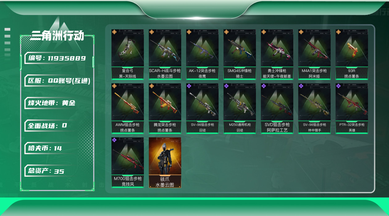 [11935889]总资产:35.1M 1干员外观 9传说枪械 哈夫币:14.752K 可二次 可修改实名 烽火地带段位:黄金 全面战场段位:无段位 传说武器皮肤:SCAR-H战斗步枪-水墨云图,93R-捞点薯条,勇士冲锋枪-能天使-午夜邮差,AWM狙击步枪-捞点薯条,腾龙突击步枪-捞点薯条,M4A1突击步枪-阿米娅,复合弓-黑-天际线,SMG45冲锋枪-骑士,AK-12突击步枪-夜鹰 史诗武器皮肤:SV-98狙击步枪-囚徒,SV-98狙击步枪-林中猎手,PTR-32突击步枪-英雄,M250通用机枪-囚徒,SVD狙击步枪-阿萨拉工艺,M700狙击步枪-竞技风 干员外观:骇爪-水墨云图