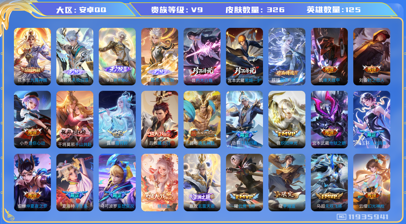 [11935941]V9 1典藏 3无双 3珍品传说 33传说 125英雄 326皮肤 可修改实名 优质装备:九霄神辉(木兰典藏),碎月剑心(李白无双),器灵·螭龙剑,天机白泽,器灵·落星盏,朽木白哉,黑崎一护,云鹰飞将(小将军),绛天战甲(鸡嘴战神),炽阳神光,仲夏夜之梦(大飞蛾),音你心动-小乔,地狱之眼,李逍遥,时之恋人-刘备(电焊工),无双飞将,浮生妄,妄想实况,遇见神鼓,霜月吟,玄雷天君,千劫归真,千山共赴,涂山容容 传说皮:吕布曦玄引,续相思,星之鸣奏,幻光神枪 珍宝阁皮:万物之道,蔷薇恋人,女武神 限定皮:愿照·九州拓(澜年限),愿照·福禄聚(蔡文姬年限),愿照·岁时盈(虞姬年限),愿照·山河定(司空震年限),愿照·众生和(妲己年限),愿照·千秋盛(女娲年限),鸣野蒿,至尊宝,傲雪梅枪,绯月行,神威(电光马子),至美·乘鲤谣,高山流水,诗剑行,五谷丰年,青龙志(铠年限),幽恒(沐浴露),武圣,梁祝,祈雪灵祝(雪兔子),逐梦之影,辉光之辰,孙行者,猪悟能,蜜橘之夏,寅虎·赤拳(老虎年限),冰霜神祇 史诗皮:鸭鸭历险记-刘禅,器灵·浮梦炉,糖绘人间,化蝶舞,龙之律动,茶境仙,幻珠鲛人,涂山红红,东方月初,琥珀纪元伽罗,百相守梦-黄忠,织梦人,遇见神鹿,紫霞仙子,苍穹之光,电玩小子(小书包),白龙吟,黄金分割率,特工魅影,千年之狐,江河有灵,鹤归松栖(赵怀真),百解令(蒙犽),冰冠公主,偶像歌手,晚萤,电玩·爆裂旋风,百相守梦(刘备),猫狗日记-孙策,猫狗日记-大乔,乱世虎臣,节奏热浪,修罗,女仆咖啡,摇滚巨星,水果甜心,绅士熊喵,天才门将,星夜王子,时之奇旅-安琪拉,功夫厨神,德古拉伯爵,暗隐猎兽者,幽灵船长,鬼剑武藏,天秀·启明,舞动绿茵,地狱岩魂,诗语江南,纤云弄巧,拒霜思,缤纷独角兽,乘风破浪,逐浪之夏,水晶猎龙者,金属风暴,圣诞狂欢,圣诞恋歌,鹰眼统帅,魅力维加斯,未来纪元-赵云