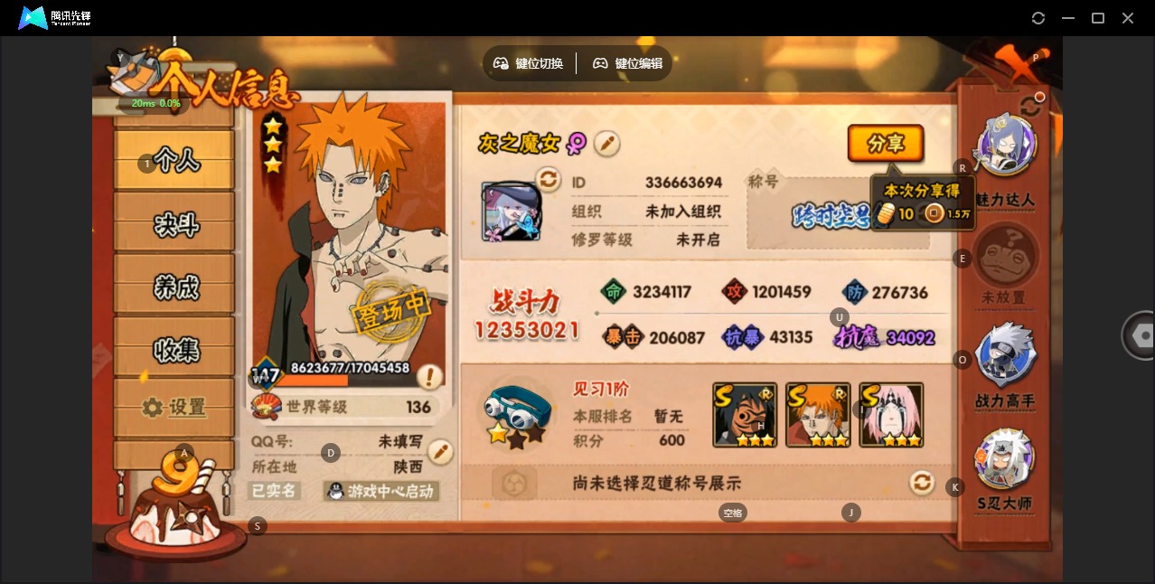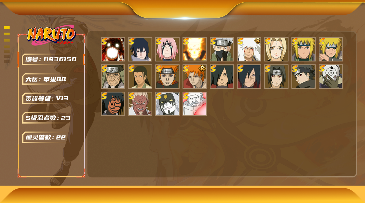 [11936150]V13 23S忍 43A忍 22通灵 1235.3W战力 可二次 可修改实名 优质装备:佩恩·天道「超」,波风水门「秽土转生」,猿飞日斩「秽土转生」,宇智波斑,“宇智波斑” 「白面具」,漩涡鸣人 「九喇嘛连结」,大筒木金式「博人传」,春野樱 「忍界大战」,神秘面具男 「红夜之刃」,宇智波佐助「永恒万花筒」,千手柱间·木叶创立,宇智波斑「秽土转生·解」,大筒木桃式,艾「忍界大战」,宇智波止水「须佐能乎」,旗木卡卡西「须佐能乎」,漩涡鸣人 「暴怒·第六尾」 S级忍者:自来也 「舞之豪杰」,宇智波鼬 「须佐能乎」,佩恩「天道」,波风水门,纲手