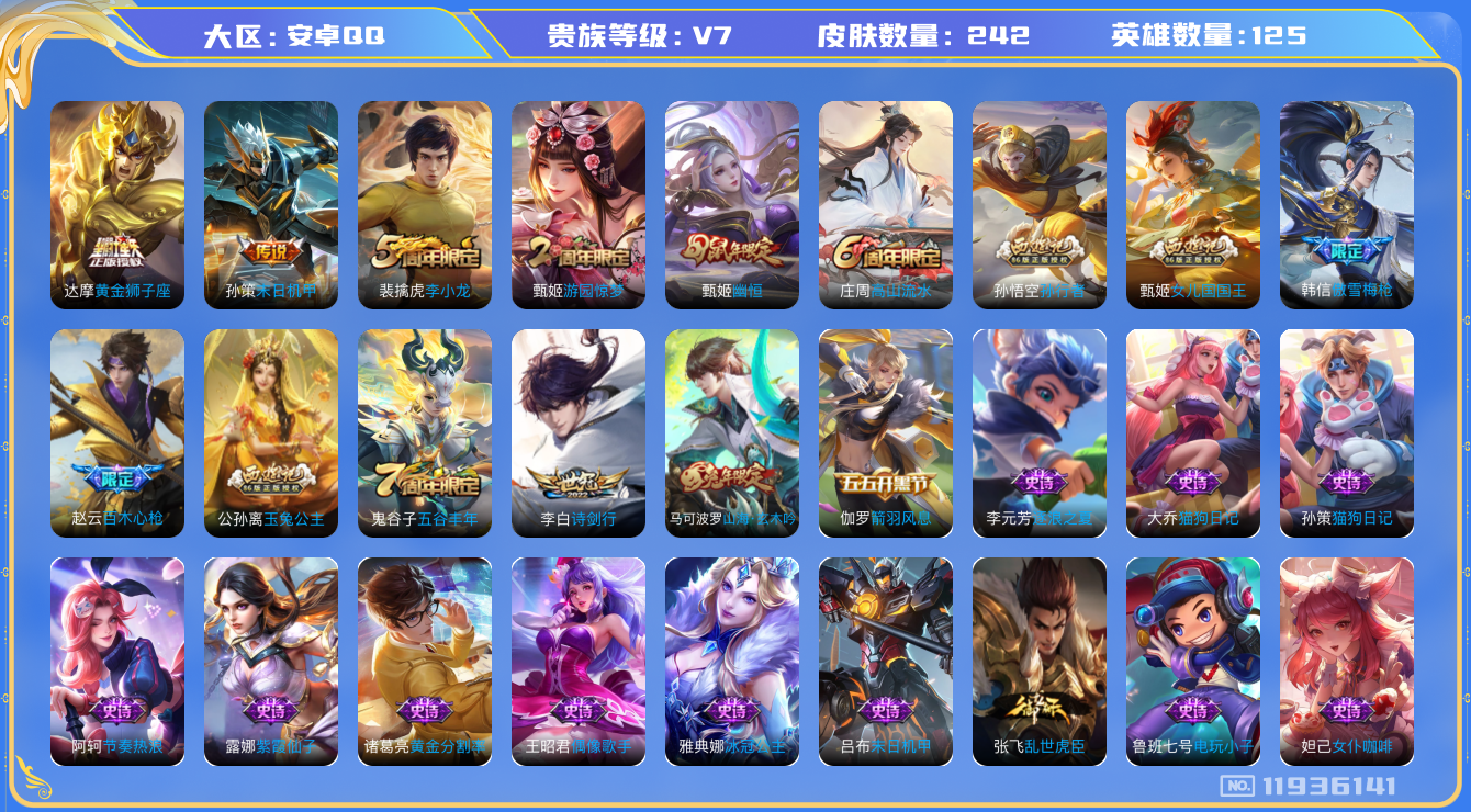 [11936141]【商品标题】:安卓Q-V7-永恒钻石V段位-125英雄-242皮肤-0典藏-0珍品无双-0无双-0珍品传说-3传说-73史诗