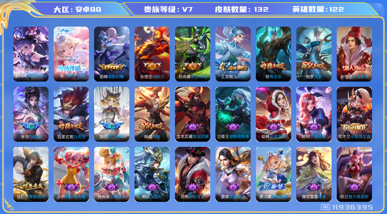 [11936395]V7 2珍品传说 5传说 122英雄 132皮肤 可修改实名 优质装备:酷洛米之心,大耳狗之梦,猫影幻舞,末日机甲-孙尚香(绿蚂蚱),地狱火 限定皮:白虎志(电光耗子),太华(伽罗年限),时之彼端,白晶晶,飞衡(韩信年限),青龙志(铠年限),梁祝,大圣娶亲 史诗皮:鸭鸭历险记-刘禅,龙之律动,紫霞仙子,白龙吟,黄金分割率,晚萤,节奏热浪,水果甜心,暗隐猎兽者,鬼剑武藏,繁星吟游(呼啦呼啦),缤纷独角兽,水晶猎龙者,圣诞狂欢,圣诞恋歌,鹰眼统帅,魅力维加斯