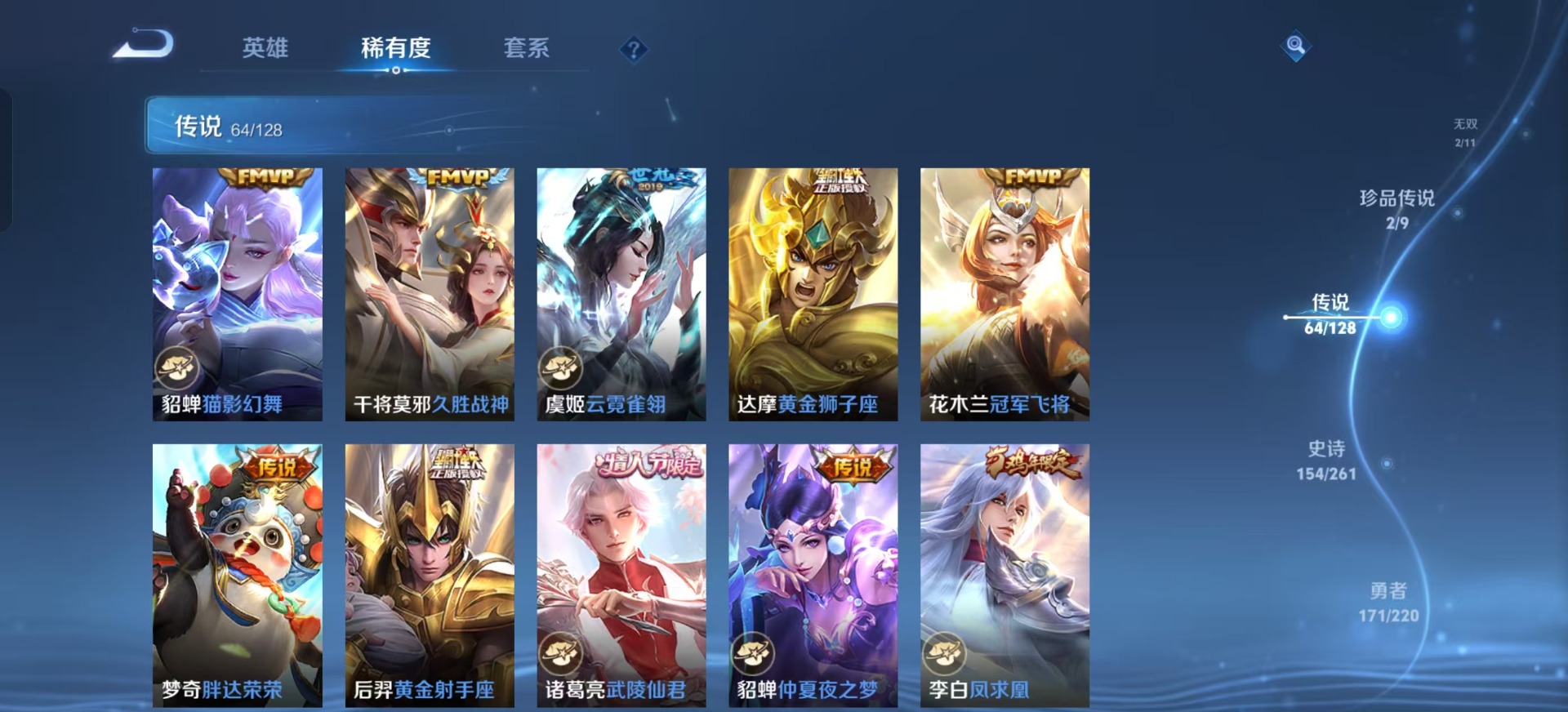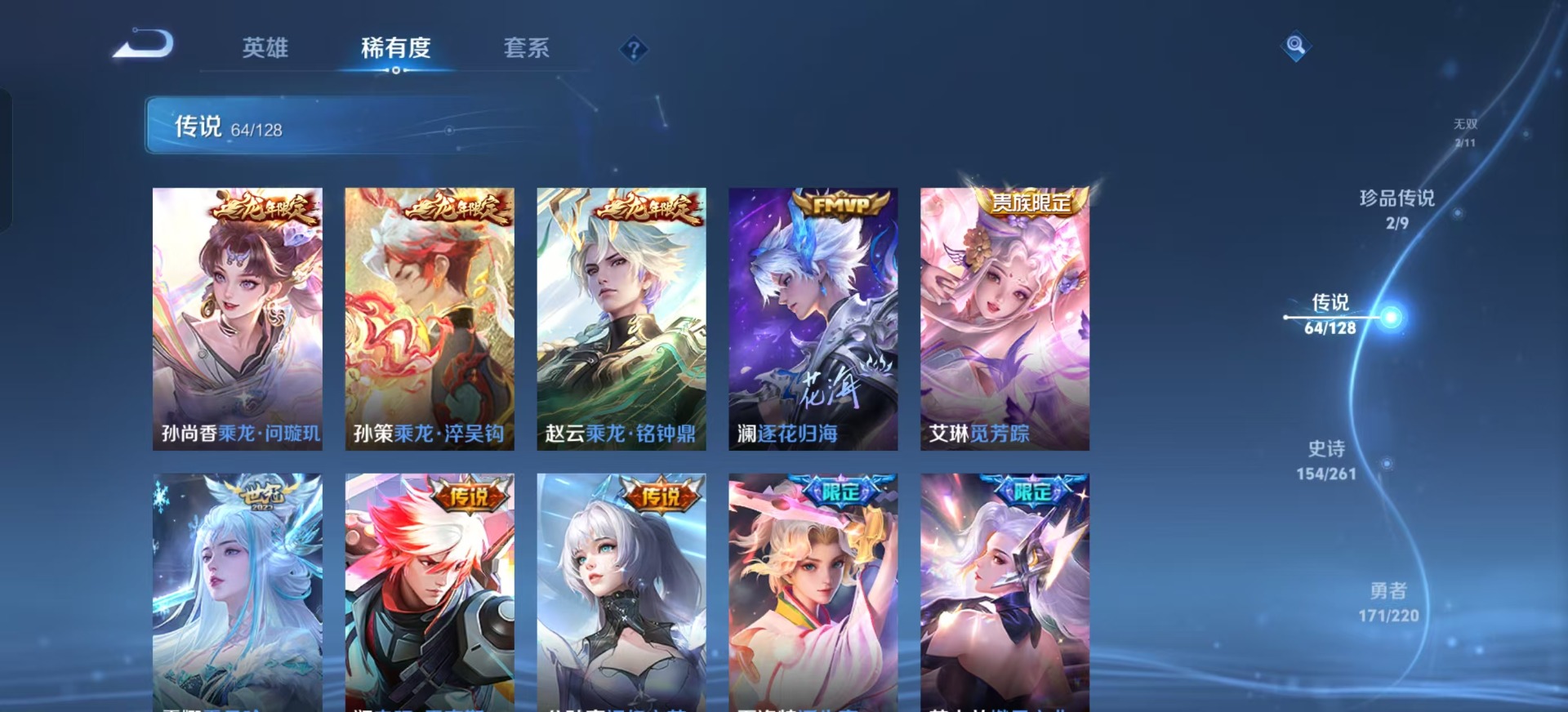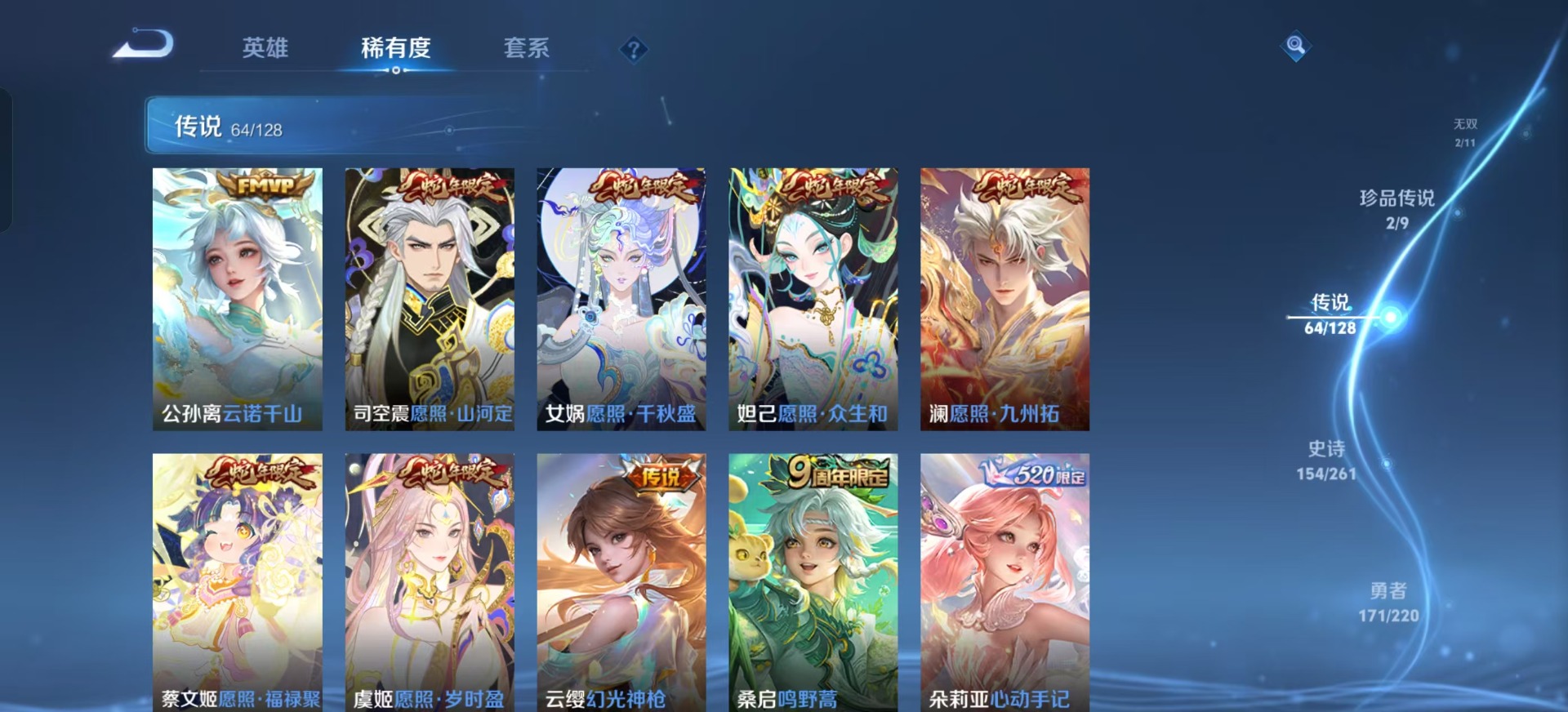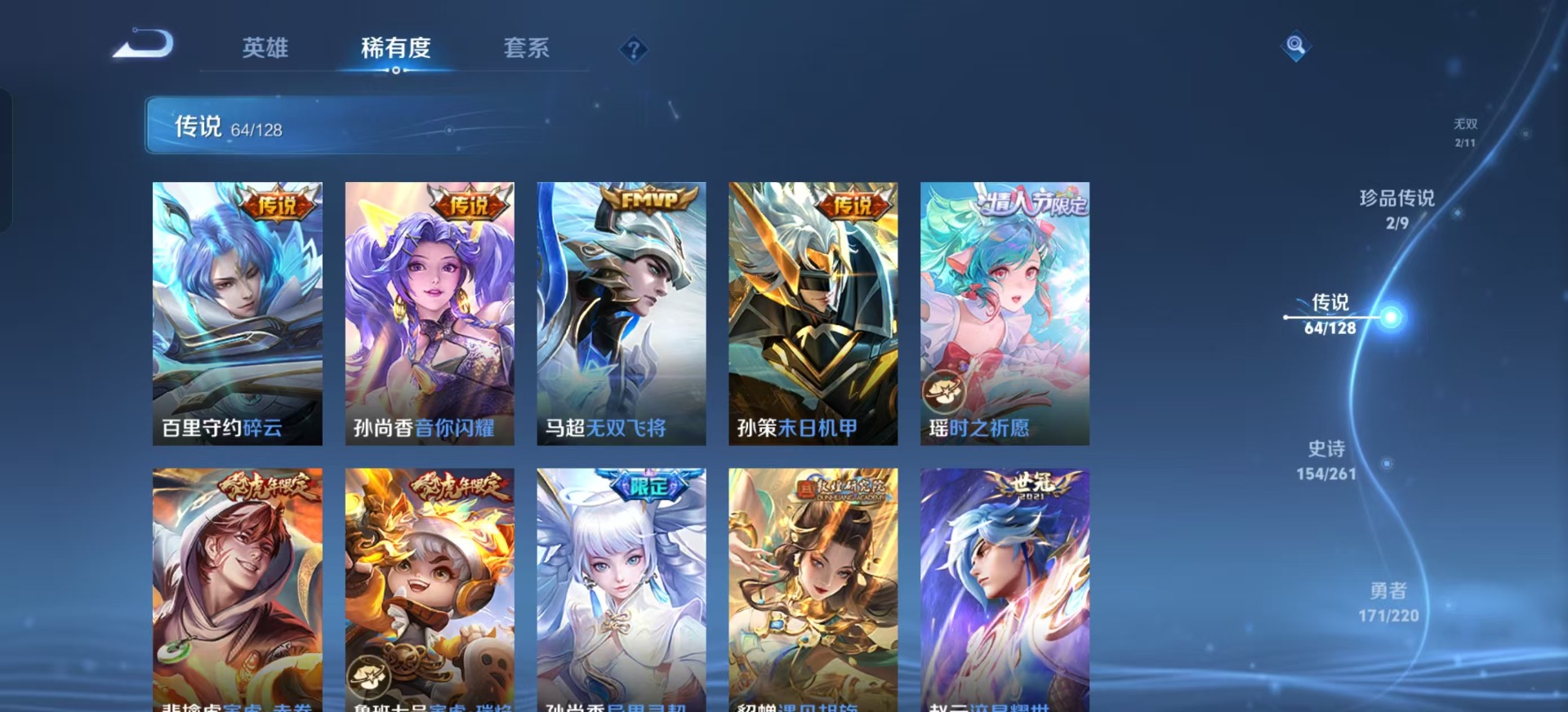 - [12022944]V7 1典藏 4传说 123英雄 273皮肤 可修改实名 曹操小国标 优质装备:大秦宣太后,冠军飞将,零号·赤焰,胖达荣荣 珍宝阁皮:妄想食味 限定皮:逐霄战戟,鸣野蒿,梅西,神威(电光马子),飞衡(韩信年限),瑞麟志(木兰年限),遇见飞天,高山流水,李小龙,朱雀志(守约年限),辉光之辰,霸王别姬-虞姬,默契交锋-花木兰,猪悟能,青春决赛季,美猴王 史诗皮:鸭鸭历险记-刘禅,星界战将,谪仙醉月,布丁狗之誓,石田雨龙,破空之剑,百相守梦-百里守约,白龙吟,黄金分割率,千年之狐,永昼,魅语,蒙恬荣光圣徽,青蛇,偶像歌手,暗夜猫娘,末日机甲-吕布,猫狗日记-孙策,猫狗日记-大乔,乱世虎臣,修罗,女仆咖啡,水果甜心,天才门将,功夫厨神,德古拉伯爵,暗隐猎兽者,幽灵船长,鬼剑武藏,暗渊魔法,心灵战警,天秀·启明,舞动绿茵,地狱岩魂,纤云弄巧,缤纷独角兽,乘风破浪,逐浪之夏,水晶猎龙者,原初追逐者,圣诞狂欢,圣诞恋歌,鹰眼统帅,魅力维加斯,黎明之约,无心,未来纪元-赵云