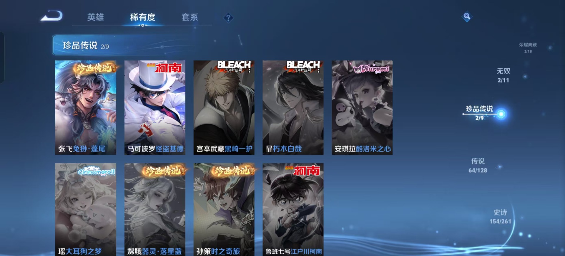 - [11734450]V6 1珍品传说 4传说 124英雄 165皮肤 可修改实名 优质装备:江户川柯南,黄金射手座 传说皮:乘龙·问璇玑(孙尚香年限) 珍宝阁皮:胡桃夹子 限定皮:愿照·九州拓(澜年限),鸣野蒿,至尊宝,李小龙,猪悟能 史诗皮:鸭鸭历险记-刘禅,星界战将,龙之律动,炽弈燎原,破空之剑,东方月初,埋骨钱,琥珀纪元伽罗,百相守梦-百里守约,星界特工,紫霞仙子,特工魅影,千年之狐,晚萤,龙骑士(小龙虾),节奏热浪,修罗,女仆咖啡,摇滚巨星,水果甜心,星夜王子,德古拉伯爵,暗隐猎兽者,幽灵船长,鬼剑武藏,心灵战警,舞动绿茵,诗语江南,纤云弄巧,乘风破浪,逐浪之夏,水晶猎龙者,曙光守护者,圣诞狂欢,鹰眼统帅