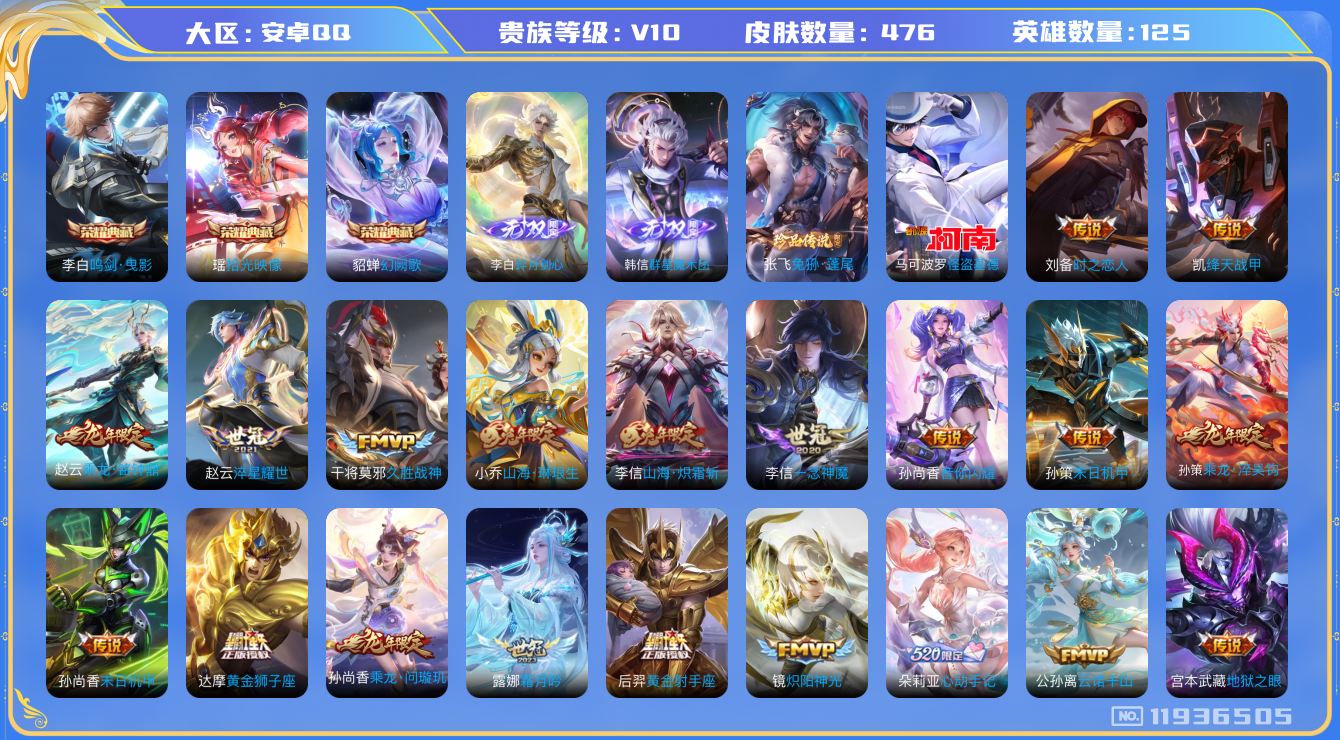 [11936505]V10 3典藏 2无双 2珍品传说 64传说 125英雄 476皮肤 可修改实名 优质装备:鸣剑·曳影,幻阙歌(貂蝉典藏),碎月剑心(李白无双),韩信群星魔术团(韩信无双),拾光映像(瑶典藏),怪盗基德,黄金狮子座,黄金射手座,冠军飞将,云鹰飞将(小将军),绛天战甲(鸡嘴战神),猫影幻舞,久胜战神,炽阳神光,一念神魔,云霓雀翎,末日机甲-孙尚香(绿蚂蚱),地狱火,仲夏夜之梦(大飞蛾),零号·赤焰,地狱之眼,胖达荣荣,时之恋人-刘备(电焊工),游龙清影(小青龙),淬星耀世,超时空战士-狄仁杰,遇见胡旋,末日机甲-孙策,无双飞将,音你闪耀(rap皮),碎云,山海·炽霜斩(李信年限),山海·琳琅生(小乔年限),山海·苍雷引(电光曜子),燃星之曲,浮生妄,记忆之芯(机甲兔),电玩·雷克斯,霜月吟,澜逐花归海,艾琳觅芳踪,朵莉亚心动手记,涂山容容 珍品传说:兔狲·蓬尾 传说皮:乘龙·问璇玑(孙尚香年限),乘龙·铭钟鼎(赵云年限),乘龙·淬吴钩(孙策年限),云诺千山,幻光神枪 珍宝阁皮:妄想食味,蔷薇恋人,女武神 限定皮:愿照·九州拓(澜年限),愿照·福禄聚(蔡文姬年限),愿照·岁时盈(虞姬年限),愿照·山河定(司空震年限),愿照·众生和(妲己年限),愿照·千秋盛(女娲年限),鸣野蒿,至尊宝,凤求凰(白切鸡),武陵仙君(小桃花),异界灵契(白毛香),傲雪梅枪,寅虎·展翼(孙膑年限),星穹之声,绯月行,白晶晶,时雨天司(水龙头),神威(电光马子),飞衡(韩信年限),山海·碧波行(瑶年限),无限倾心-项羽,遇见飞天,高山流水,诗剑行,无限倾心-虞姬,齐天大圣,怒海麟威,五谷丰年,青龙志(铠年限),冰锋战神,天狼运算者,游园惊梦,梁祝,御风骁将(吕布年限),天狼狩猎者,天狼溯光者,祈雪灵祝(雪兔子),天狼绘梦者,李小龙,逐梦之影,如梦令-嫦娥,如梦令-后羿,圣诞老人,孙行者,一生所爱,大圣娶亲,青春决赛季,乒乒小将,蜜橘之夏,神奇女侠,匿光追影者,寅虎·御盾(廉颇年限),寅虎·瑞焰(虎皮蛋子),寅虎·心曲(虎婆),寅虎·赤拳(老虎年限),时之祈愿-瑶(瑶传限),玉兔公主,山海·玄木吟(马可年限) 史诗皮:器灵·浮梦炉,化蝶舞,灵蛊蚀心,星界战将,谪仙醉月,龙之律动,石田雨龙,茶境仙,破空之剑,海诺心动手记,琥珀纪元伽罗,蔬乡物语(鲁班七号),超元猎域,乘龙·聚宝船(安琪拉年限),