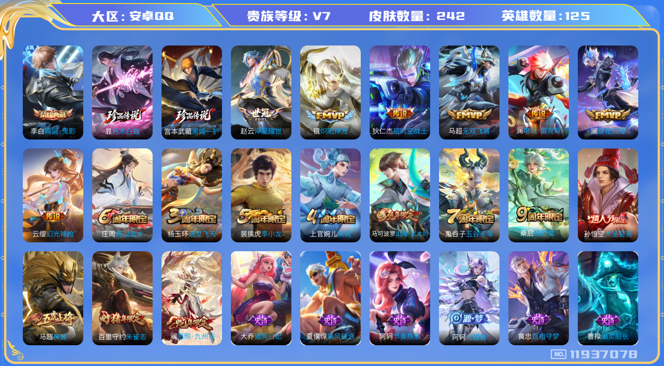 [11937078]V7 1典藏 2珍品传说 9传说 125英雄 242皮肤 可修改实名 优质装备:鸣剑·曳影,朽木白哉,黑崎一护,炽阳神光,淬星耀世,超时空战士-狄仁杰,无双飞将,电玩·雷克斯,澜逐花归海,涂山容容 传说皮:幻光神枪 珍宝阁皮:万物之道,优雅恋人,玩趣恶龙 限定皮:愿照·九州拓(澜年限),鸣野蒿,神威(电光马子),遇见飞天,高山流水,五谷丰年,梁祝,李小龙,朱雀志(守约年限),大圣娶亲,山海·玄木吟(马可年限) 史诗皮:化蝶舞,灵蛊蚀心,星界战将,龙之律动,石田雨龙,破空之剑,蒙犽顽岩魄,百相守梦-黄忠,紫霞仙子,电玩小子(小书包),特工魅影,千年之狐,江河有灵,真我赫兹(镜),魅语,百解令(蒙犽),蒙恬荣光圣徽,冰冠公主,末日机甲-吕布,猫狗日记-大乔,时之恋人-孙尚香,乱世虎臣,节奏热浪,修罗,摇滚巨星,水果甜心,绅士熊喵,星夜王子,暗隐猎兽者,幽灵船长,鬼剑武藏,心灵战警,地狱岩魂,纤云弄巧,缤纷独角兽,乘风破浪,逐浪之夏,水晶猎龙者,金属风暴,原初追逐者,圣诞狂欢,圣诞恋歌,鹰眼统帅,魅力维加斯,黎明之约,赏金猎手,无心,未来纪元-赵云