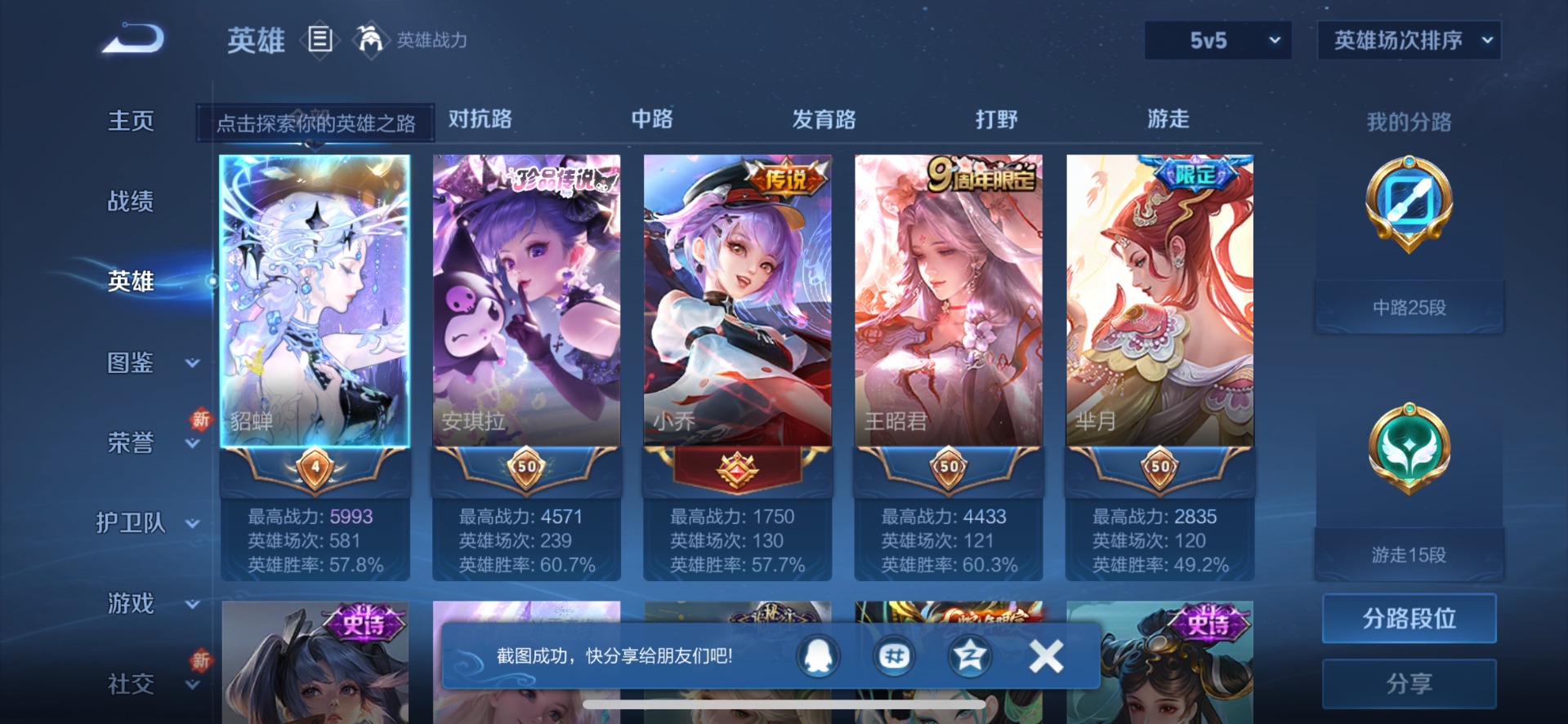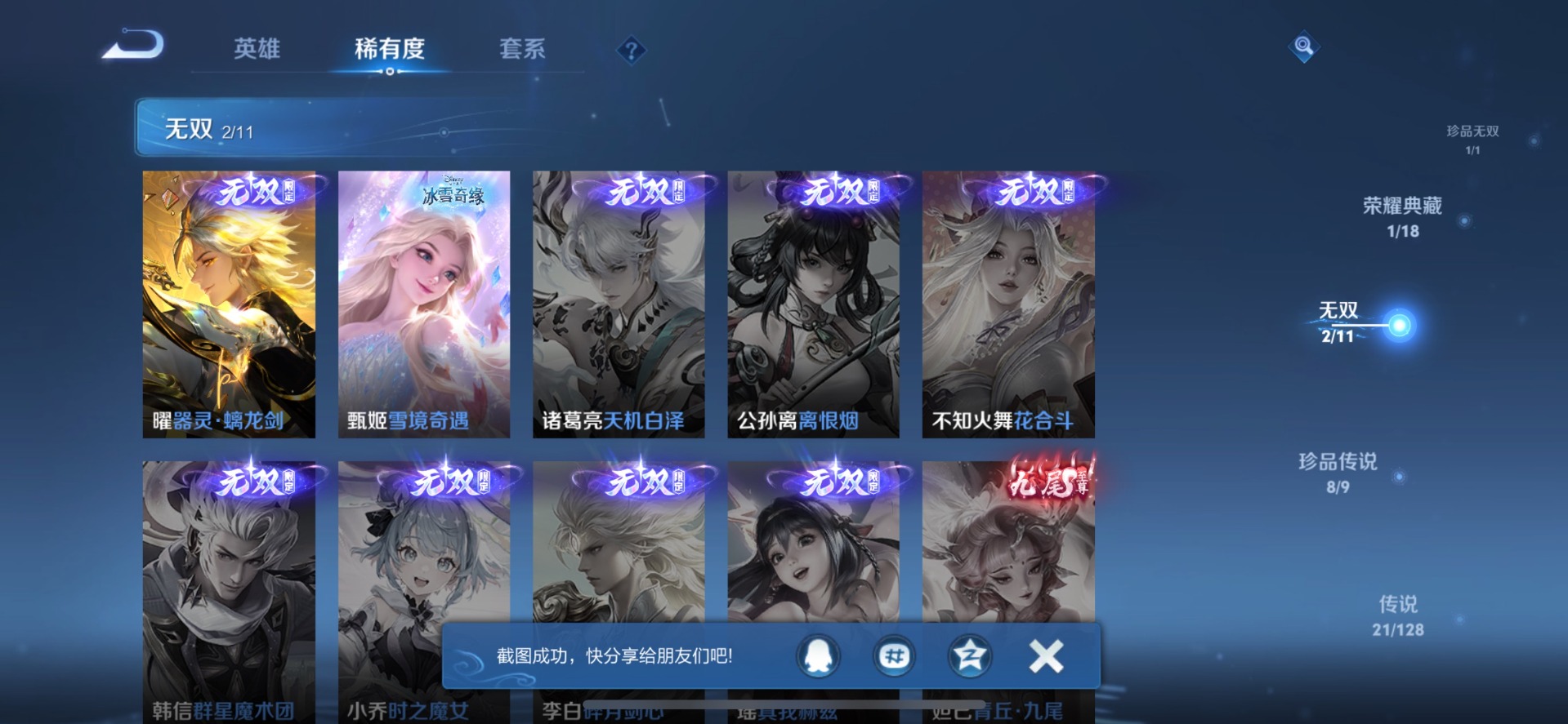- [11596520]V5 5传说 119英雄 100皮肤 可修改实名 优质装备:末日机甲-孙尚香(绿蚂蚱),无双飞将,澜逐花归海,涂山容容 珍宝阁皮:玩趣恶龙 限定皮:愿照·九州拓(澜年限),鸣野蒿,梁祝,孙行者 史诗皮:化蝶舞,星界战将,龙之律动,东方月初,蒙犽顽岩魄,埋骨钱,百相守梦-黄忠,特工魅影,江河有灵,魅语,蒙恬荣光圣徽,乱世虎臣,节奏热浪,摇滚巨星,天才门将,星夜王子,德古拉伯爵,鬼剑武藏,暗渊魔法,地狱岩魂,拒霜思,水晶猎龙者,曙光守护者,金属风暴,圣诞恋歌,鹰眼统帅,魅力维加斯