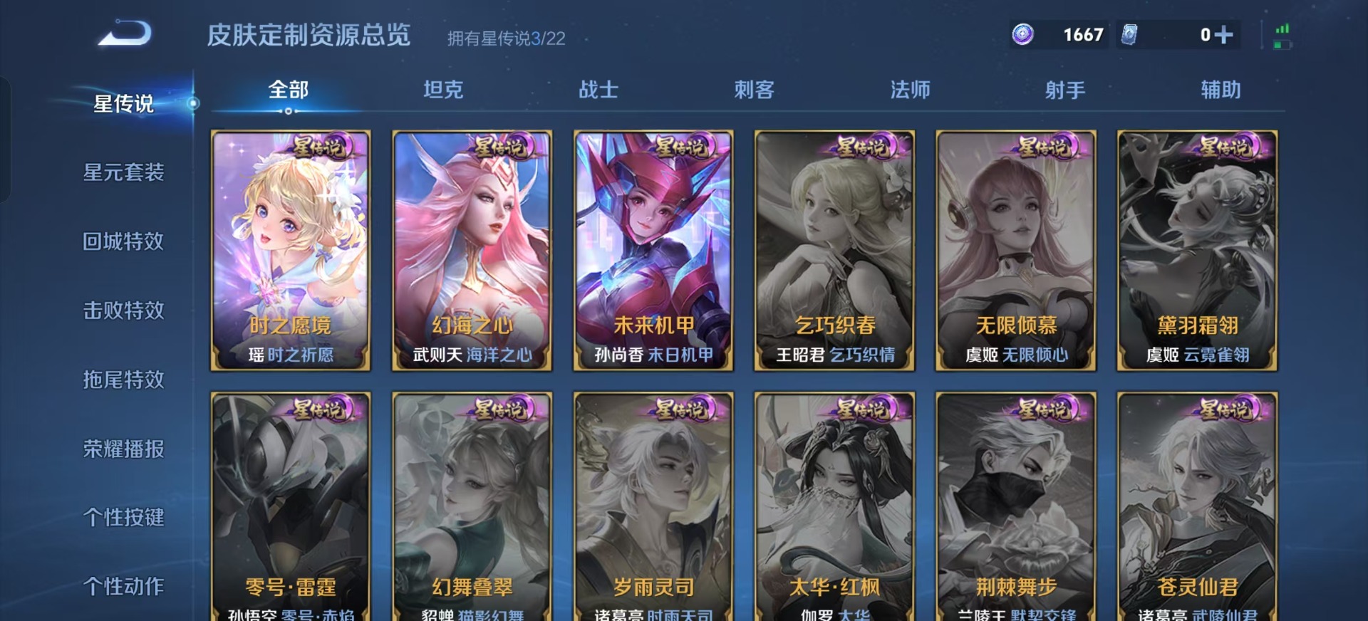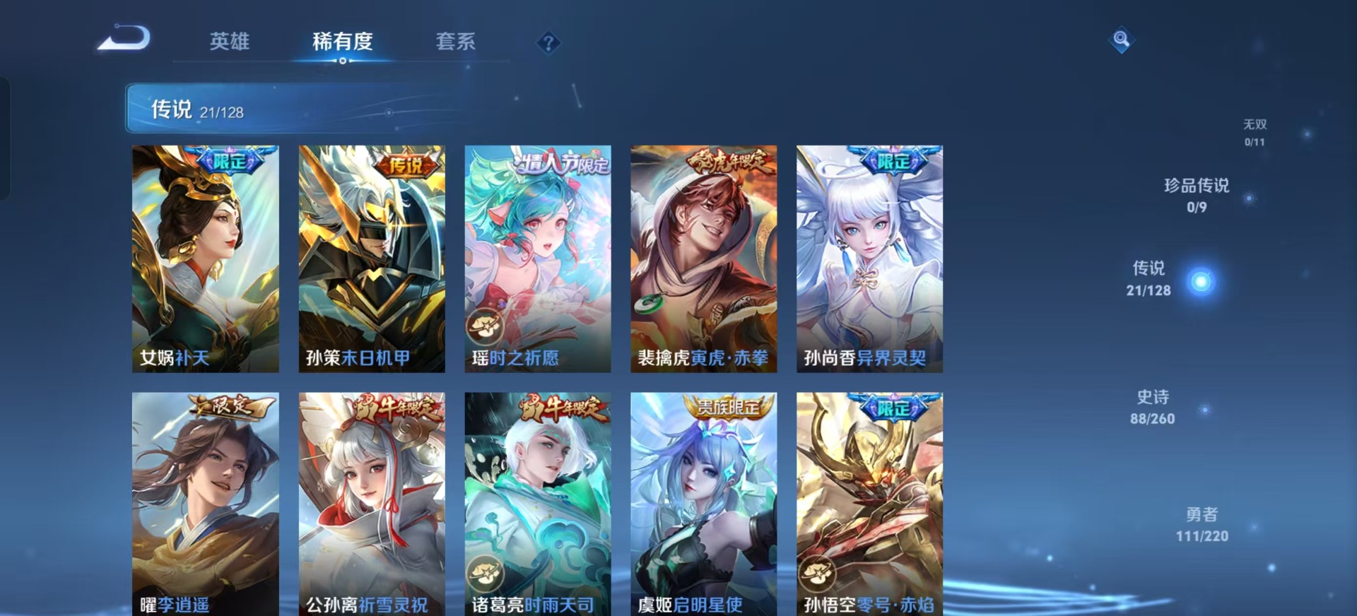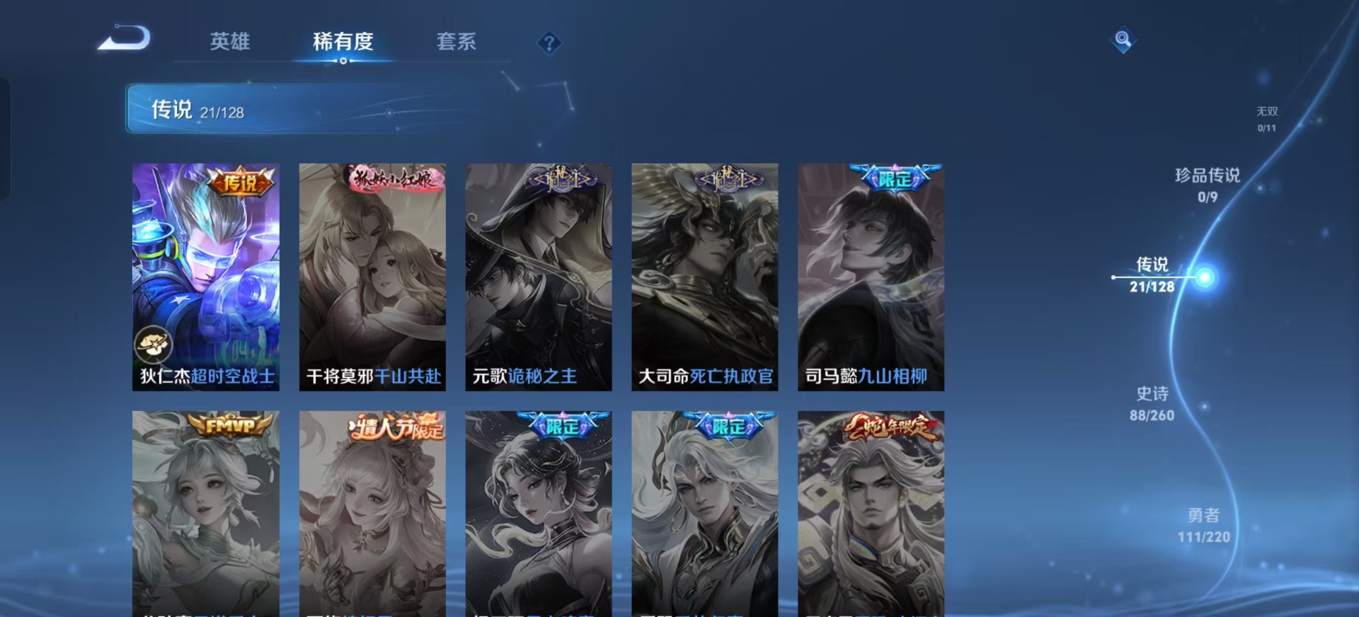 - [11795768]猴子典藏,久胜,紫霞,-可二次-108英雄-165皮肤-1典藏-7传说-31史诗 辉光之辰-后羿 街头霸王-韩信