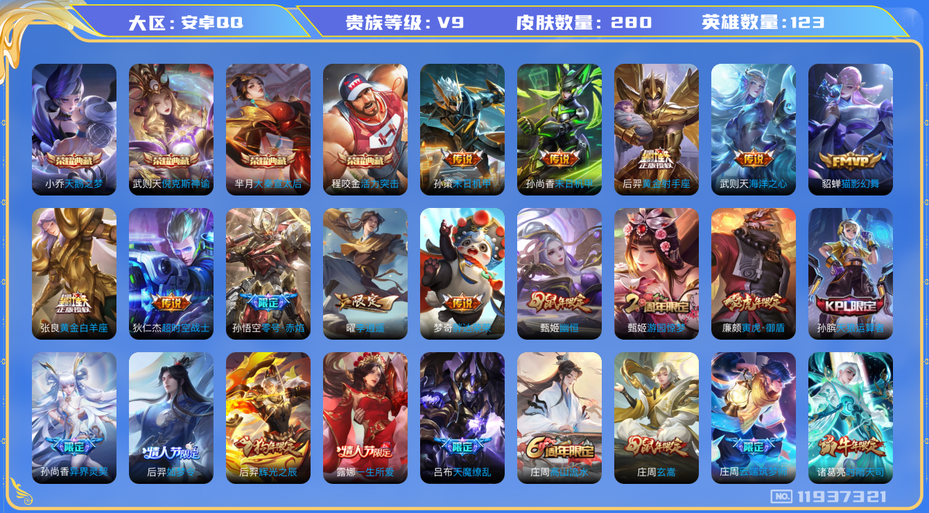 [11937321]V9 4典藏 21传说 123英雄 280皮肤 典藏英雄武则天 可修改实名 优质装备:天鹅之梦(小乔典藏),倪克斯神谕(宇宙婆娘),活力突击,大秦宣太后,黄金射手座,黄金白羊座,猫影幻舞,末日机甲-孙尚香(绿蚂蚱),零号·赤焰,海洋之心,胖达荣荣,李逍遥,超时空战士-狄仁杰,末日机甲-孙策 珍宝阁皮:蔷薇恋人,女武神 限定皮:梅西,武陵仙君(小桃花),异界灵契(白毛香),补天,时之彼端,白晶晶,时雨天司(水龙头),神威(电光马子),玄嵩(庄周年限),遇见飞天,高山流水,五谷丰年,幽恒(沐浴露),武圣,天狼运算者,游园惊梦,梁祝,逐梦之星,逐梦之音,祈雪灵祝(雪兔子),李小龙,逐梦之影,永曜之星,辉光之辰,如梦令-嫦娥,如梦令-后羿,霸王别姬-虞姬,猪悟能,一生所爱,天魔缭乱,青春决赛季,云端筑梦师,蜜橘之夏,美猴王,寅虎·御盾(廉颇年限),寅虎·心曲(虎婆),寅虎·赤拳(老虎年限),时之祈愿-瑶(瑶传限),玉兔公主 史诗皮:紫霞仙子,苍穹之光,电玩小子(小书包),江河有灵,无限星赏官,冰冠公主,偶像歌手,白蛇,晚萤,暗夜猫娘,猫狗日记-孙策,乱世虎臣,节奏热浪,女仆咖啡,摇滚巨星,水果甜心,天才门将,星夜王子,心灵骇客,德古拉伯爵,幽灵船长,鬼剑武藏,心灵战警,舞动绿茵,地狱岩魂,诗语江南,纤云弄巧,繁星吟游(呼啦呼啦),拒霜思,缤纷独角兽,乘风破浪,逐浪之夏,水晶猎龙者,曙光守护者,箭羽风息,金属风暴,原初追逐者,鹰眼统帅,暗夜贵公子,魅力维加斯,黎明之约,赏金猎手,天秀·音浪,寅虎·御盾,无心,未来纪元-赵云